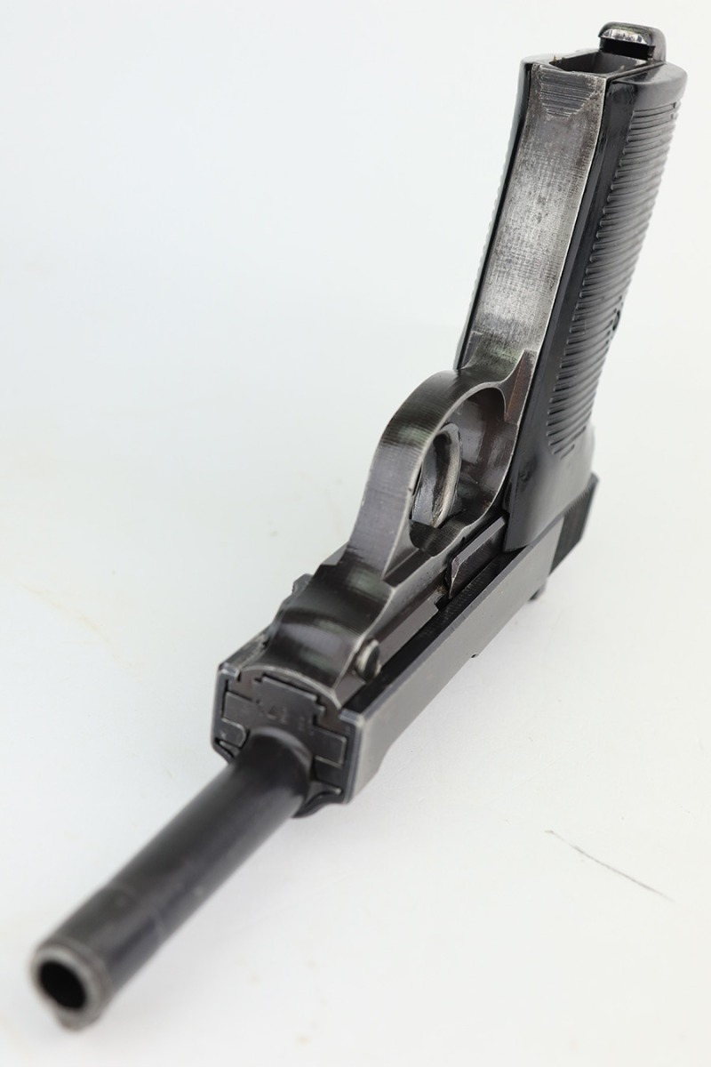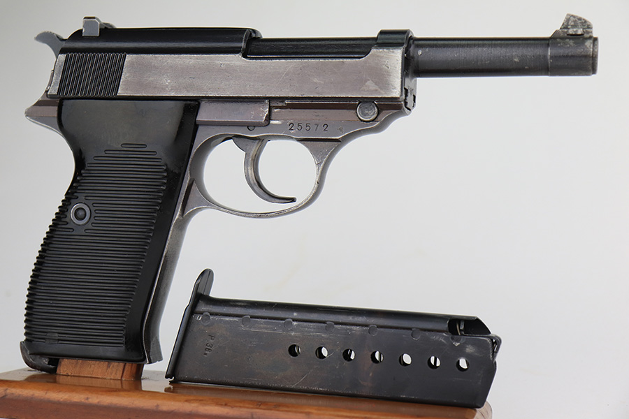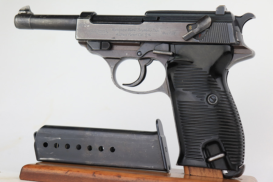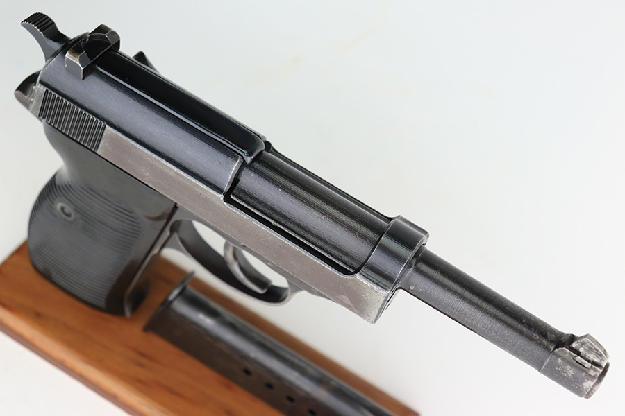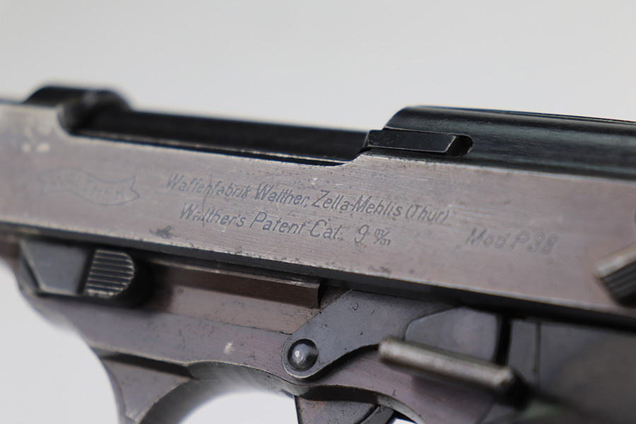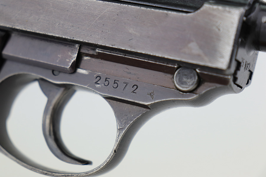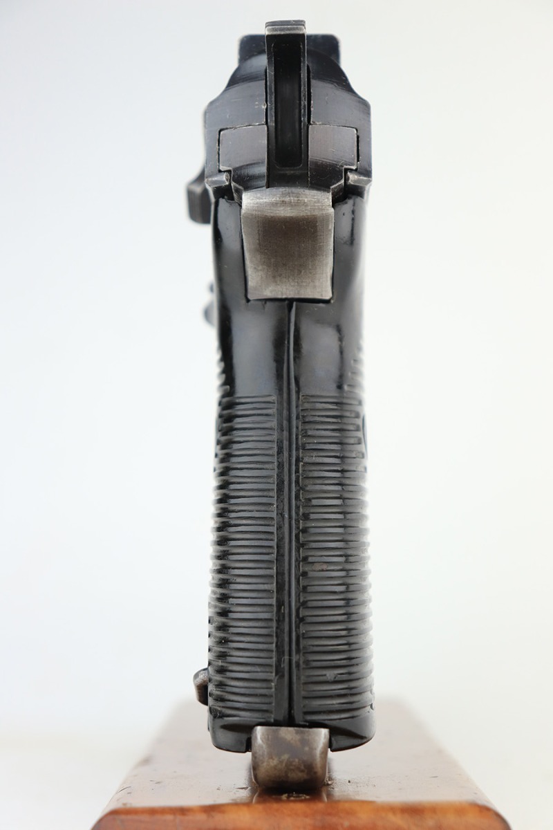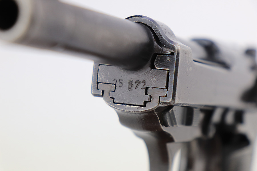 4/11/23 – This is a nice example of a rare Walther Mod P.38 sold in the commercial market during WW2. This one is all matching and has the proper “Eagle N” proofs. This gun is rare as only 1,800 were produced. Interestingly enough, this one has a “Waffen 76” marked Czech fnh barrel. It has retained roughly 70% of its original finish with general thinning throughout. The majority of the finish loss is on the front strap. There is some spotty discoloration on the top of the barrel and at the front left of the slide. There is a common casting flaw at the base of the front strap. Excellent blackish-brown bakelite grips. Comes with an un-proofed “P.38v” magazine. Mint bore. De-cocker is functional.