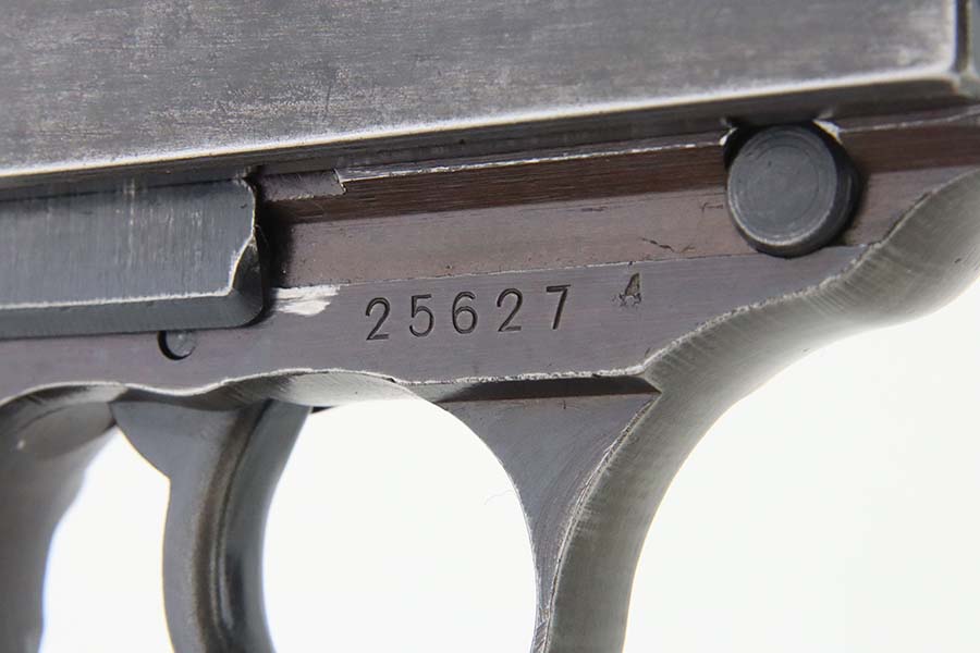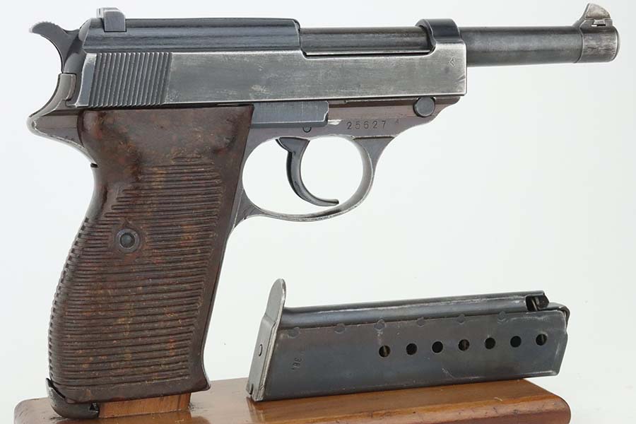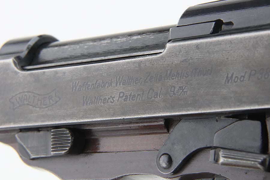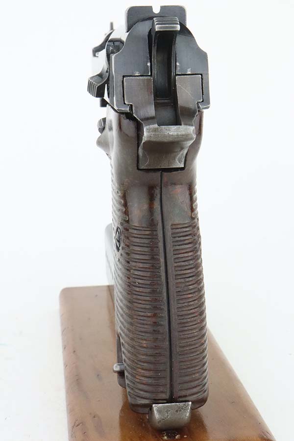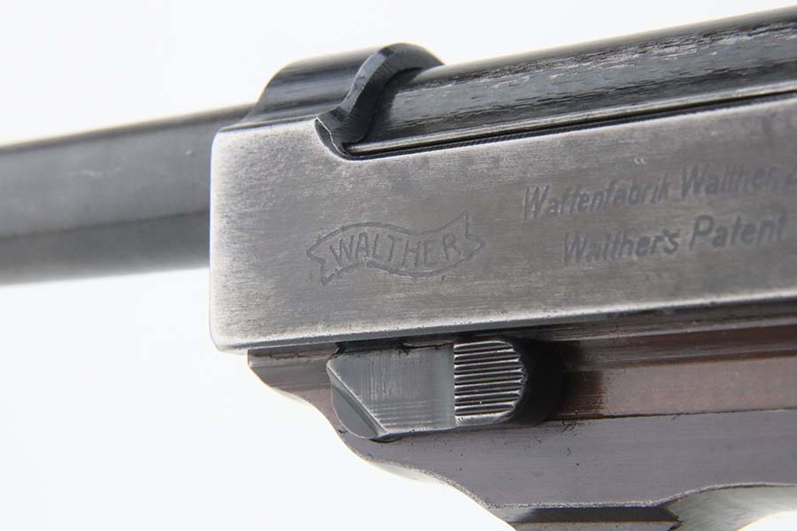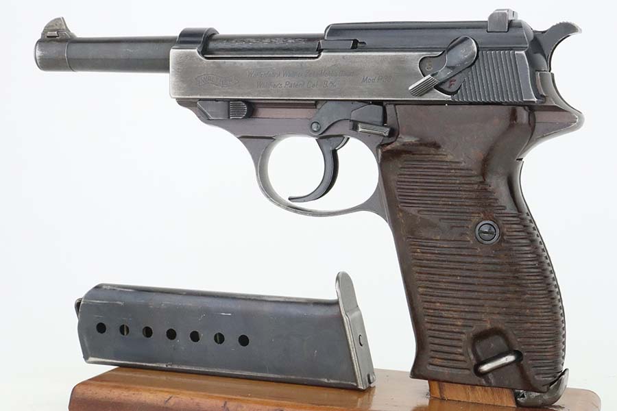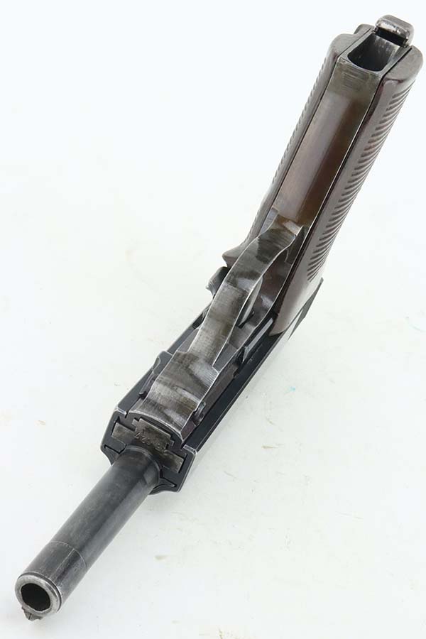 3/26/24 – This is a nice example of a rare Walther Mod P.38 sold in the commercial market during WW2. This one is all matching and has the proper “Eagle N” proofs. This gun is rare as only 1,800 were produced. It has retained roughly 75% of its finish with obvious thinning along both sides of the slide, general high edge wear, and minor muzzle wear. Slight plum-colored frame. Fitted with period-correct reddish bakelite grips and comes with an “Eagle 359” marked Walther magazine. Excellent bore. De-cocker is functional.
