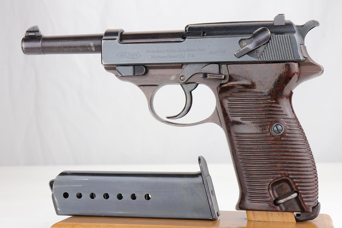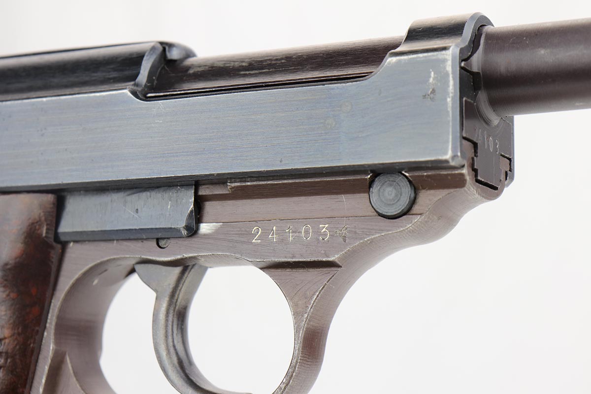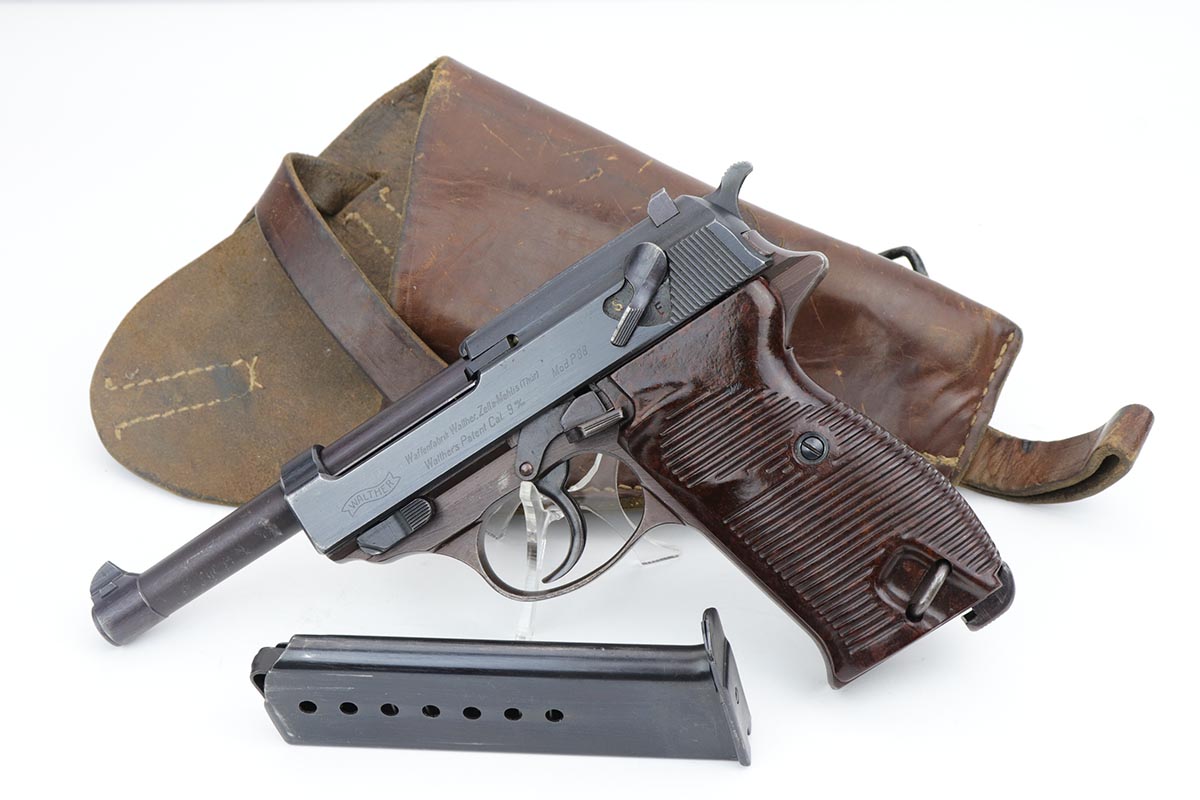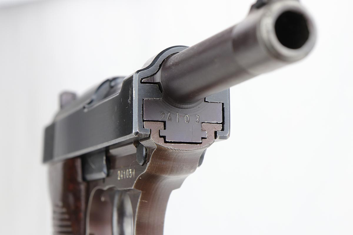 11/22/19 – This is a rare commercial Walther Mod P38 in the correct serial range, one of only 1,800 such pistols produced. The pistol is all matching and original with about 92-94% blue remaining, with the majority of the thinning on the barrel assembly, though the color has also faded some on the front strap. Excellent Walther grips. Minty bore. The pistol comes with a shoulder holster and P.H. Hendriks maker mark.