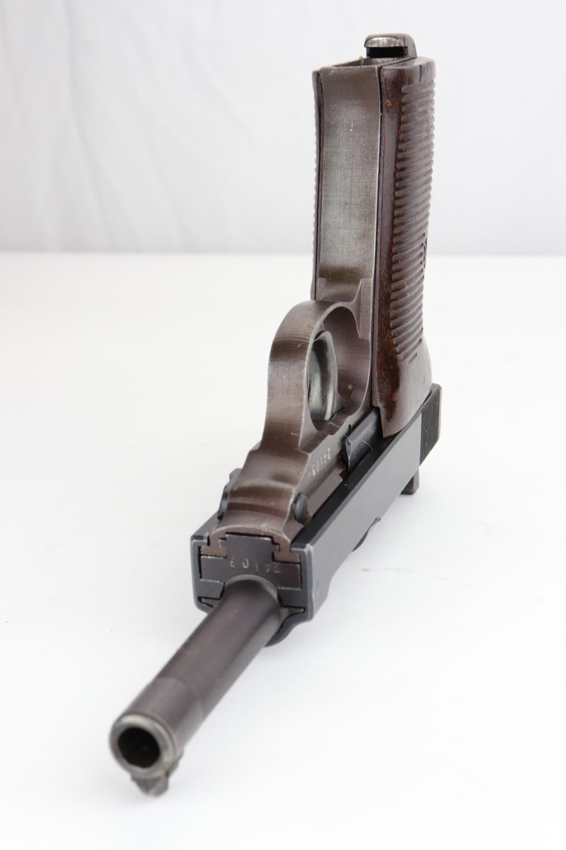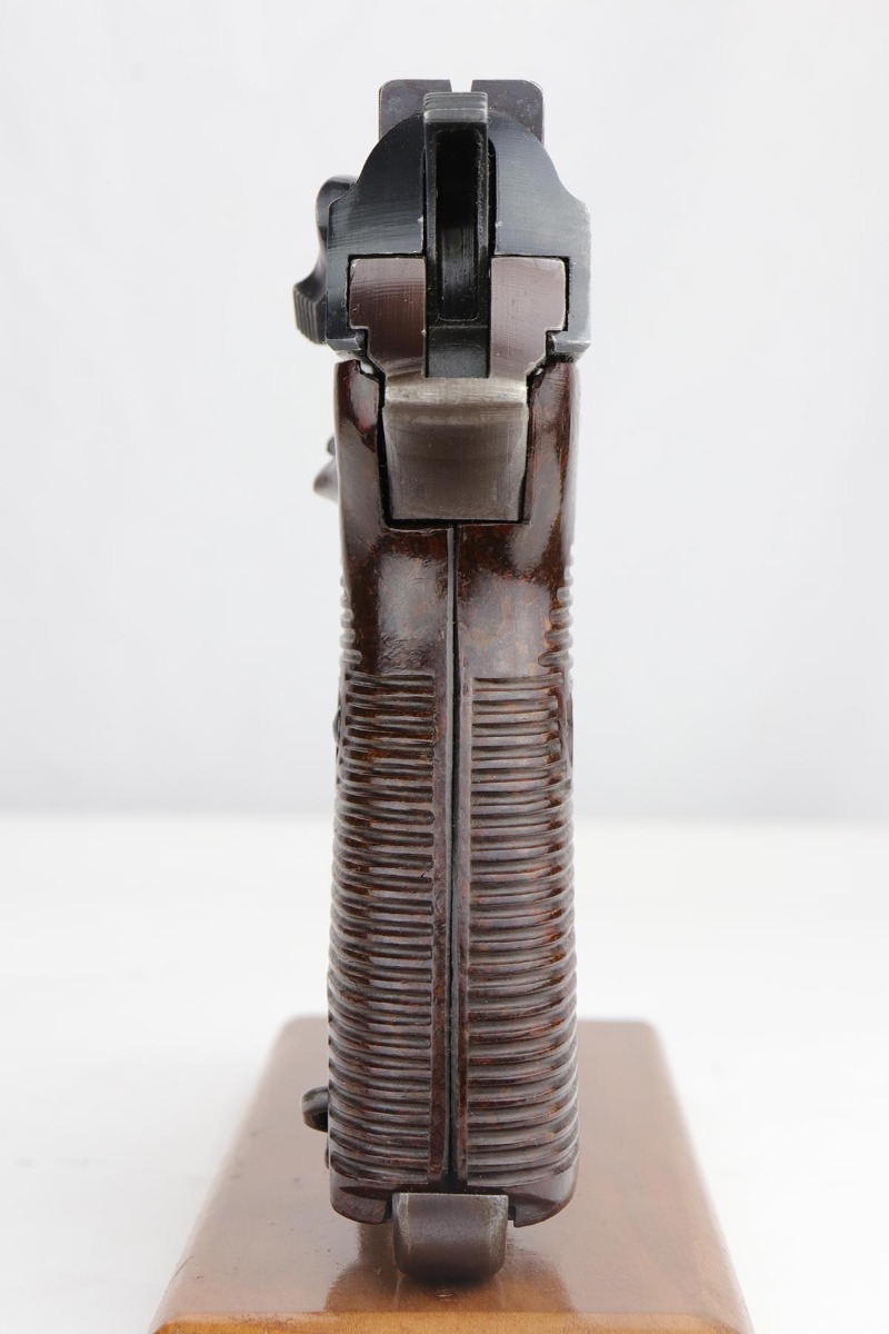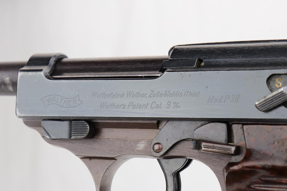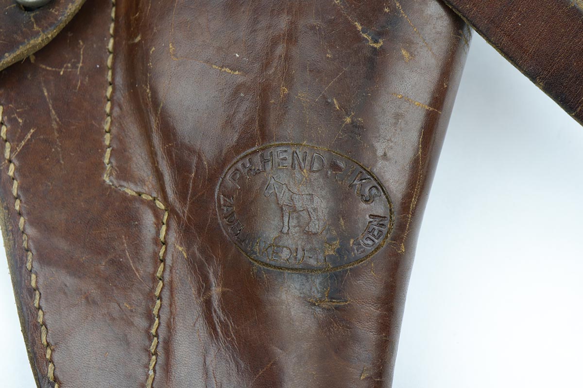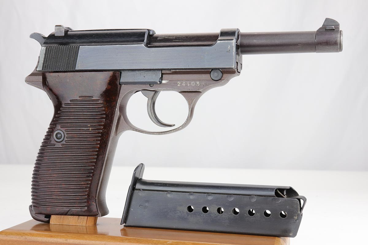 11/22/19 – This is a rare commercial Walther Mod P38 in the correct serial range, one of only 1,800 such pistols produced. The pistol is all matching and original with about 92-94% blue remaining, with the majority of the thinning on the barrel assembly, though the color has also faded some on the front strap. Excellent Walther grips. Minty bore. The pistol comes with a shoulder holster and P.H. Hendriks maker mark.