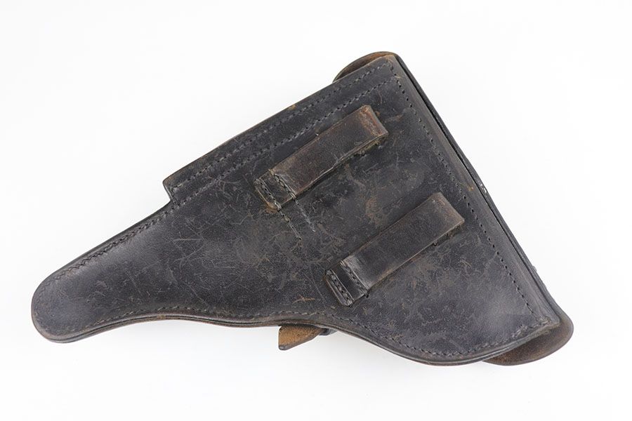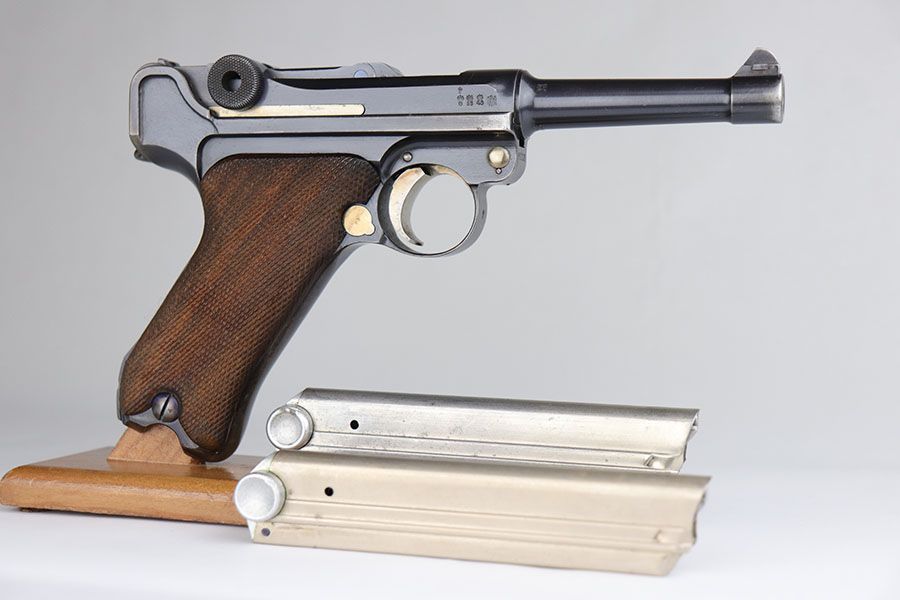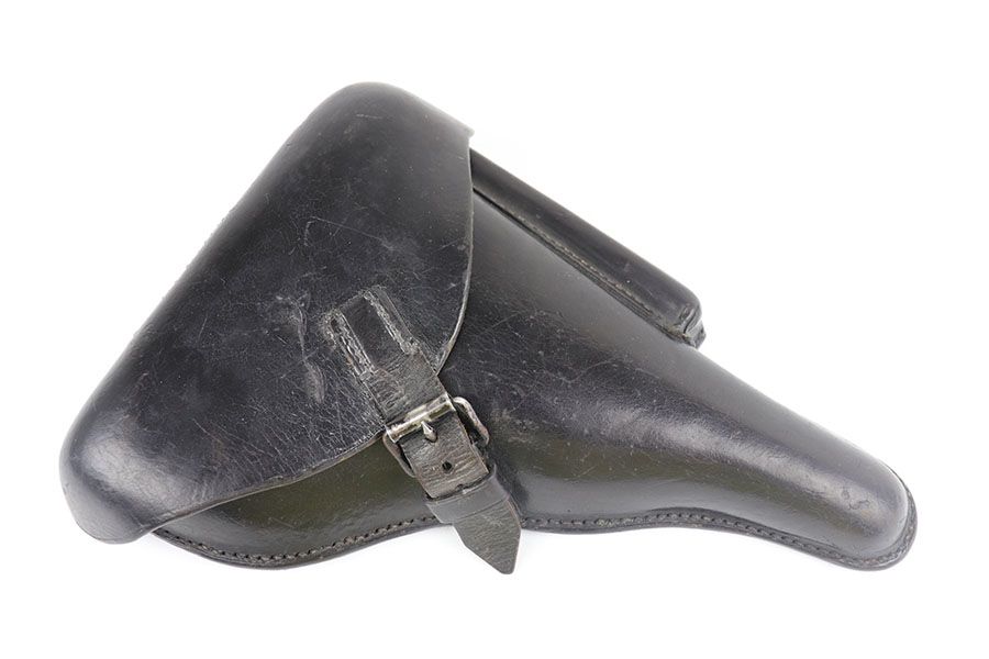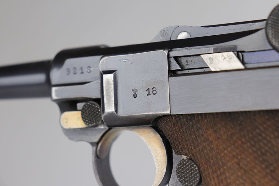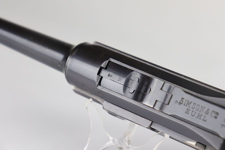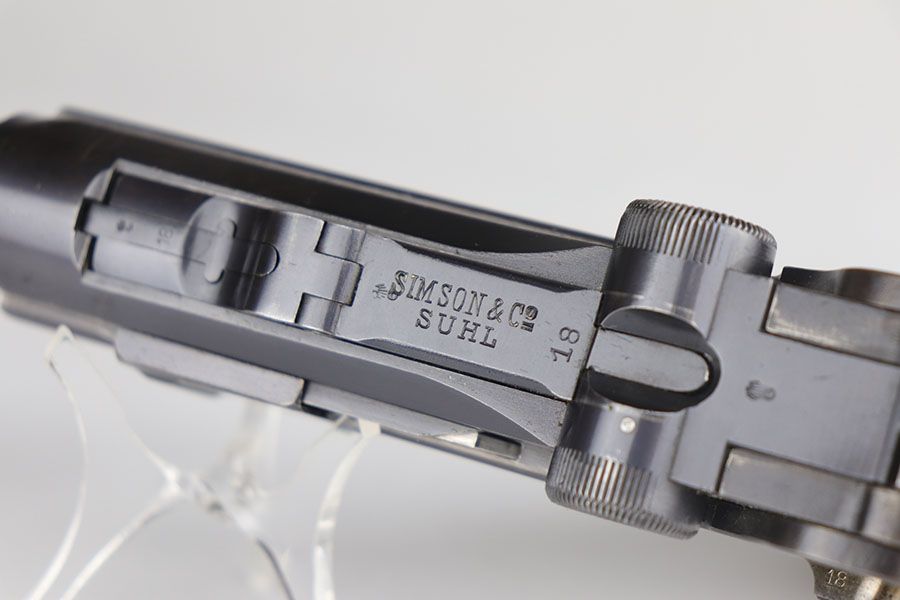 6/20/24 – This is a rare Simson Luger rig from the late 1920s, one of only ~12,000 produced. This is a scarce sub-variation as well with Eagle/46 proof on receiver, one of only 6 known with this marking. The pistol is all matching and original with about 90% blue remaining, and about 80% of the original straw colored small parts. The pistol has standard high edge wear but an excellent profile overall, with most of the finish loss on the straps. All small parts are Simson proofed, including the grip screws. The original grips are present and matching numbered to the pistol with full four digit serial. Both magazines are rare and original Simson made examples but both are mismatched to the pistol. Rig also includes a very rare Simson marked tool, all correct and original. It’s completed by an excellent 1926 dated holster with C. Pose A.G. maker mark. It’s also marked ‘Sch. Pl. K. 27’ on the front, which we believe is a Reichswehr unit marking from Artillerie-Schiebplatz, weapon 27.