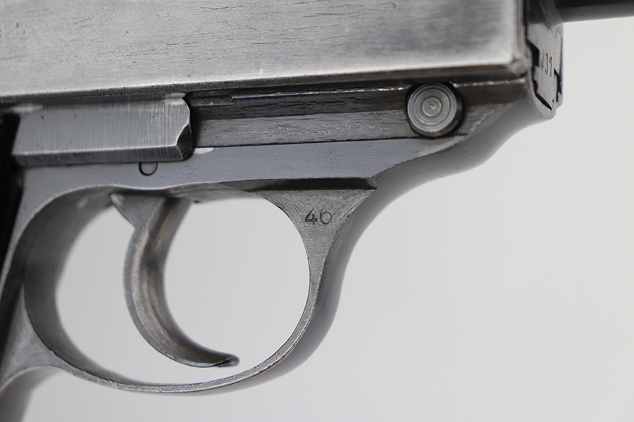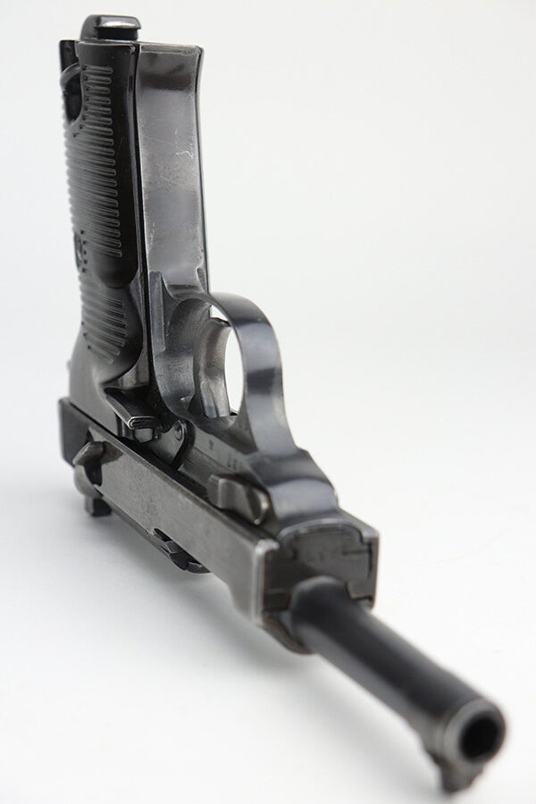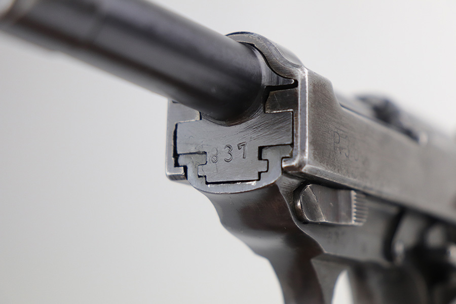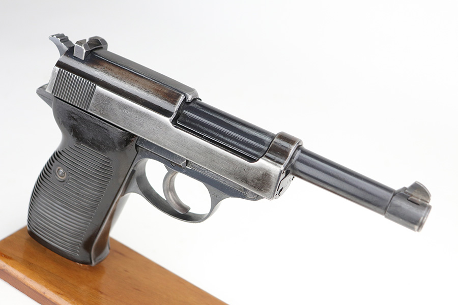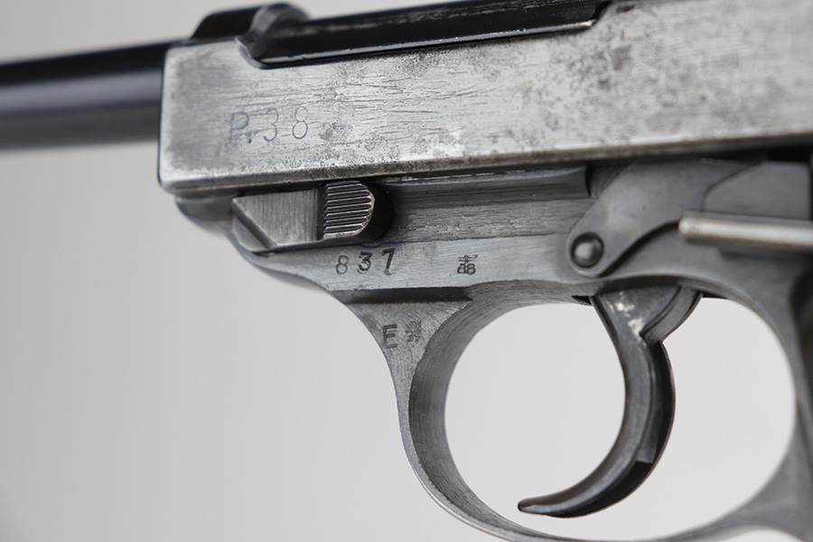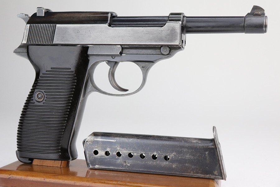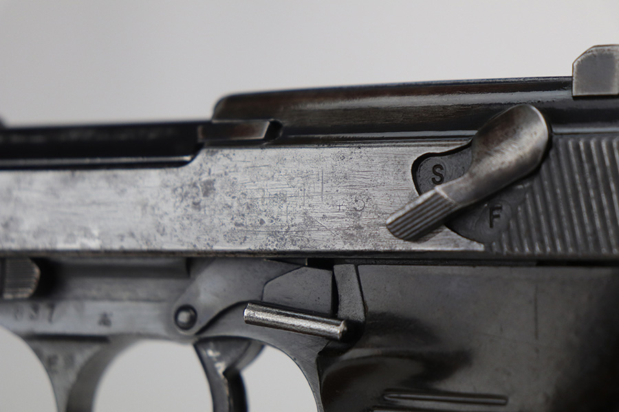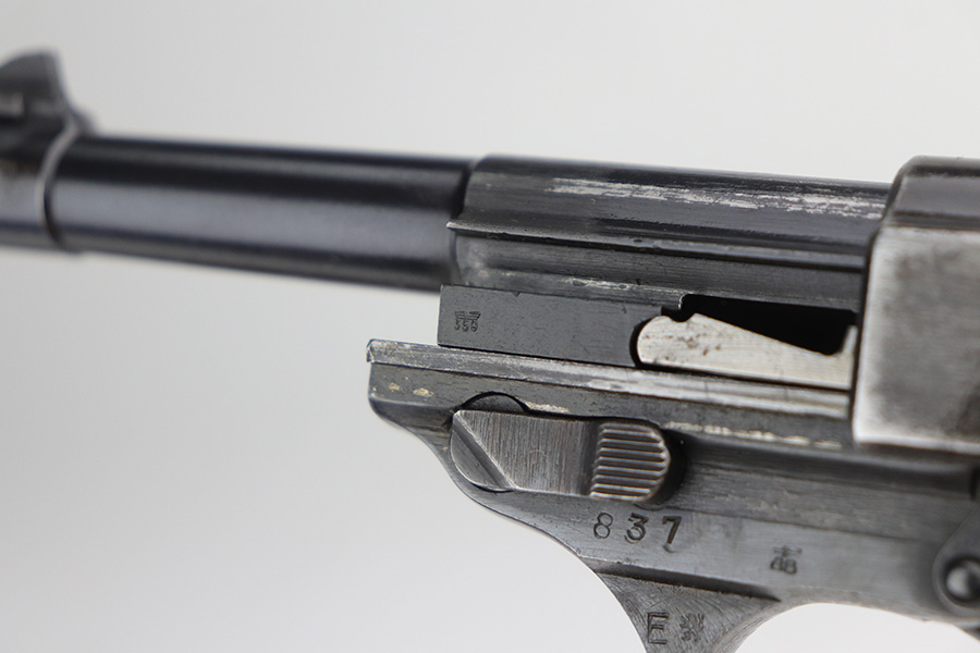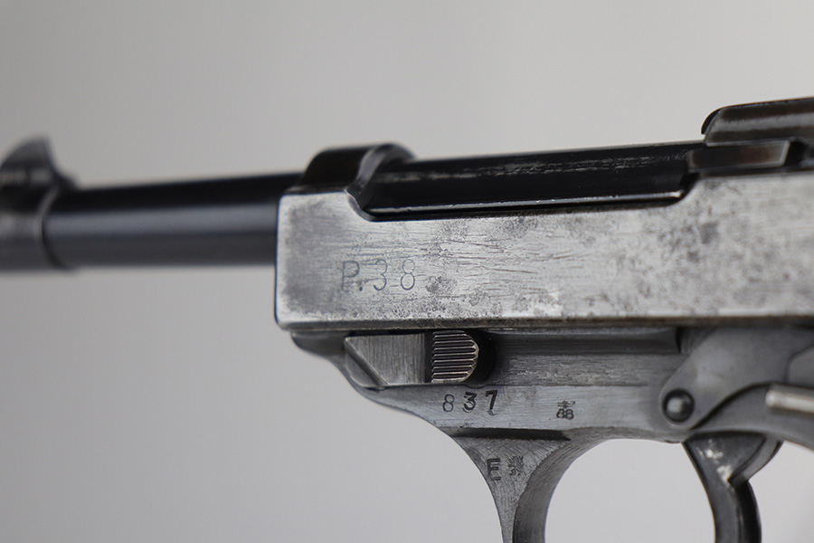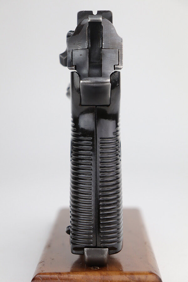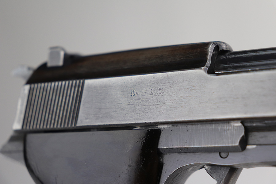 10/26/21 – This is a nice example of a rare CZ 46, a P.38 put-together from leftover Nazi parts and reworked by the Czechs in 1946. This one is all matching, has the proper Czech lion proofs, and a proper Czech “E” proof on the left side of the frame. The frame was made by Spreewerk and has an “Eagle 88” proof on the left side. The slide was made by Walther – the “AC 45” factory code and “Eagle 359” military proofs are very faint as it appears the slide has been buffed. The barrel was made by Walther and has an “Eagle 359” proof. The gun has lost most of its finish, retaining only roughly 25% of its bluing. There is finish loss throughout, but it is most noticeable on the whole slide and front strap. The barrel and frame have retained a decent amount of their finish. There is some light scratchy wear on the top of the barrel through the ejection port. There is spotty oxidation and some areas of minor pitting on the slide (most apparent on the left side). Comes with excellent bakelite grips and an un-marked magazine with pitting throughout. The bore has good rifling with minor frosting throughout. The de-cocker is not functional.