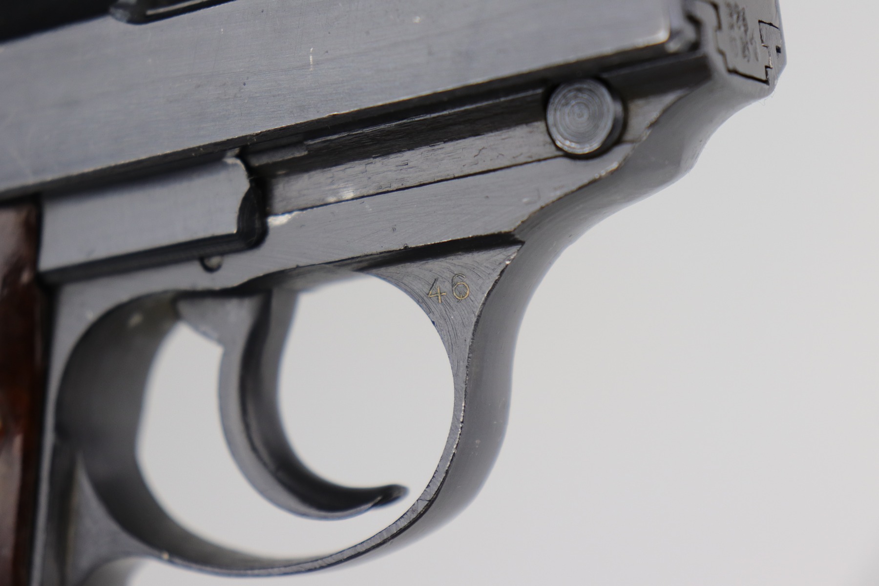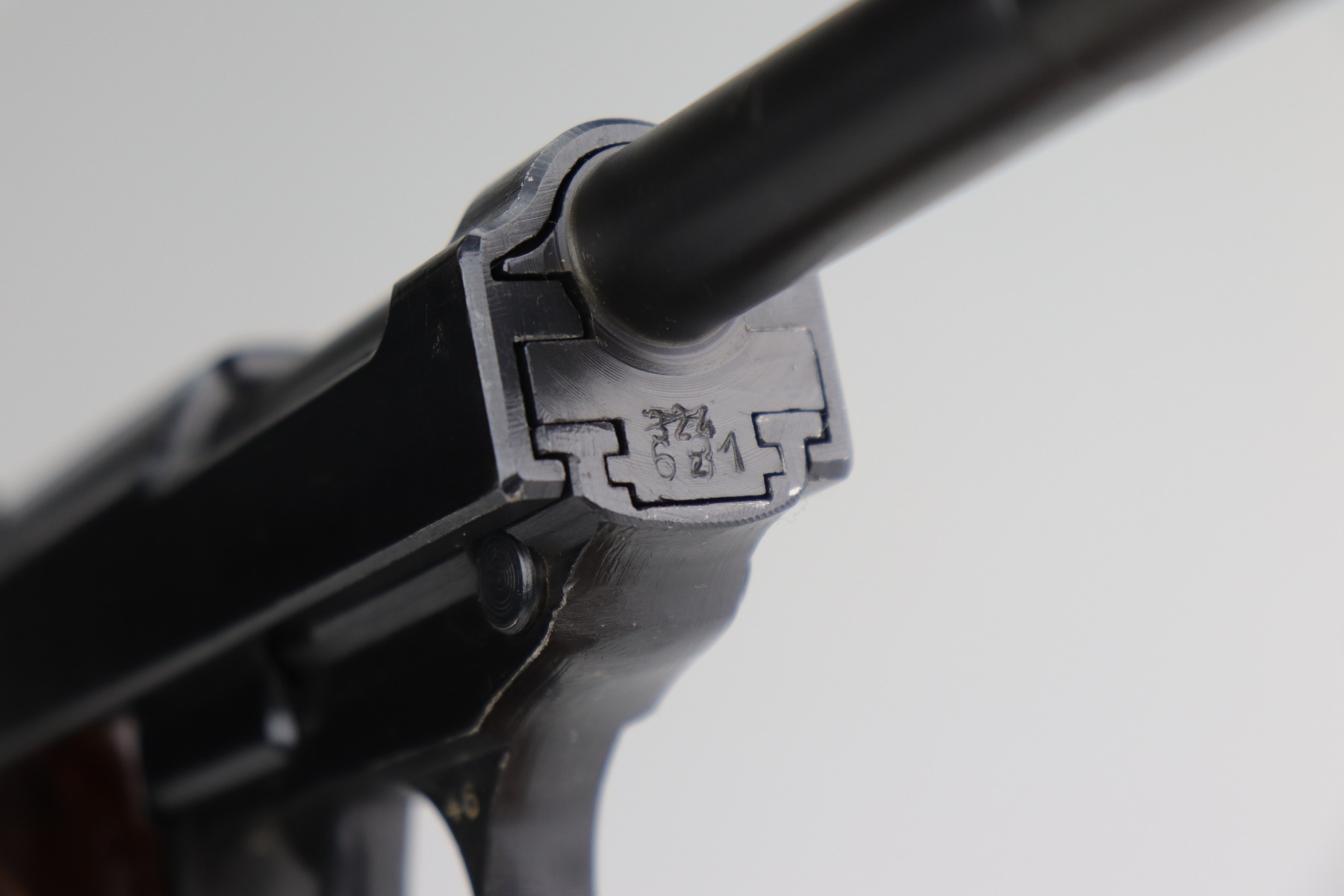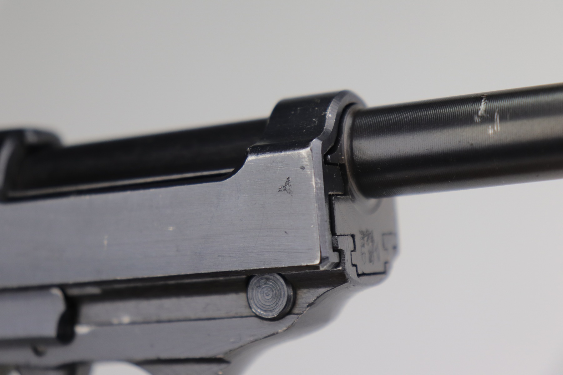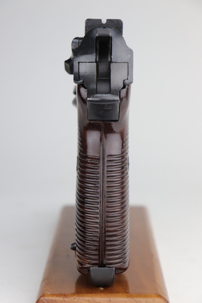 1/11/21 – For you “odd ball” collectors, this is one you want to take a look at. This is a Walther Mod P.38 that was left in the factory at the end of the war, then reworked by the Czech’s. The right side of slide has a single Eagle 88. Left trigger guard has E and Czech lion. Right side trigger guard is 46 marked – the year it was reworked. All numbers match, but it was renumbered or in some cases, first numbered when it was reworked, post war. The locking block has the correct numbers, but some are upside down, probably just a factory error. It has nice reddish grips. There is an old repair on the right panel. We don’t know a lot about these guns but know that even though they are post war assembly they are desired by collectors. Only a few thousand made! It has retained about 98% of its finish – there are just some handling marks on the barrel and front end of the slide. Excellent bore – shiny with strong rifling and just a little bit of freckling. It comes with one matching magazine.