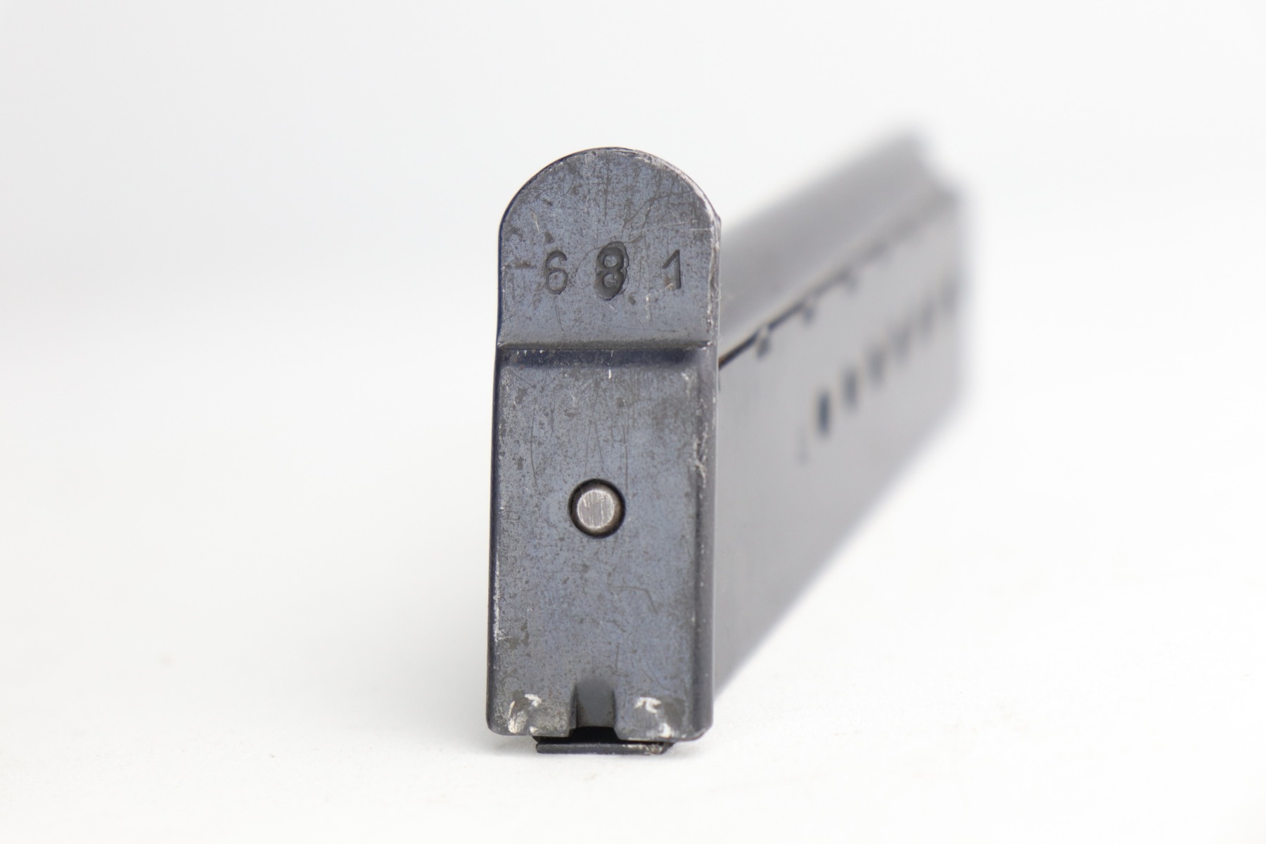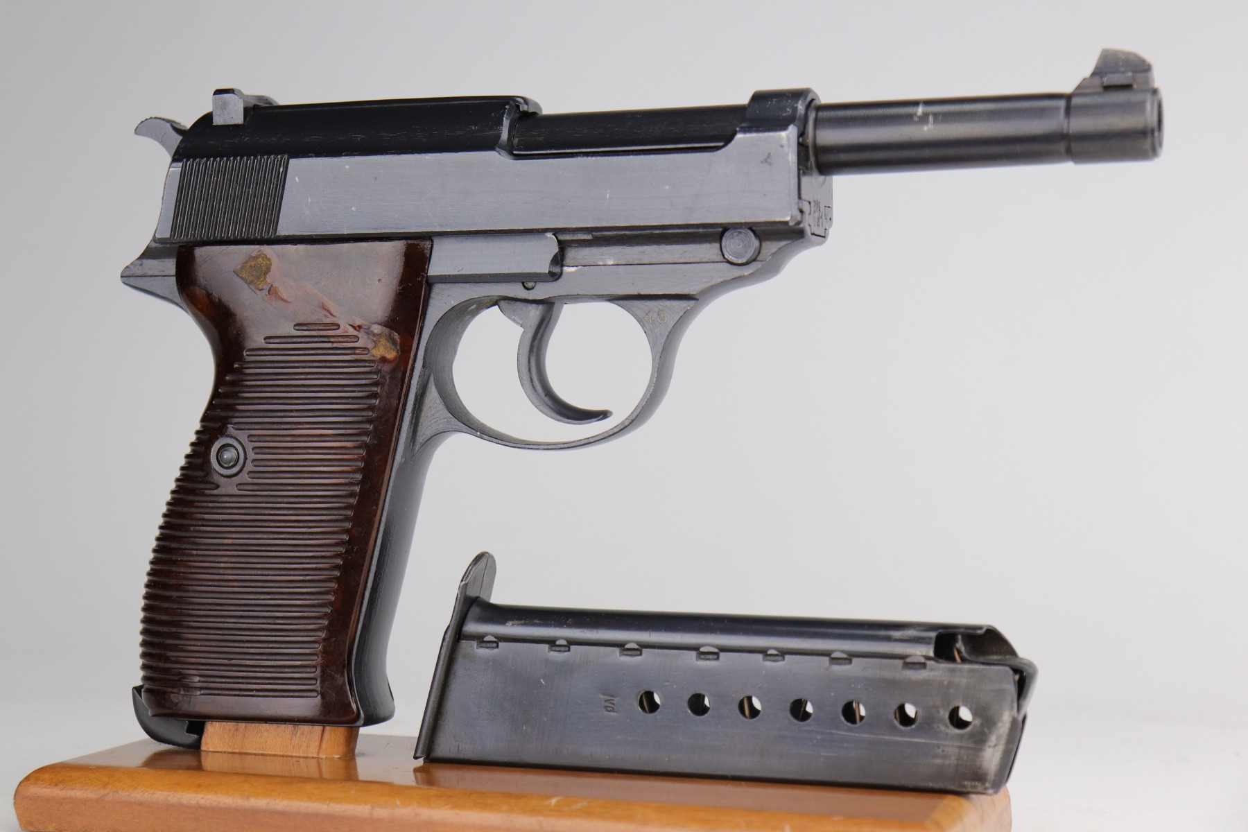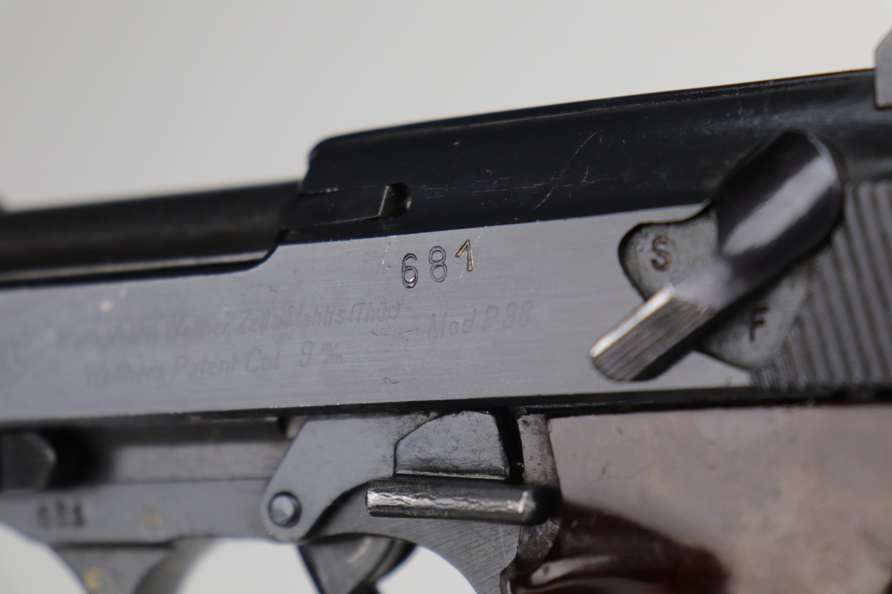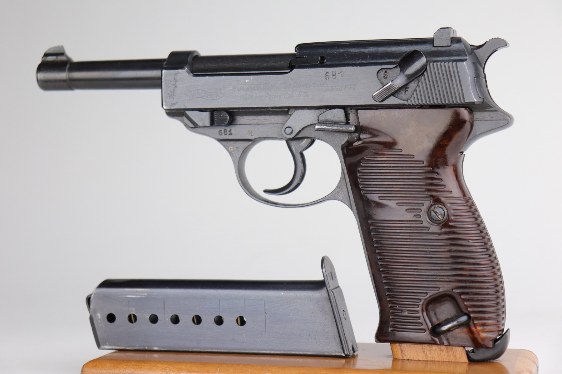 1/11/21 – For you “odd ball” collectors, this is one you want to take a look at. This is a Walther Mod P.38 that was left in the factory at the end of the war, then reworked by the Czech’s. The right side of slide has a single Eagle 88. Left trigger guard has E and Czech lion. Right side trigger guard is 46 marked – the year it was reworked. All numbers match, but it was renumbered or in some cases, first numbered when it was reworked, post war. The locking block has the correct numbers, but some are upside down, probably just a factory error. It has nice reddish grips. There is an old repair on the right panel. We don’t know a lot about these guns but know that even though they are post war assembly they are desired by collectors. Only a few thousand made! It has retained about 98% of its finish – there are just some handling marks on the barrel and front end of the slide. Excellent bore – shiny with strong rifling and just a little bit of freckling. It comes with one matching magazine.