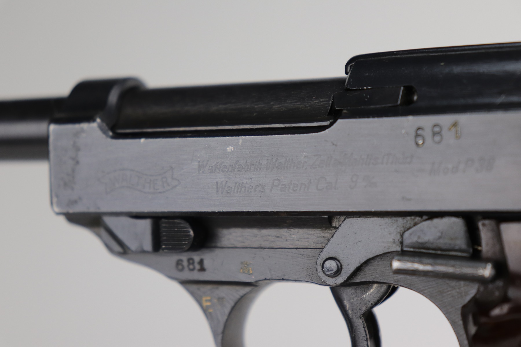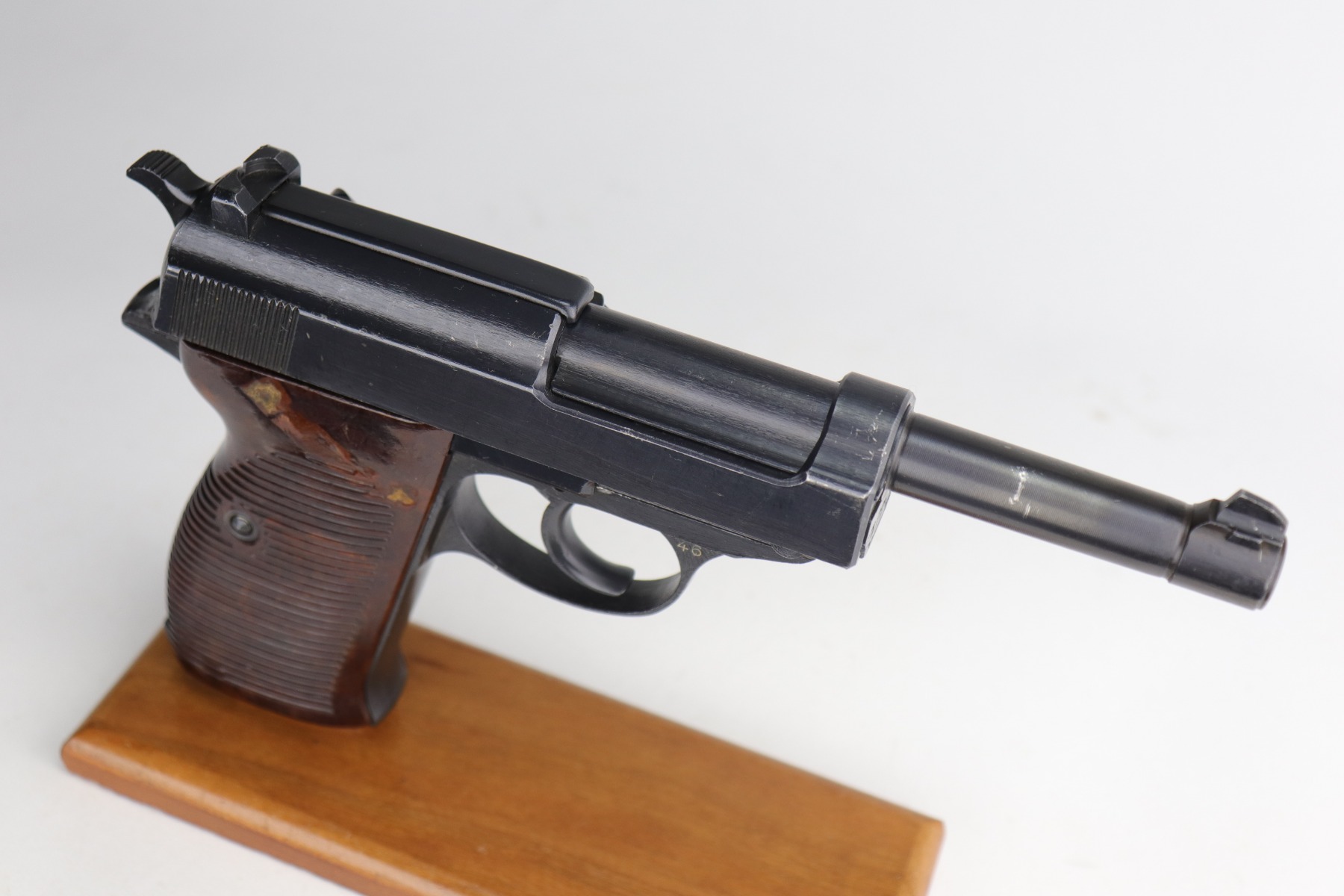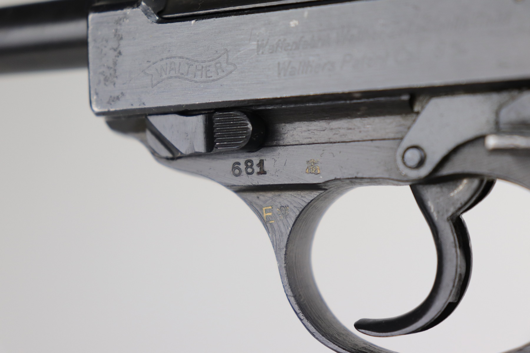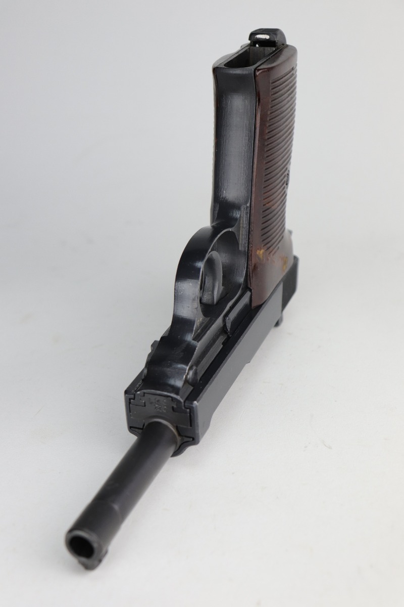1/11/21 – For you “odd ball” collectors, this is one you want to take a look at. This is a Walther Mod P.38 that was left in the factory at the end of the war, then reworked by the Czech’s. The right side of slide has a single Eagle 88. Left trigger guard has E and Czech lion. Right side trigger guard is 46 marked – the year it was reworked. All numbers match, but it was renumbered or in some cases, first numbered when it was reworked, post war. The locking block has the correct numbers, but some are upside down, probably just a factory error. It has nice reddish grips. There is an old repair on the right panel. We don’t know a lot about these guns but know that even though they are post war assembly they are desired by collectors. Only a few thousand made! It has retained about 98% of its finish – there are just some handling marks on the barrel and front end of the slide. Excellent bore – shiny with strong rifling and just a little bit of freckling. It comes with one matching magazine.