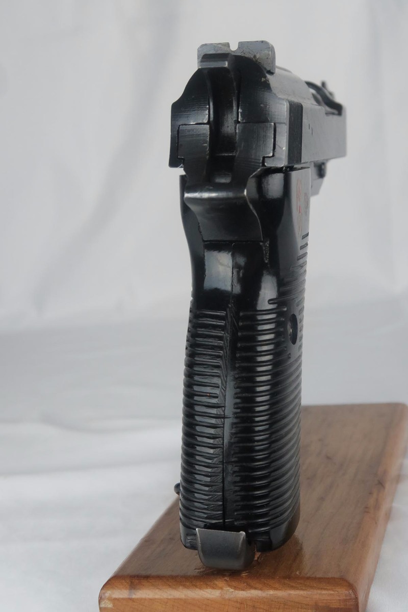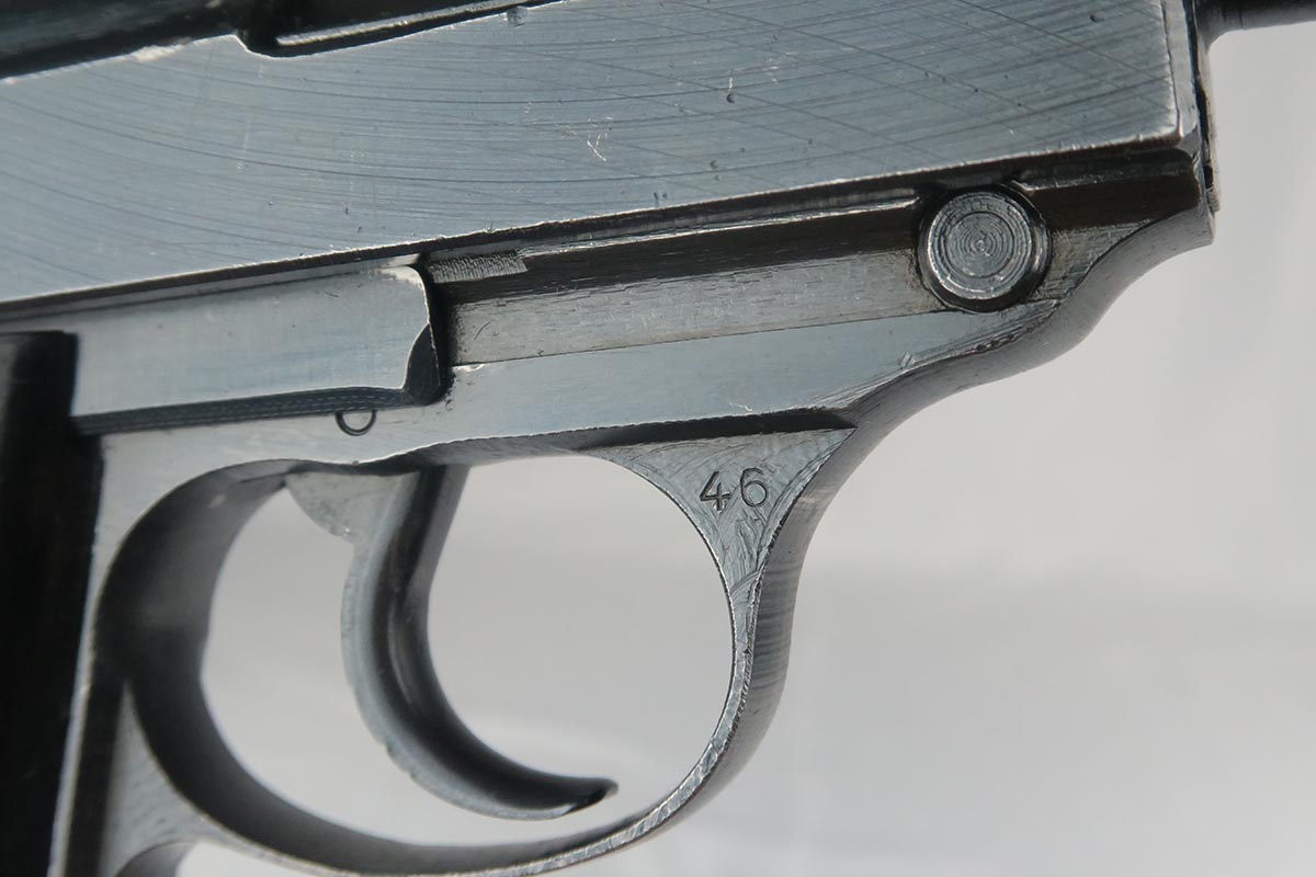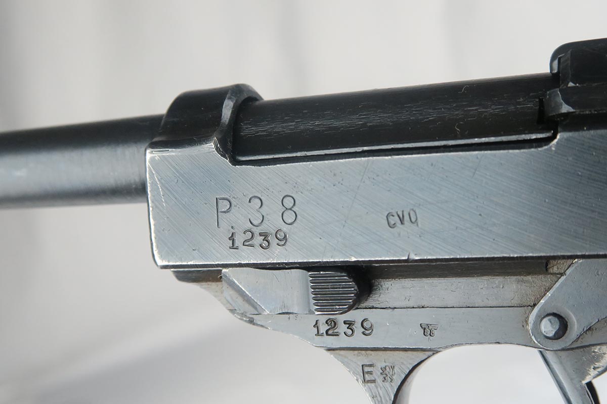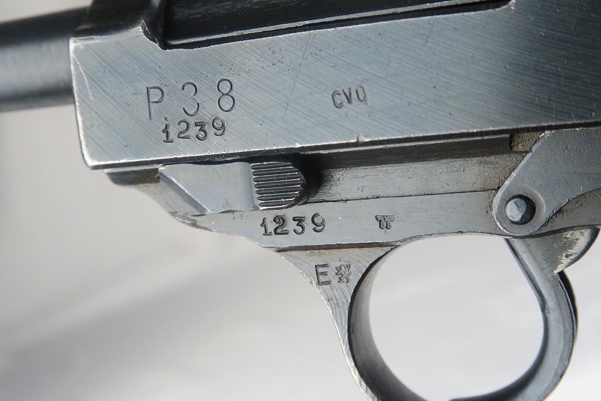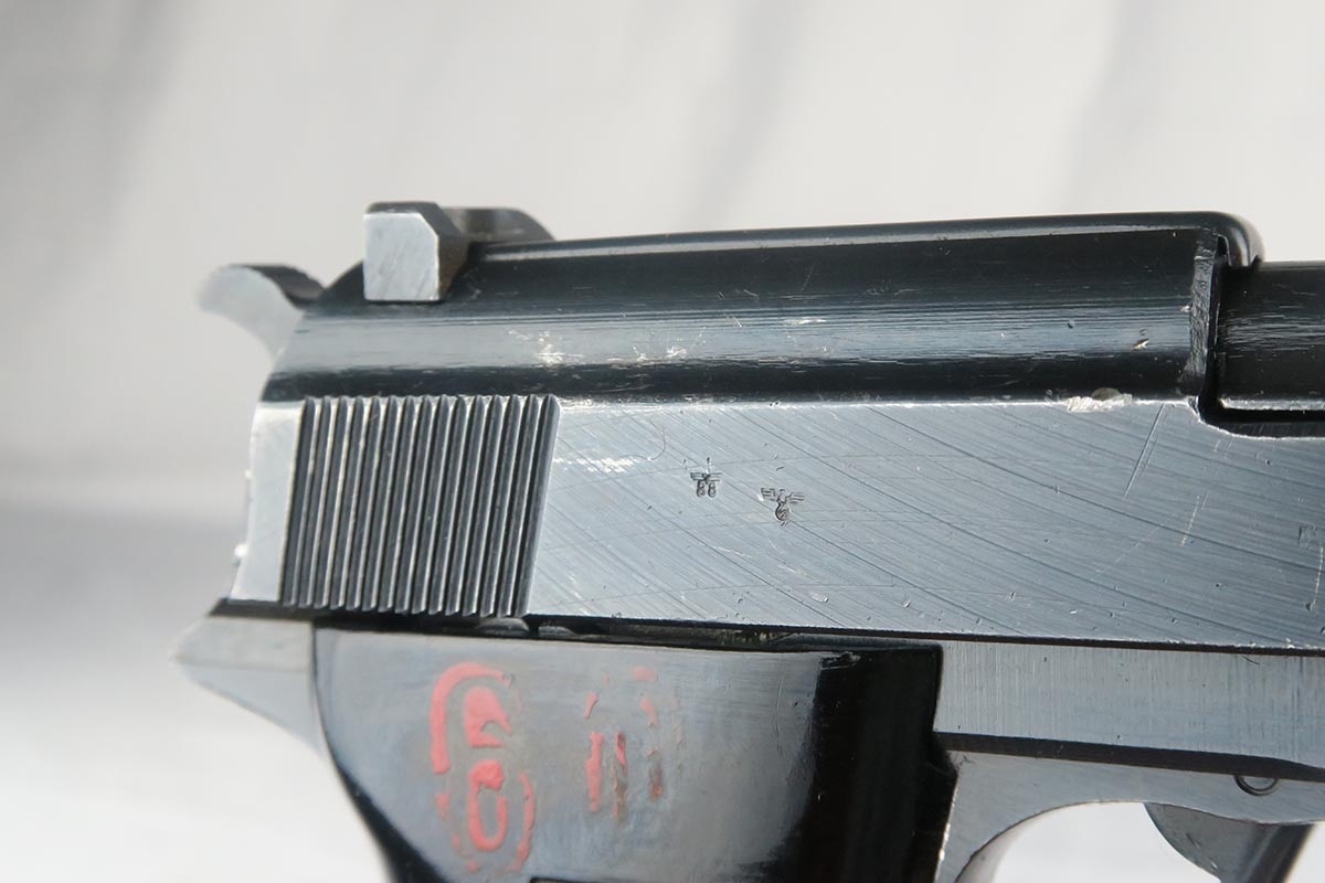 10/18/17 – For you “odd ball” collectors, this is one you want to take a look at.  This is a Spreewerke made P.38 but left in the factory at the end of the war, then reworked by the Czech’s.  The right side of slide has a single Eagle 88.   Left trigger guard has E and Czech lion.   Right side trigger guard is 46 marked – the year it was reworked.  It has a cog hammer from 1945.   All numbers match, but it was renumbered or in some cases, first numbered when it was reworked, post war.   It has excellent grips that show a red painted lot number of ’60’ on each panel. I don’t know a lot about these guns but I know that even though they are post war assembly they are desired by collectors. Only a few thousand made!  Mint bore.  No import marks.