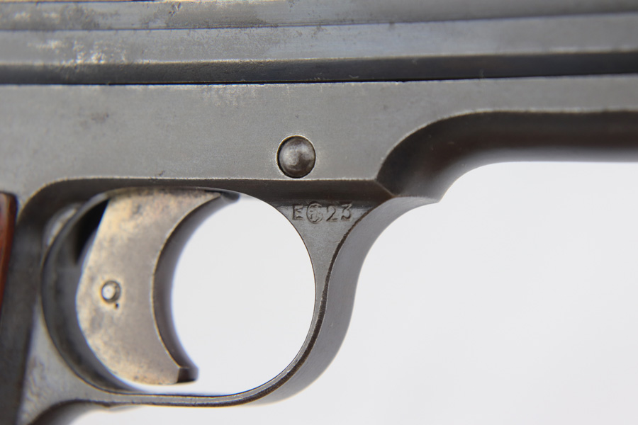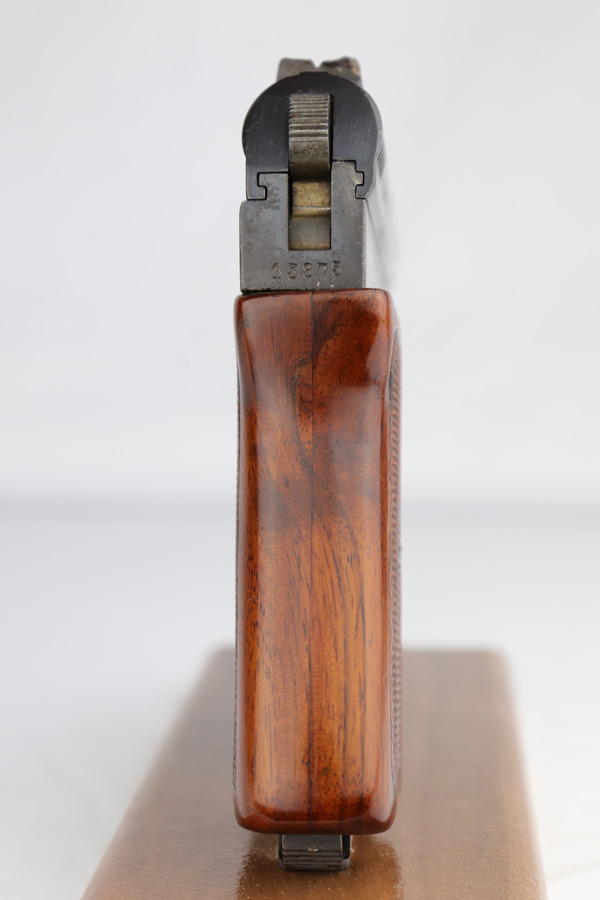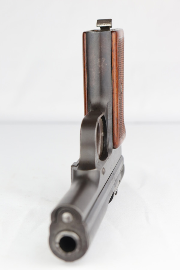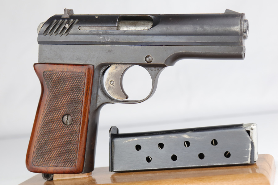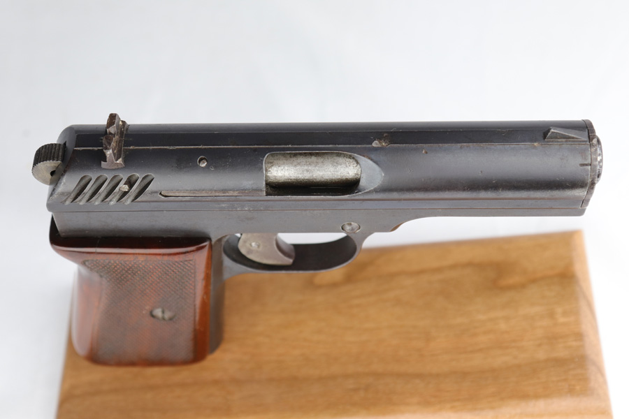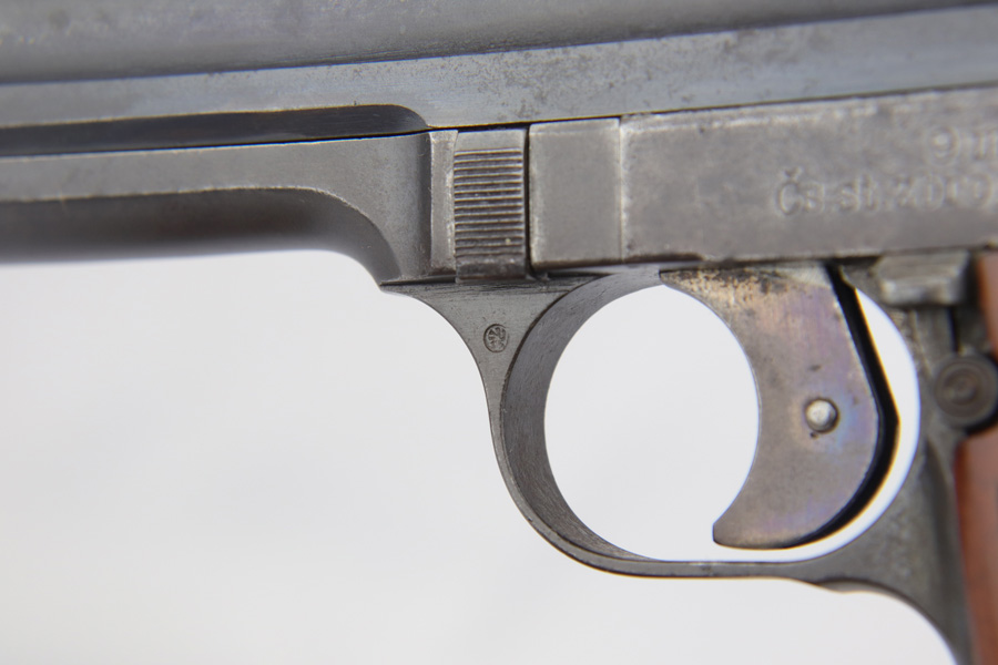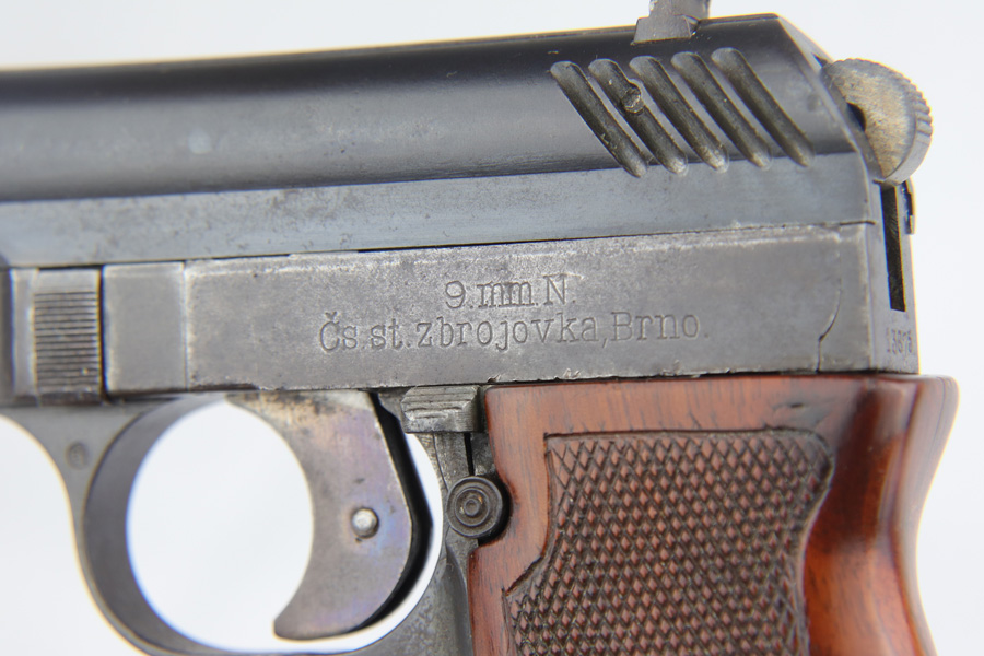 1/28/19 – The Czech vz.22 pistol was manufactured by Zbrojovka Brno (the Brno Weapons Factory) between 1920 and 1923. Though it was initially intended to be a production military pistol, it ultimately served as a mere prototype for the vz.24 which was manufactured by Ceska Zbrojovka (CZ). In October of 1918 Czechoslovakia declared its independence from the Austro-Hungarian Empire, and in 1919 took steps to establish an arms factory in Brno, which was initially staffed largely by Austrians and Hungarians because the Austrians had the requisite expertise in arms manufacture. The Prototype CZ-22 was notoriously unreliable and generally required individual tweaking with each pistol, which led to the full order of nearly 20,000 pistols largely being full of pistols that were quite dissimilar. This particular pistol retains 92-95% original blue, as it doesn’t have major finish loss but there is patina coming through. It comes with original wooden “wrap around” grips that are in excellent condition. Just as with later CZ’s this gun has the similar bottom release magazine. It has a strong bore with no major flaws. There is a Czech Lion and 1923 date on frame / trigger guard. The gun comes with an aftermarket CZ magazine. It is in 9mm Kurz and allows for the gun to function properly and feed properly. While I would not use this gun as one to take regularly to the range it does appear to function well. Again, a rare, seldom seen handgun. First one ever offered by Legacy.