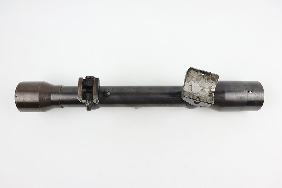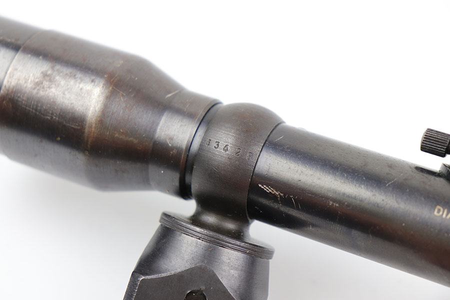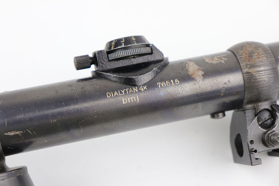 6/17/20 – This is a rare and original Dialytan 4x scope for the High Turret K98 and includes the original front mount, though the rear mount is not present. It’s all original, including the rings. The finish has a good amount of the original blue but there is some patina and edge wear throughout, and a bit of freckling on both sides. The optics are pretty clear with just a bit of dirt/cloudiness around the edges. Windage knob still functional. ‘Bmj’ maker mark.