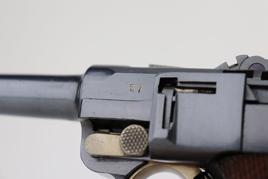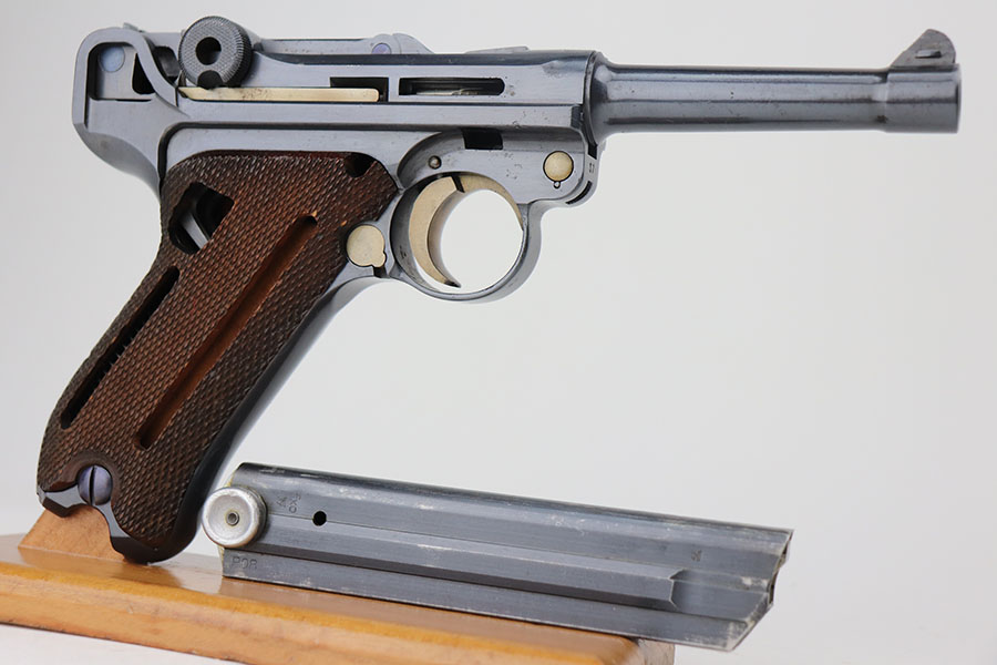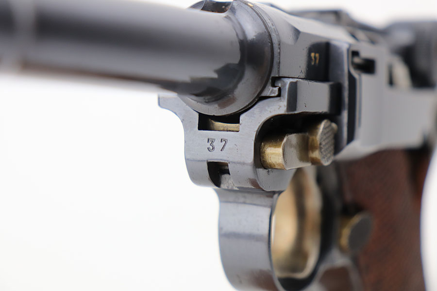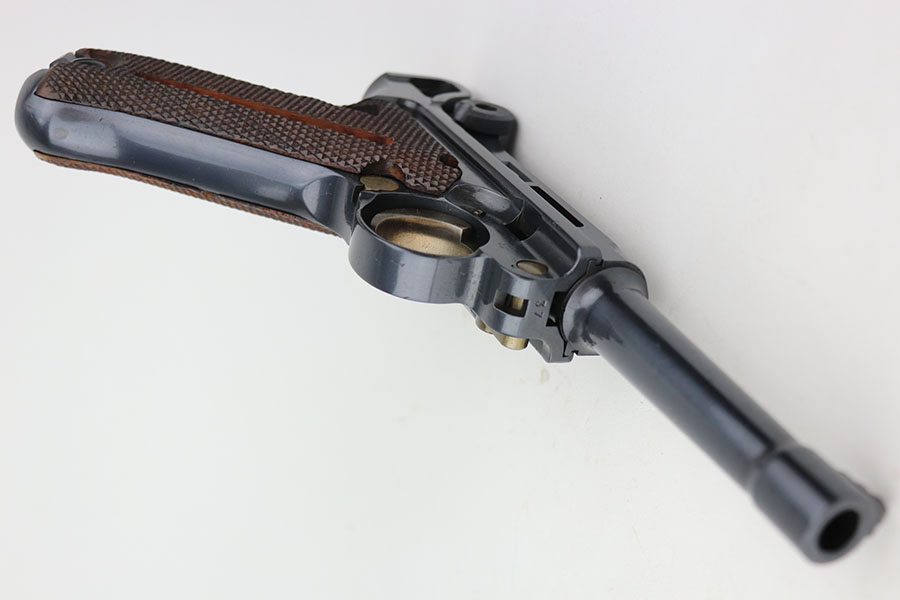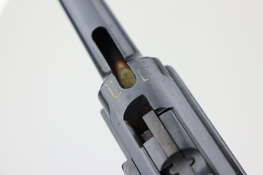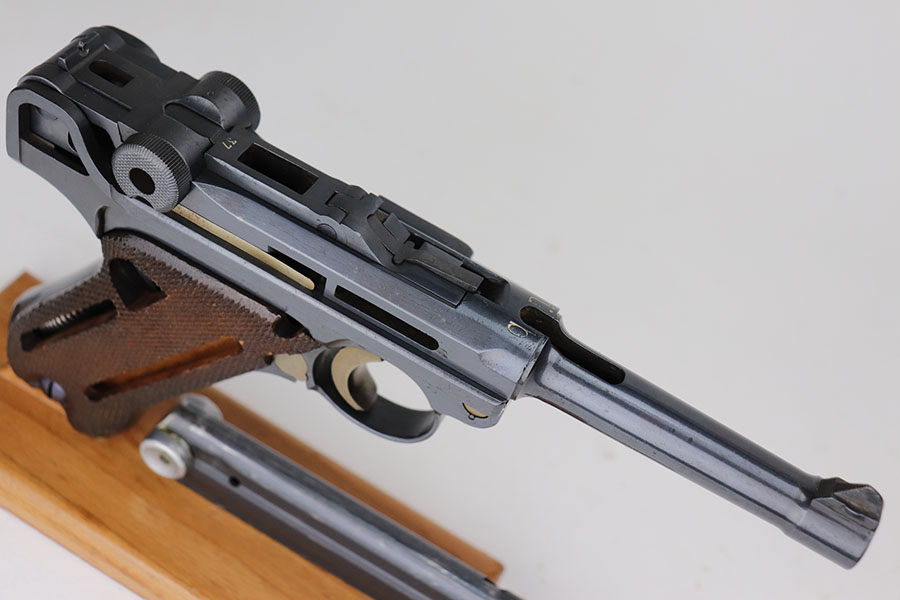 4/8/21 – This is a very rare factory cutaway example of a Mauser Luger for training/instruction, and has rare UB marking on top of chamber. This specific Luger is documented and pictured in “Lugers At Random” by Charles Kenyon Jr. Kenyon states this example shown is regarded by collectors as a “tool room” model because of the “U B” proof over the chamber. “Ubung” meaning trial or test. This is viewed as a factory executed example as it is serialized but NOT proofed, and it’s also the first such example we’ve encountered. Cross-sections of all parts are visible, and it even has a cross section of a 9mm cartridge in the chamber. . Beautiful finish throughout. Bore is shiny with strong rifling but there is some pitting toward the muzzle end. Excellent grips. Magazine is numbered and matching to the gun. All in all a super rare piece, perhaps one-of-a-kind.