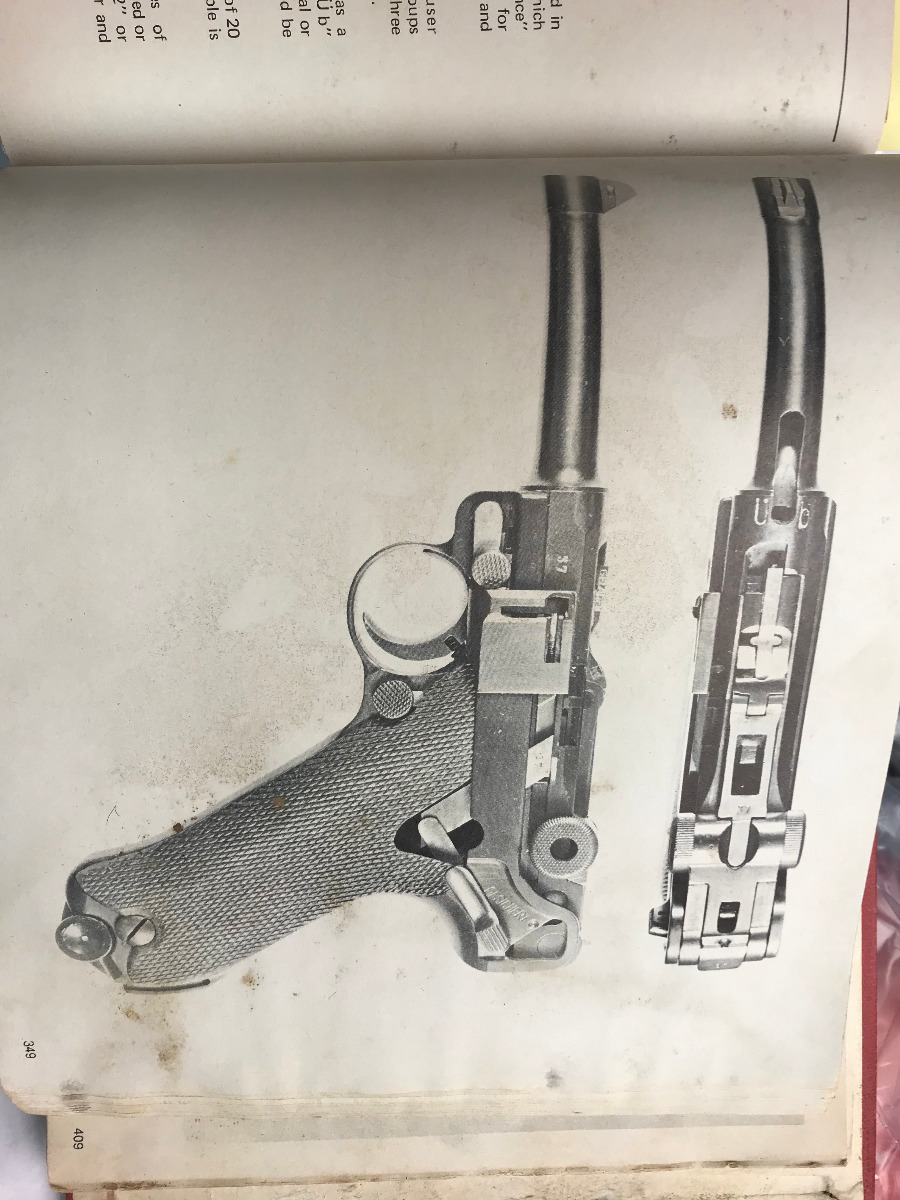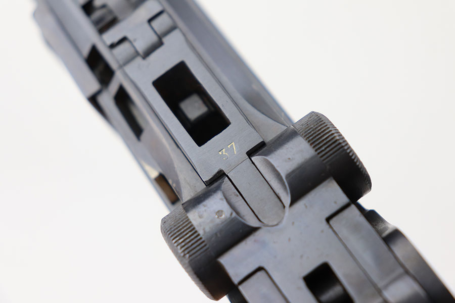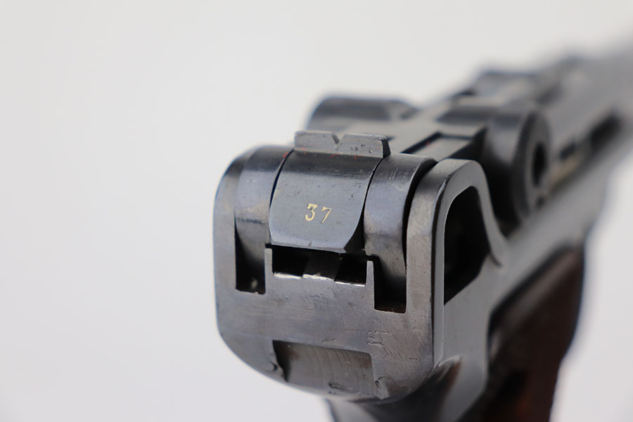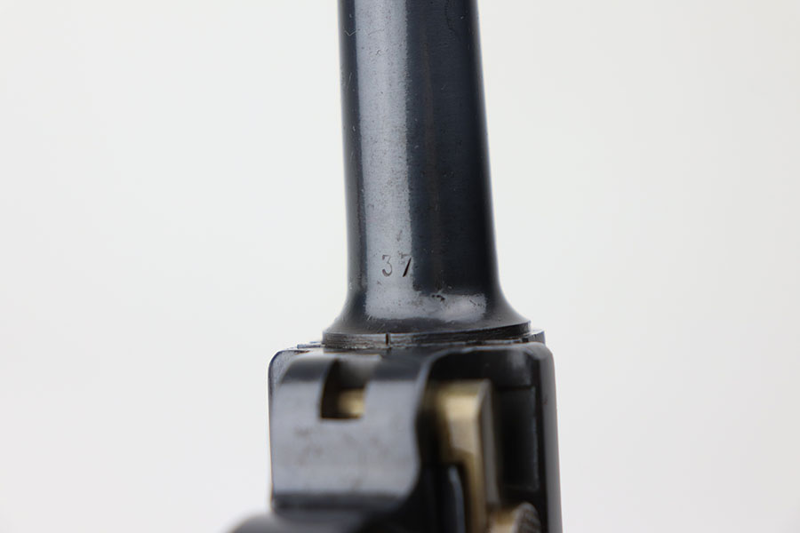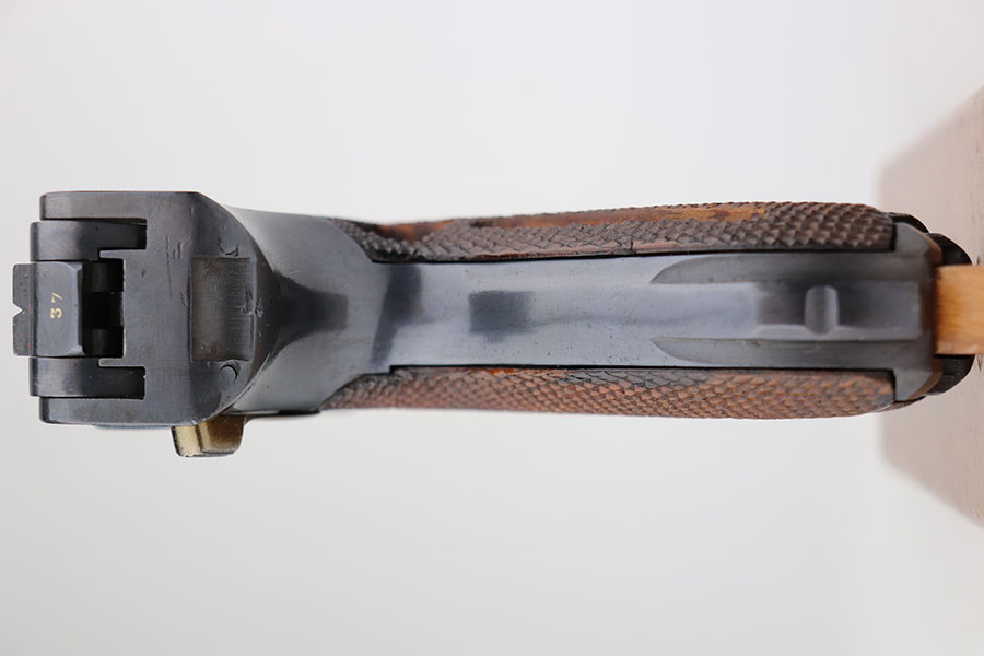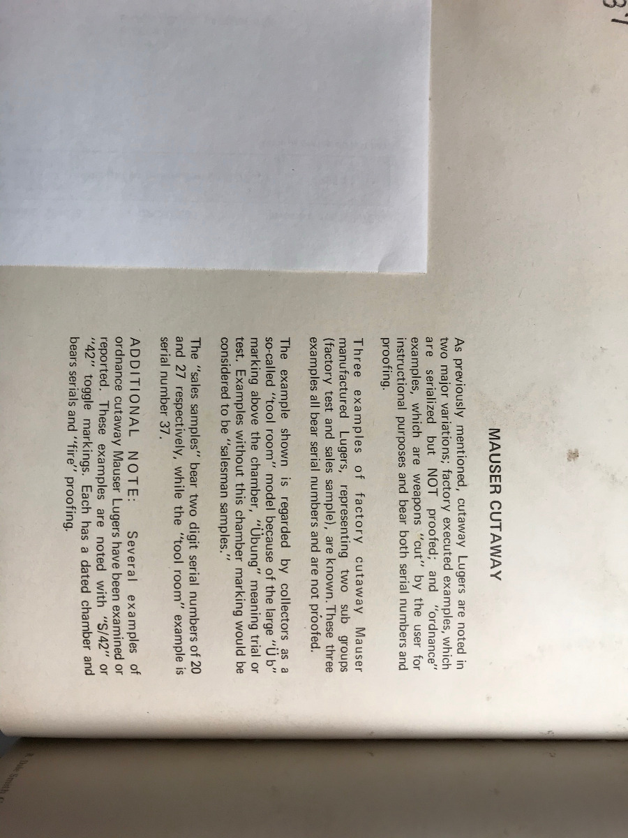 4/8/21 – This is a very rare factory cutaway example of a Mauser Luger for training/instruction, and has rare UB marking on top of chamber. This specific Luger is documented and pictured in “Lugers At Random” by Charles Kenyon Jr. Kenyon states this example shown is regarded by collectors as a “tool room” model because of the “U B” proof over the chamber. “Ubung” meaning trial or test. This is viewed as a factory executed example as it is serialized but NOT proofed, and it’s also the first such example we’ve encountered. Cross-sections of all parts are visible, and it even has a cross section of a 9mm cartridge in the chamber. . Beautiful finish throughout. Bore is shiny with strong rifling but there is some pitting toward the muzzle end. Excellent grips. Magazine is numbered and matching to the gun. All in all a super rare piece, perhaps one-of-a-kind.