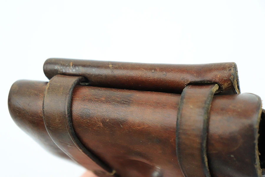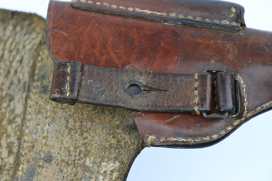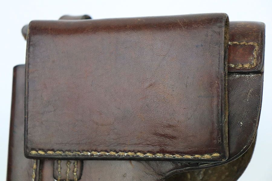10/7/22 – This is an original, rare variation dropping style Walther PPK holster. These holsters were likely used by the Luftwaffe or special-issued PPK pistols. The holster interior has a faint, slightly smudged ink stamp that indicates use for PPK pistols in 7.65mm. There are no other markings or stamps. The brown leather shows aging and previous use wear but no major issues. The leather has normal pliability and the stitching is all tight and original.