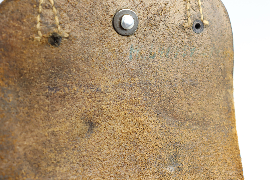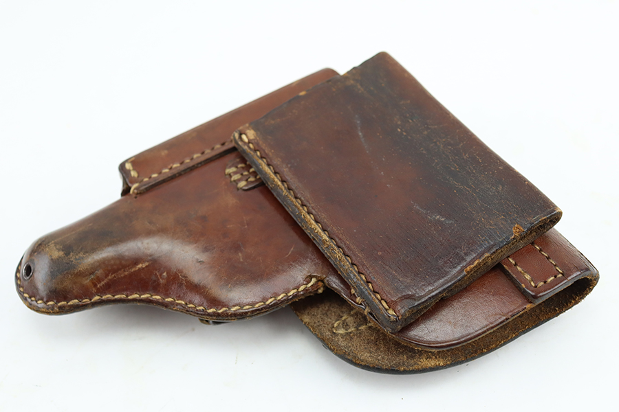3/12/24 – This is an original, rare variation dropping style Walther PPK holster. These holsters were likely used by the Luftwaffe or special-issued PPK pistols. The holster interior has a faint, smudged ink stamp on the inside – it is illegible. There are no other markings or stamps. The leather is mostly in good condition, but there is some surface cracking on the top flap and the leather bands.