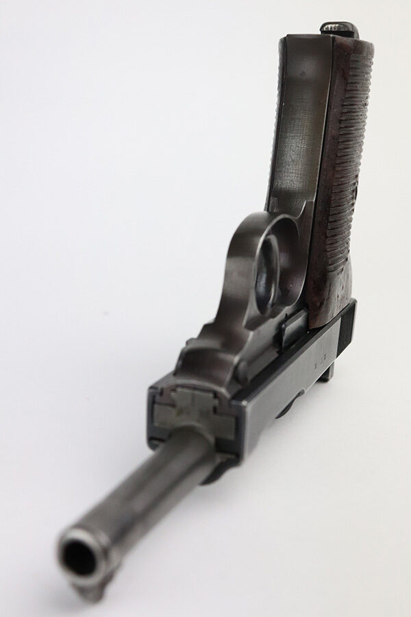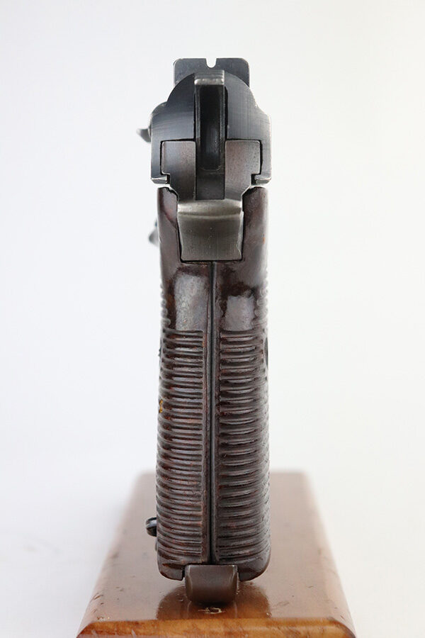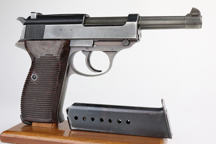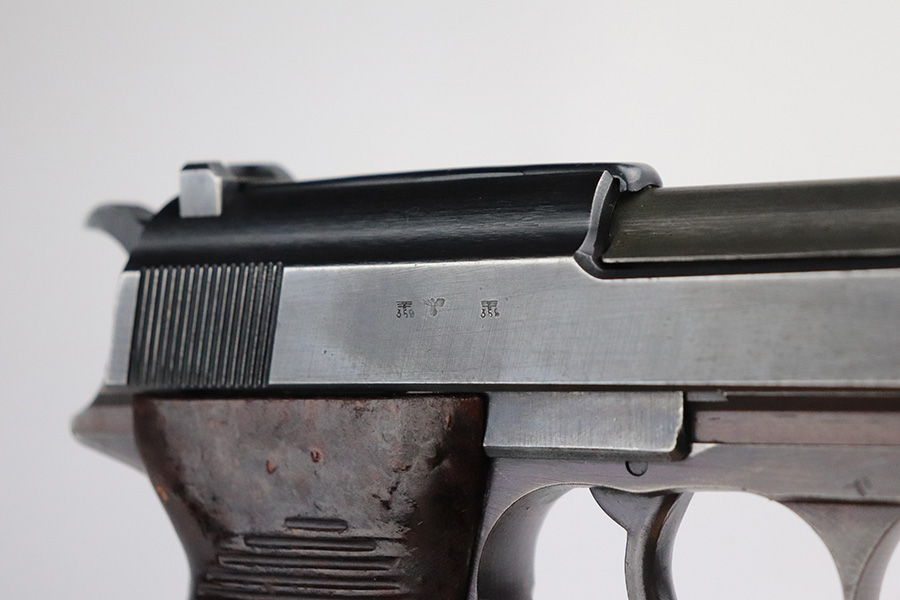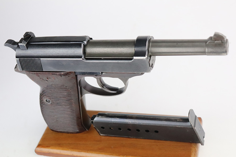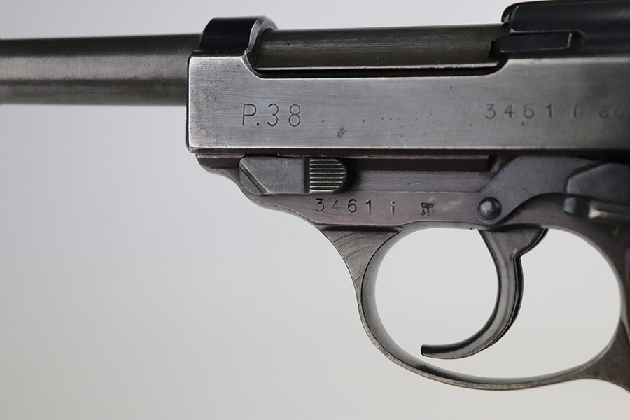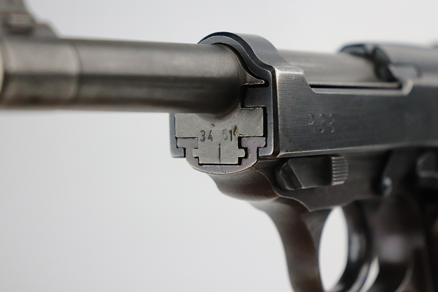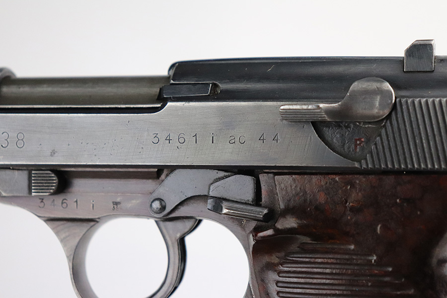 7/15/21 – This is an excellent example of a rare single-line AC 44 P.38 with a Dual Tone appearance. It has a blued frame and slide and a phosphate barrel. It is all matching and has the proper “Eagle 359” military proofs. It has retained about 95% of its original finish. There is minor thinning and patina on the front strap and minor wear on the high edges of the slide. Tiny dots on the barrel – common for phosphate small parts. Comes with excellent grips and a numbered Walther magazine that is mismatched to the gun. The rifling in the bore is slightly worn with minor pin-pricking throughout. De-cocker is functional.