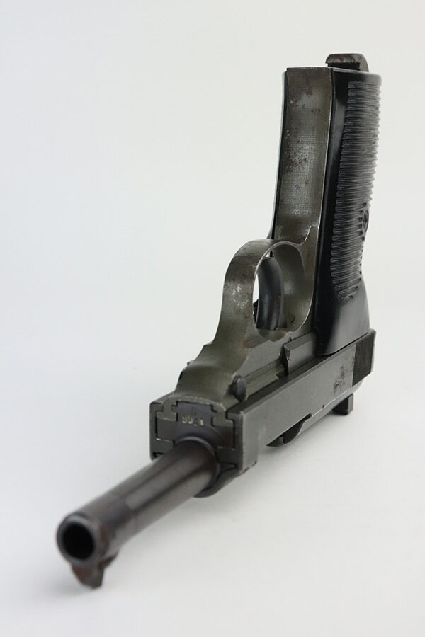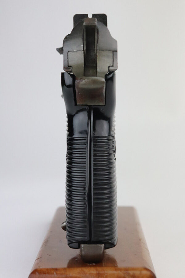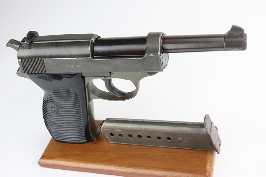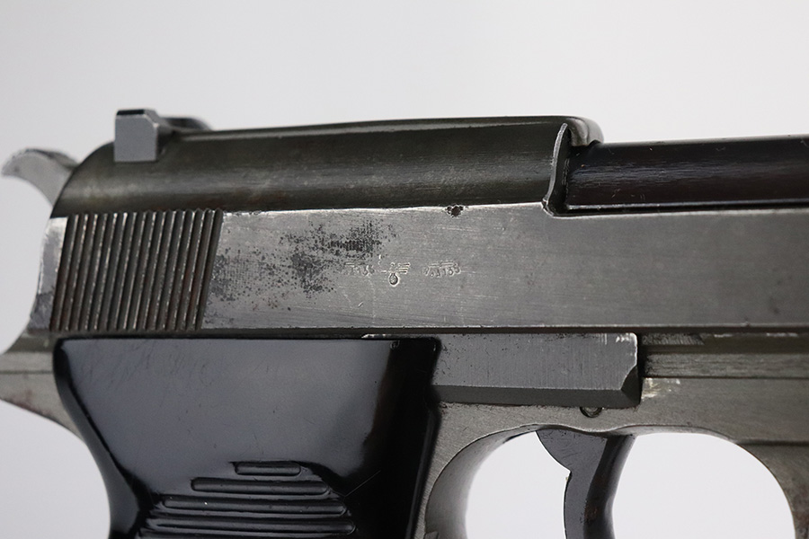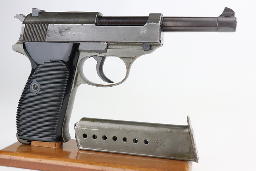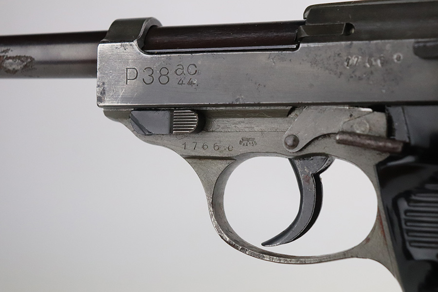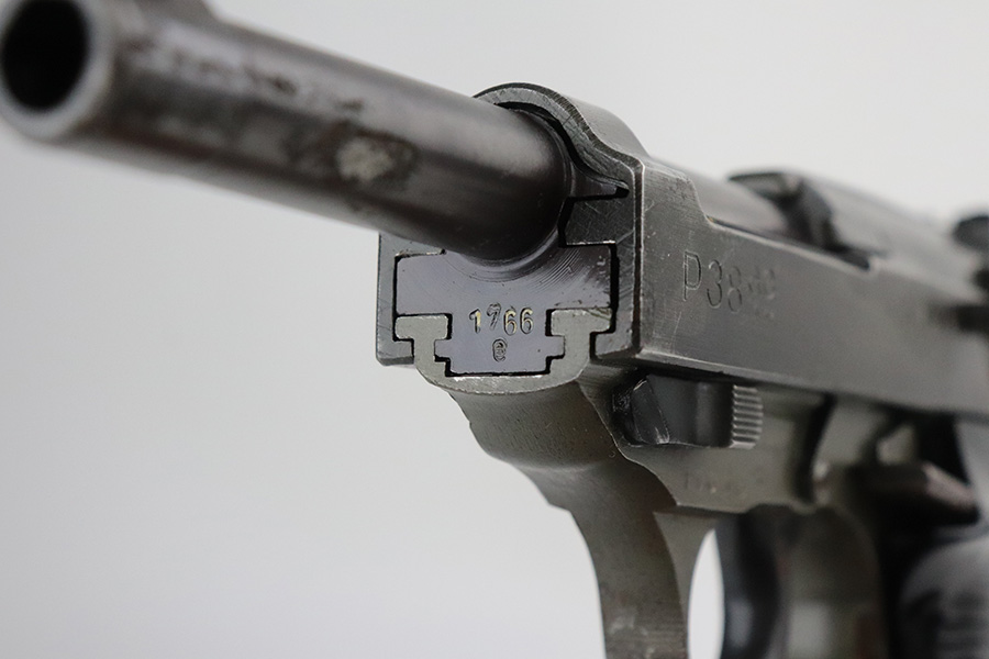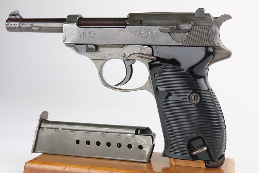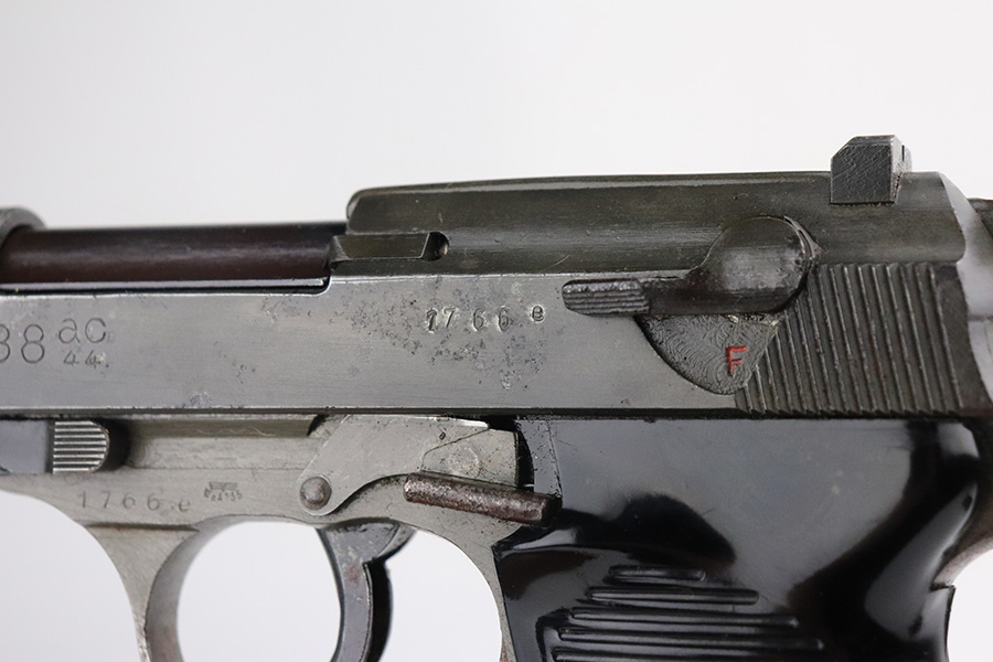 8/3/21 – This is a dual-tone Mauser P.38 issued to the Nazi military in 1944. It gets its dual-tone appearance from a blued barrel and phosphate slide and frame. This one has a rare “AC 44” FN-made slide. It is matching and has the proper “Waffen 135” military proofs. The phosphate finishes are a little difficult to rate, but we believe it has retained about 95%. There is just minor wear on the high edges. While there is little actual finish loss, there are areas of heavy pitting throughout, most noticeable on the barrel. Spotty discoloration and oxidation throughout, most noticeable on the left side of the slide, underside of the trigger guard, and on the front strap. Comes with excellent grips and a rare “U” marked phosphate magazine. The bore would be mint except for some minor freckling here and there. De-cocker is functional.