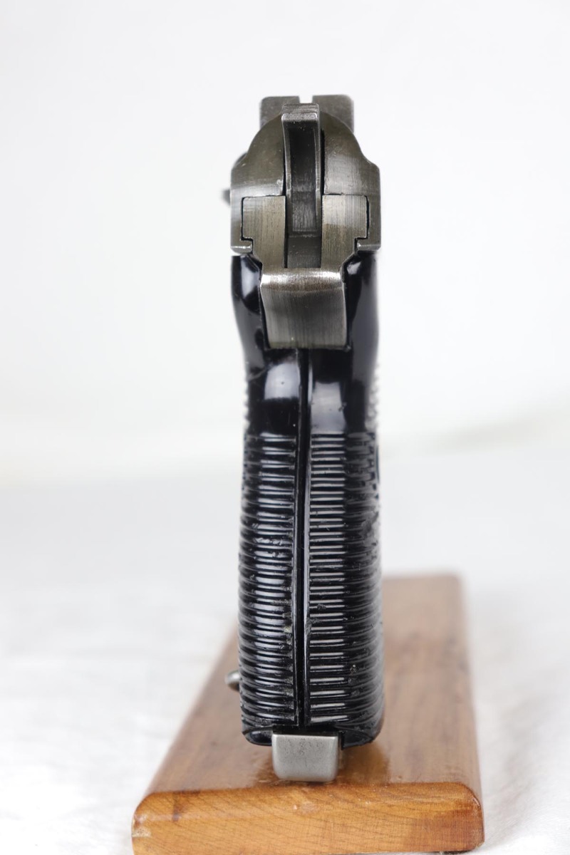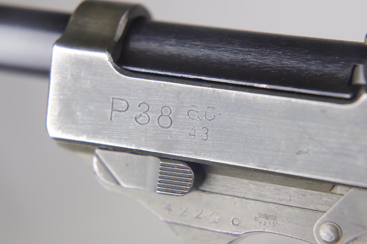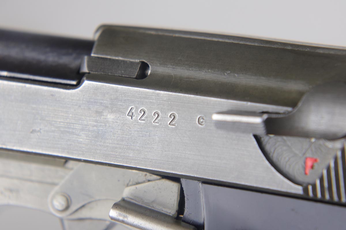 7/24/18 – This is a nice example of a rare Mauser P.38 – a dual-tone with ac 44 marked slide.  The slide shows the distinctive large ‘ac’ logo as the slide was manufactured at the FN factory in Belgium.  The pistol is all matching and correct with about 95% original finish remaining.  There is minor wear on the front edges of the slide and a little thinness to the phosphate finish overall.  Phosphate slide, frame and some small parts.  Blued barrel.  Decocker works properly.  Nice bore and grips, though the grips show various dings and scratches.