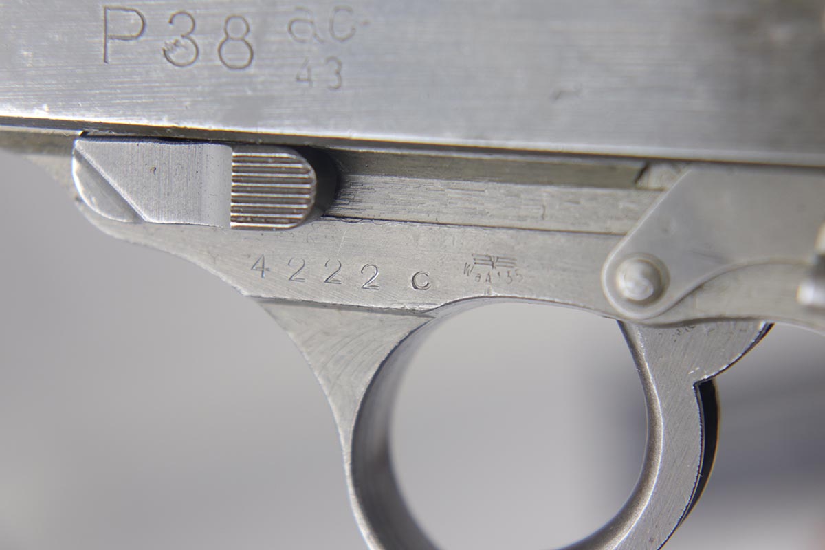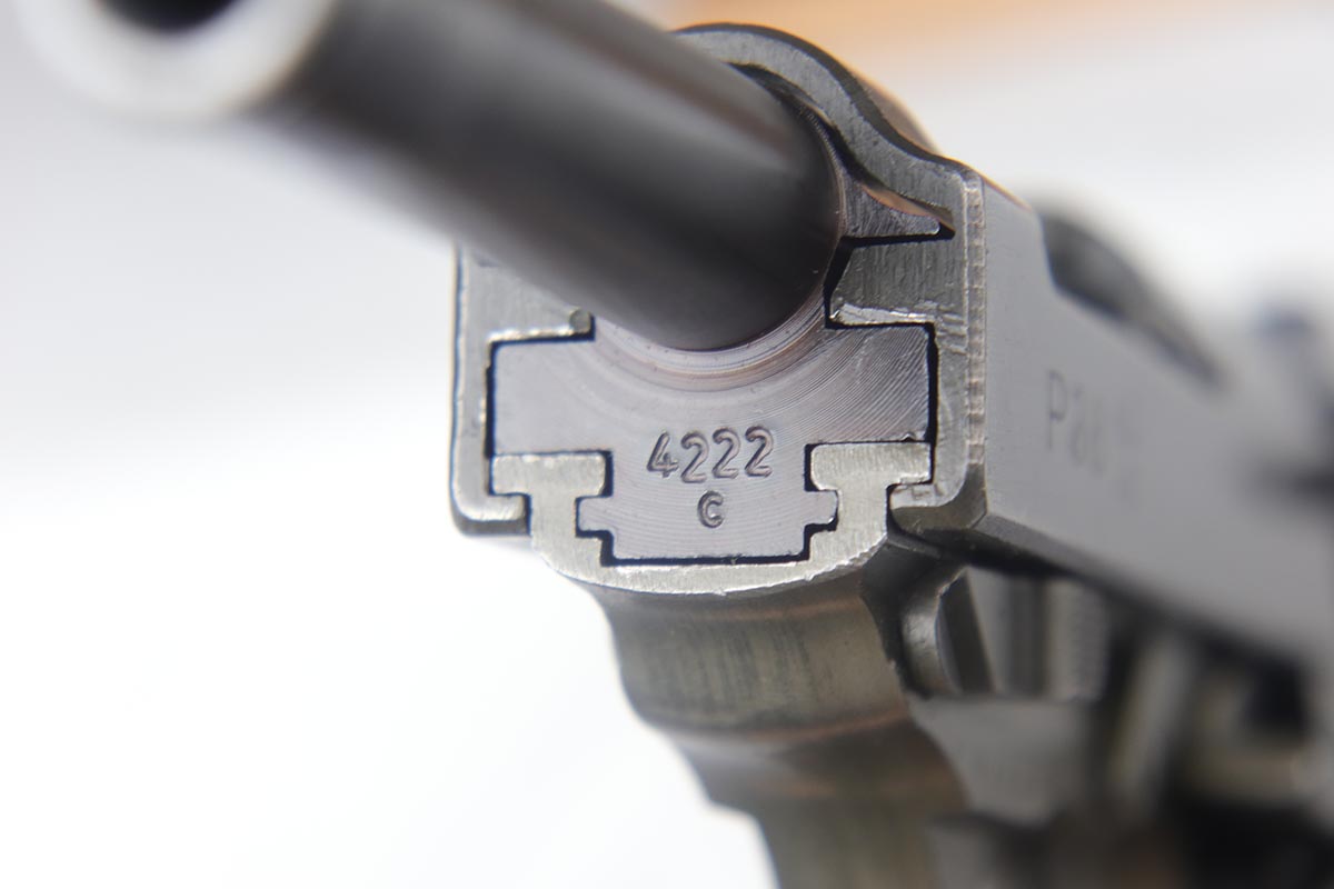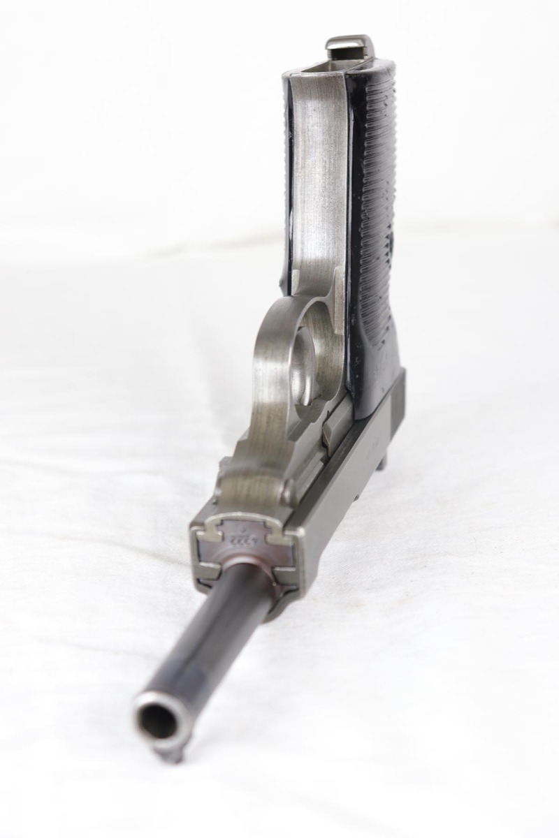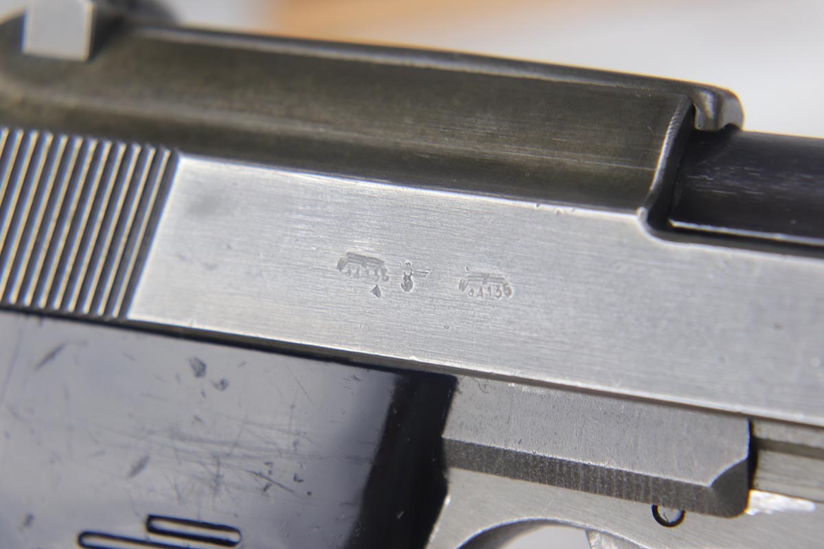 7/24/18 – This is a nice example of a rare Mauser P.38 – a dual-tone with ac 44 marked slide.  The slide shows the distinctive large ‘ac’ logo as the slide was manufactured at the FN factory in Belgium.  The pistol is all matching and correct with about 95% original finish remaining.  There is minor wear on the front edges of the slide and a little thinness to the phosphate finish overall.  Phosphate slide, frame and some small parts.  Blued barrel.  Decocker works properly.  Nice bore and grips, though the grips show various dings and scratches.