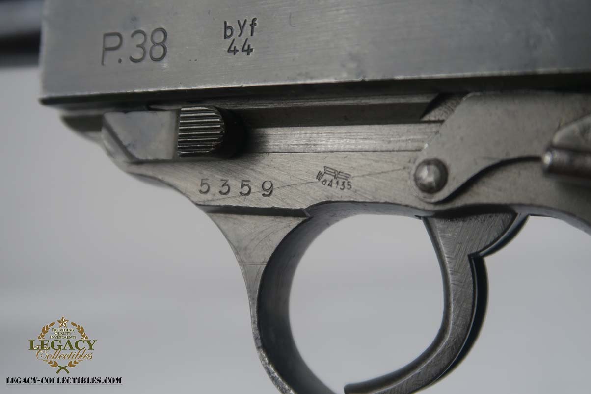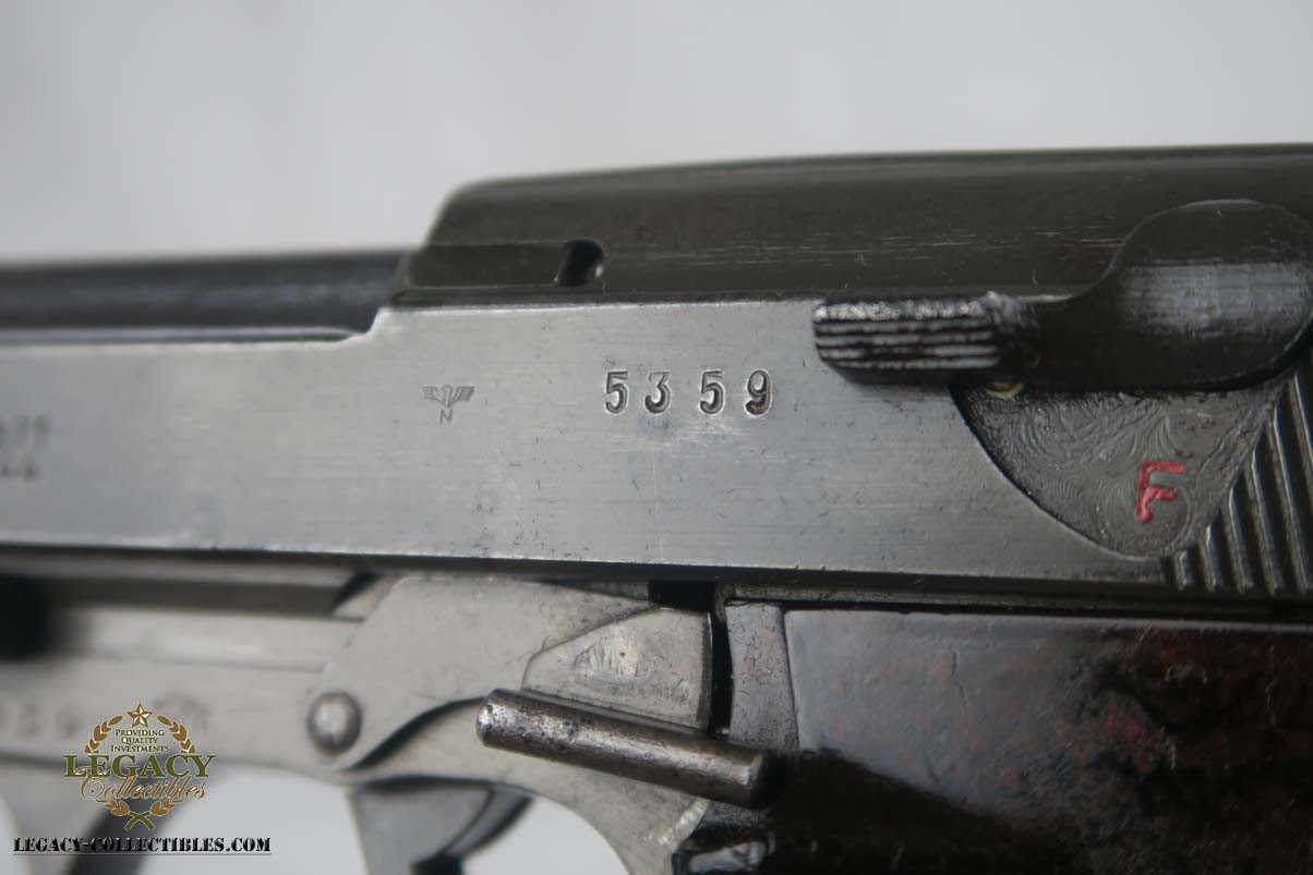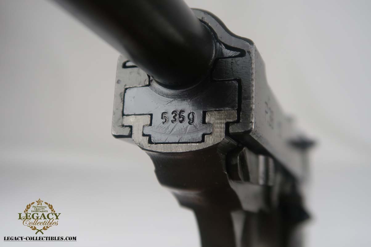 1/19/18 – This is a rare Mauser-made P.38, with police eagle/f marking on the right side of the slide. Only 1,500 of these pistols were produced! According to Jan Still, they fall between 4346-5501, and this one is 5359, making it one of the last of these produced! It has an excellent dual-tone finish, with phosphate frame and slide, as well as phosphate small parts, but a blued barrel. The finish on this late war pistol is a little crude, with a thin strap, and even a long machining line along the left side of the frame. But there is very little actual finish loss, and the bore is mint! The left side of the barrel does show some freckling though, but it is not deep. This pistol is all correct and matching, though the excellent grips do not quite match in color. If this is an issue for the buyer, I have no problem swapping one of the panels. All in all, this is an excellent example of a hard to find variation – one that we have not had available for offer in over a year!