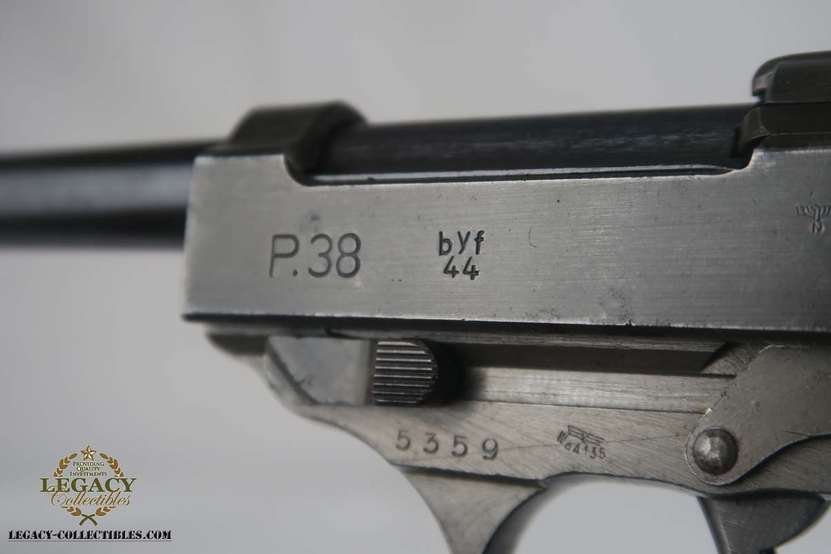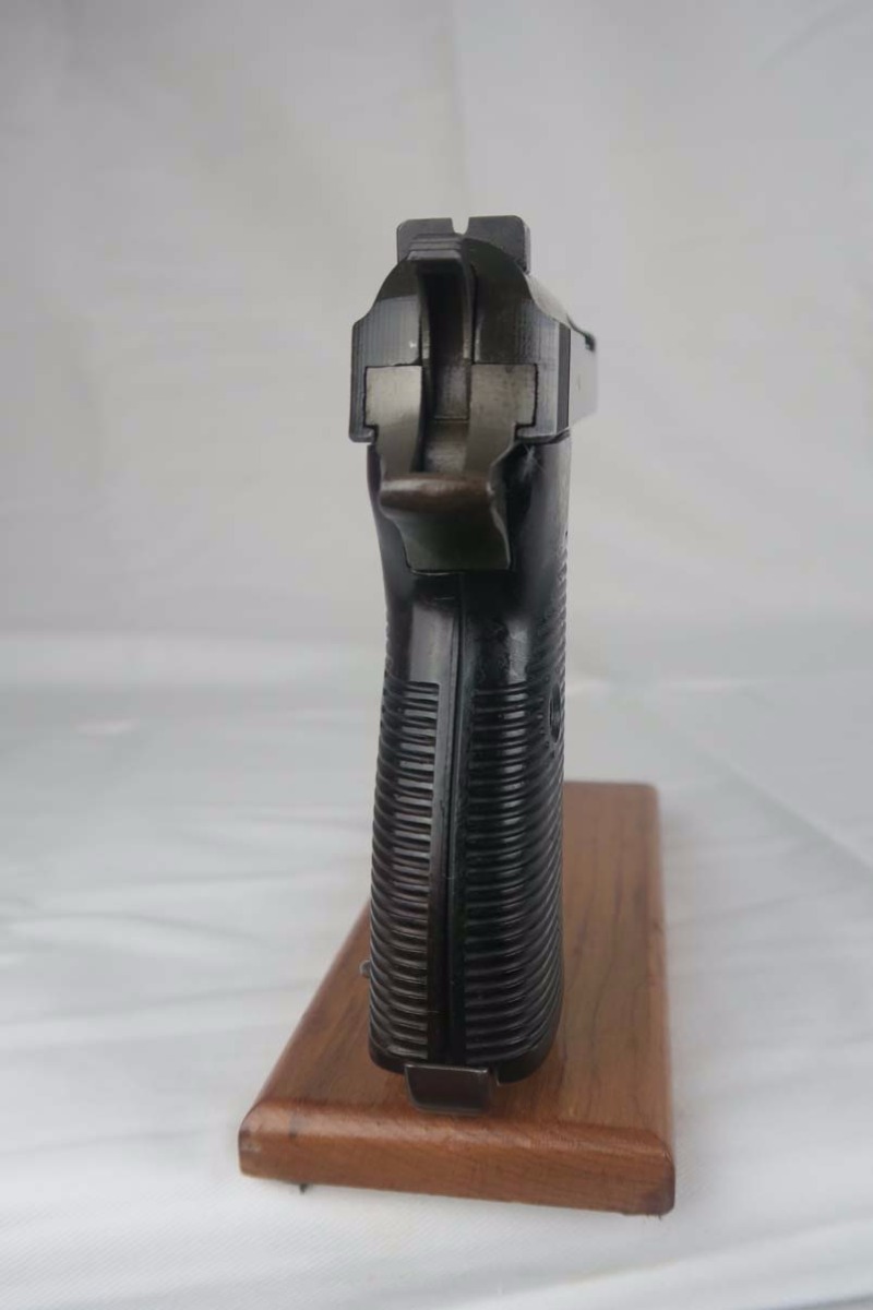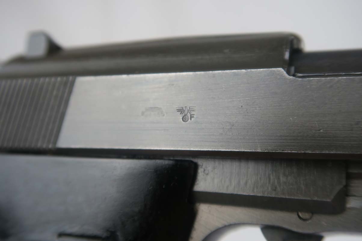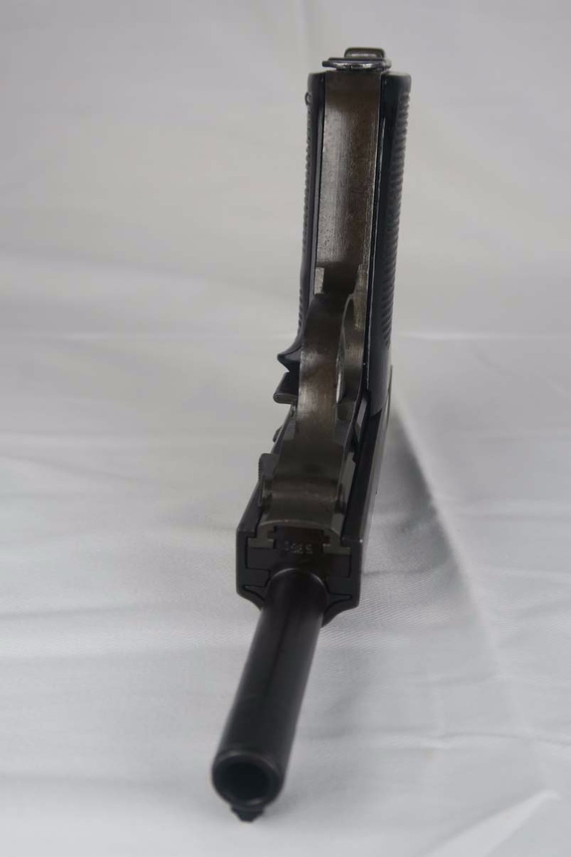 1/19/18 – This is a rare Mauser-made P.38, with police eagle/f marking on the right side of the slide. Only 1,500 of these pistols were produced! According to Jan Still, they fall between 4346-5501, and this one is 5359, making it one of the last of these produced! It has an excellent dual-tone finish, with phosphate frame and slide, as well as phosphate small parts, but a blued barrel. The finish on this late war pistol is a little crude, with a thin strap, and even a long machining line along the left side of the frame. But there is very little actual finish loss, and the bore is mint! The left side of the barrel does show some freckling though, but it is not deep. This pistol is all correct and matching, though the excellent grips do not quite match in color. If this is an issue for the buyer, I have no problem swapping one of the panels. All in all, this is an excellent example of a hard to find variation – one that we have not had available for offer in over a year!