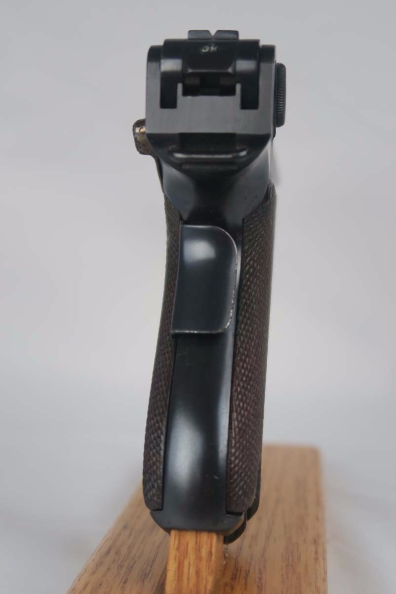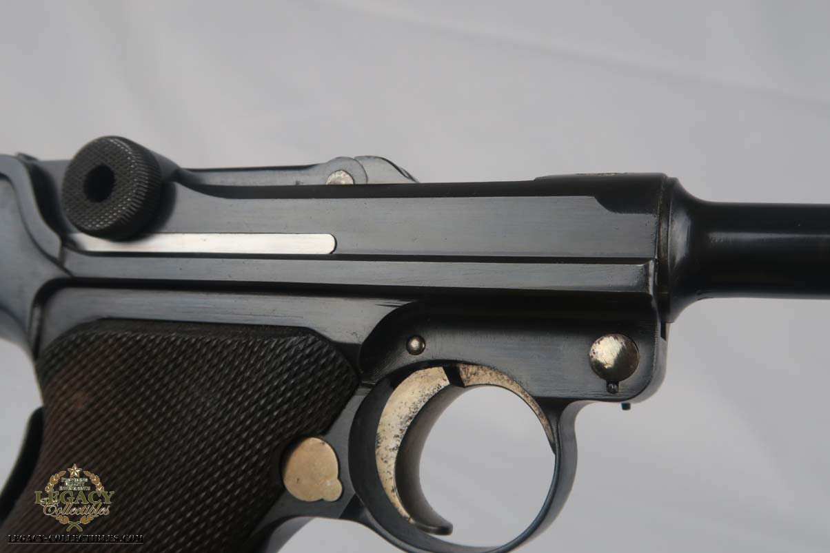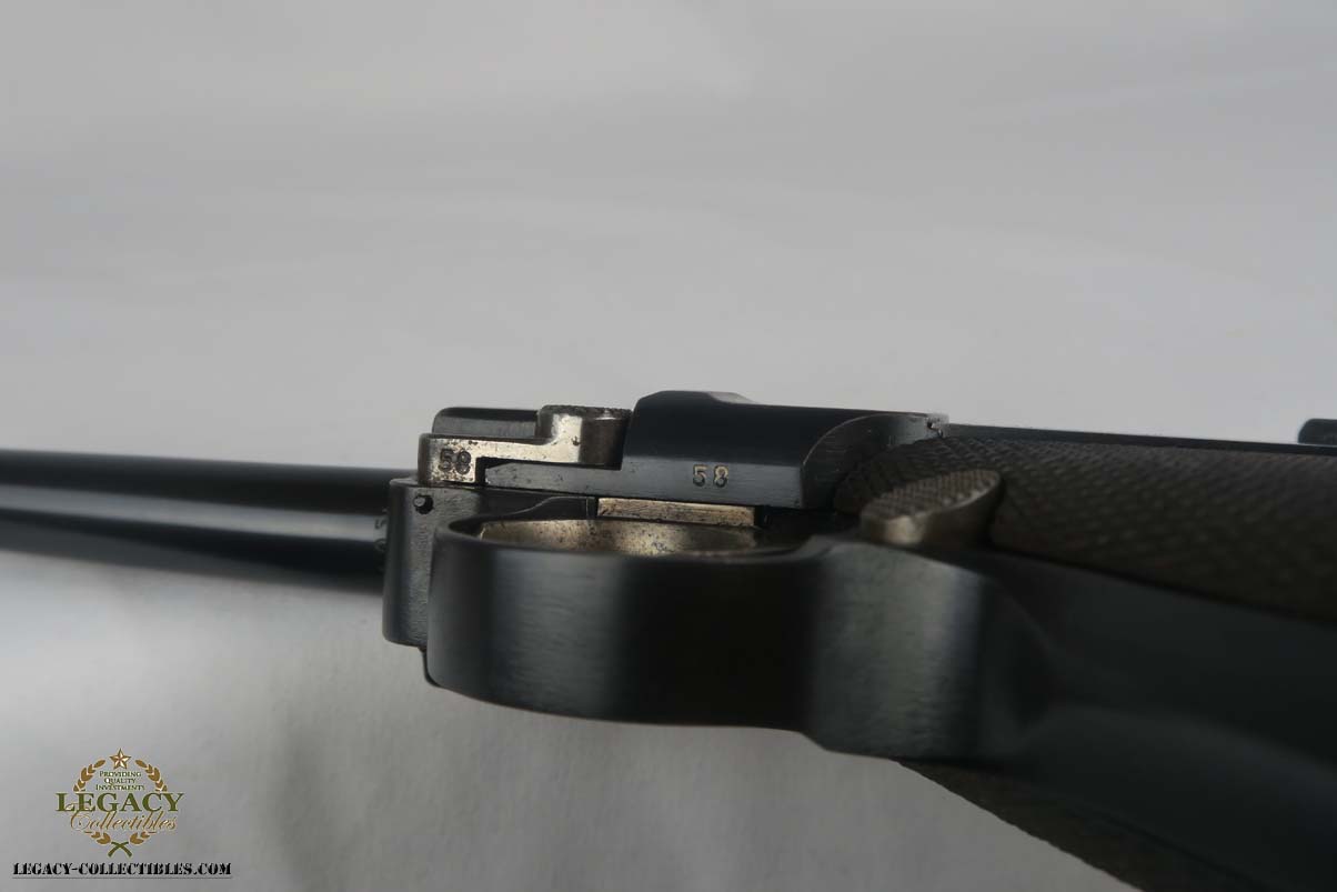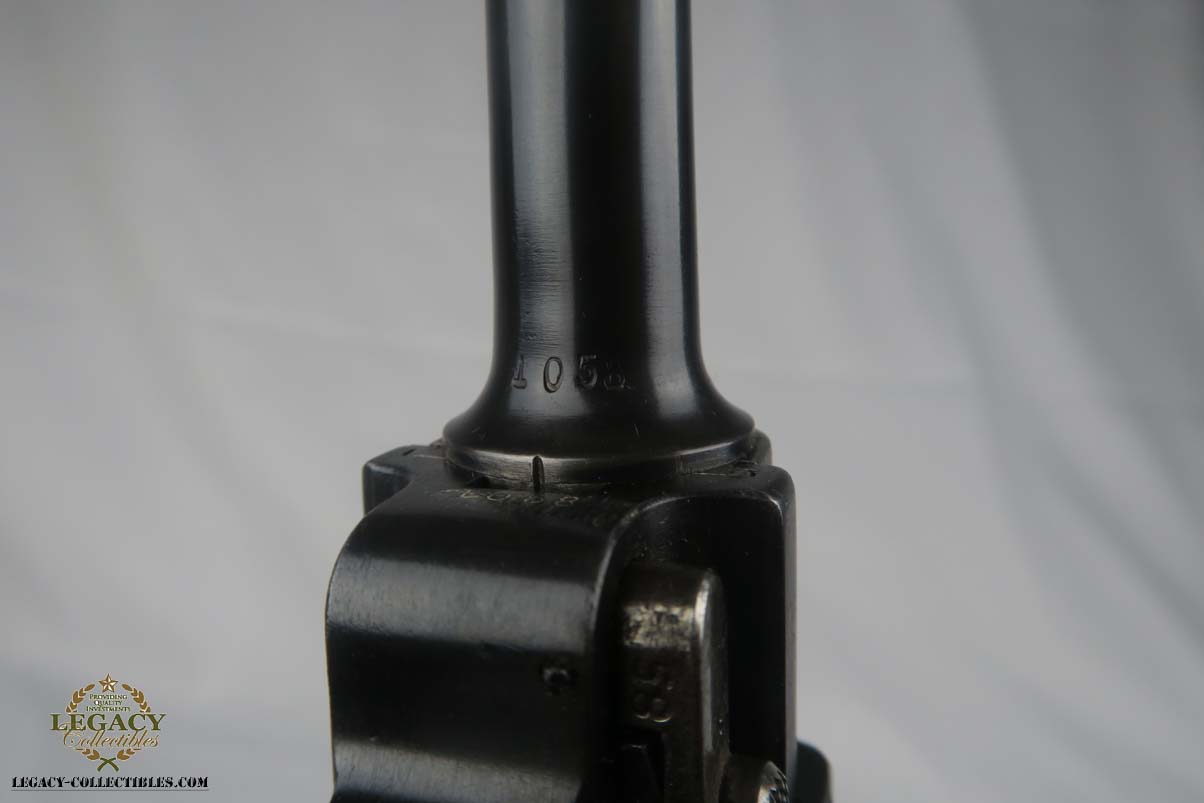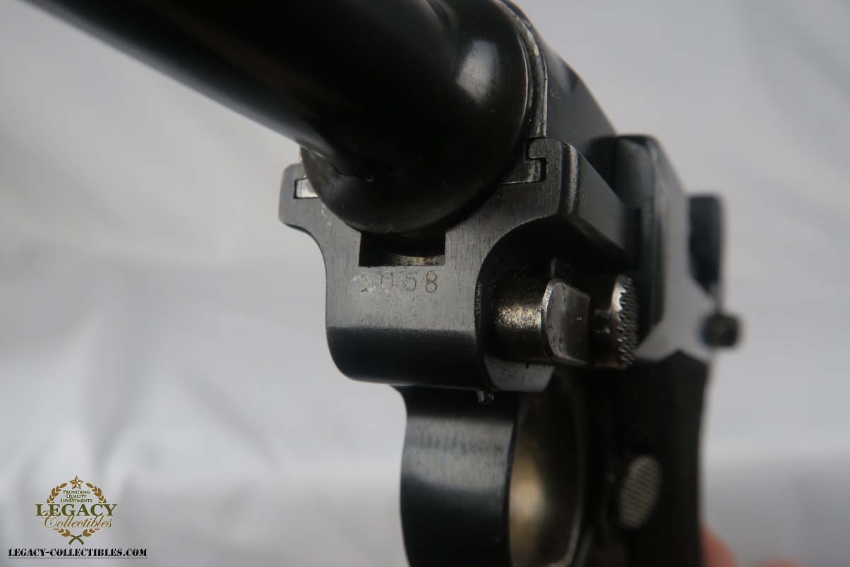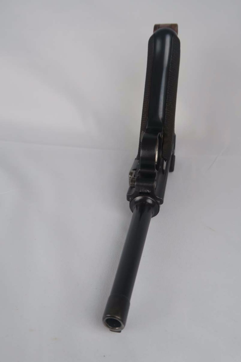 5/2/17 – Excellent looking Bulgarian luger with the Bulgarian crest on the receiver. Finish looks all original as it looks excellent but aged with patina. As referenced in Jan Still’s Central Powers Pistols, there were only about 1,500 of these produced, with serials from 1-1500. Compare that to the 1908 Bulgarian, which total 10,000! They are very rare and usually quite worn, but this one looks excellent – however it could be an old re-blue, just not 100% sure on this one. Some were sent back to the arsenal after WW1 to be re-furbished and I’m not sure if this one was. Serial number is 1058 and all numbered parts are matching with the exception of the blank bottom magazine. The grips are also unnumbered but the are clearly original and fit perfectly. Interior of the frame is properly in the white as is the receiver. Hold open and firing pin are unnumbered which I believe is correct. Straw parts are about 60% and look to be all original. Comes in 30 caliber luger – 100 MM barrel length. Bore is shiny and strong. The gun seems consistently to have little use. No lug stock on the back of the frame (correct for the gun). Overall a nice example of a hard to find Bulgarian contract luger.