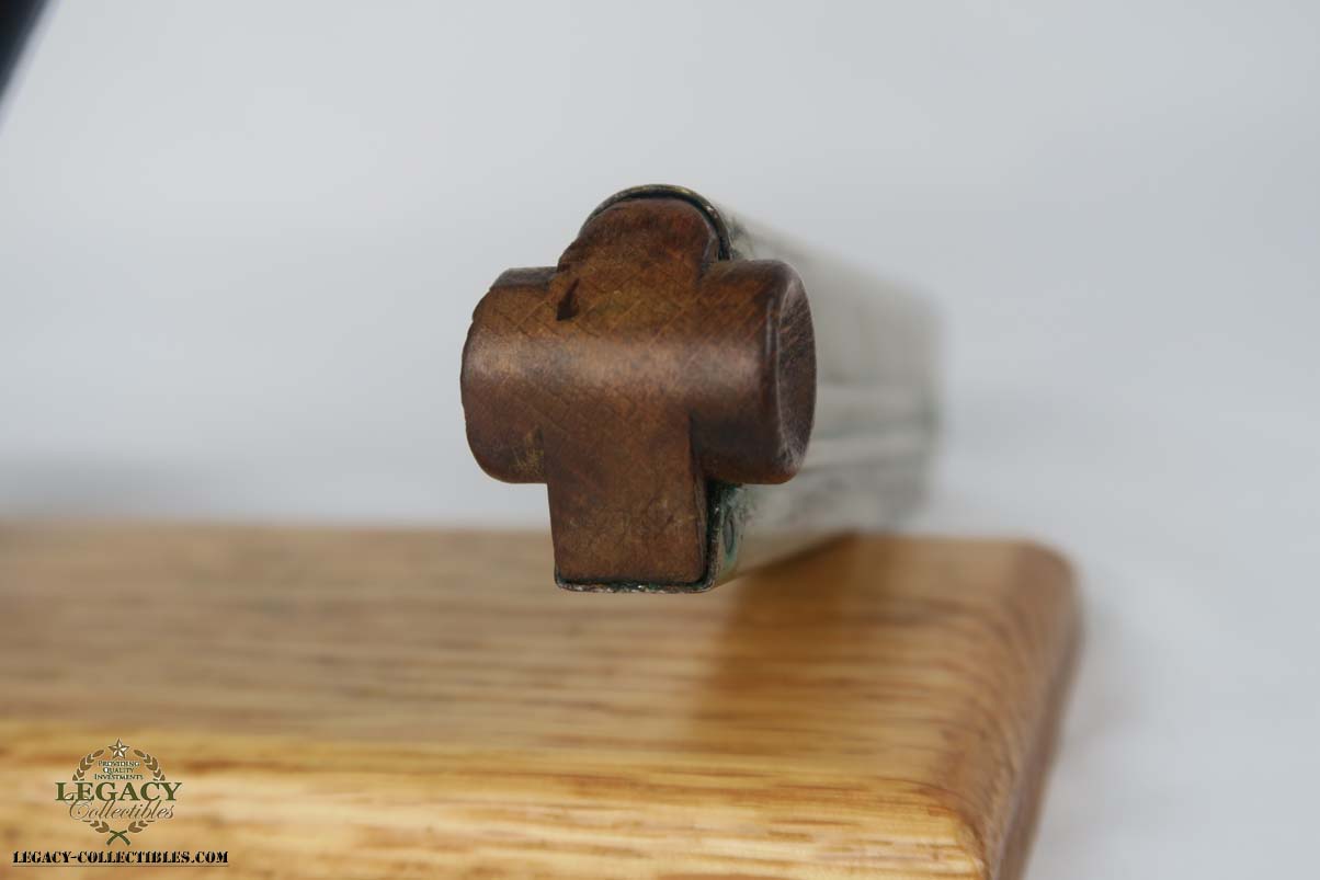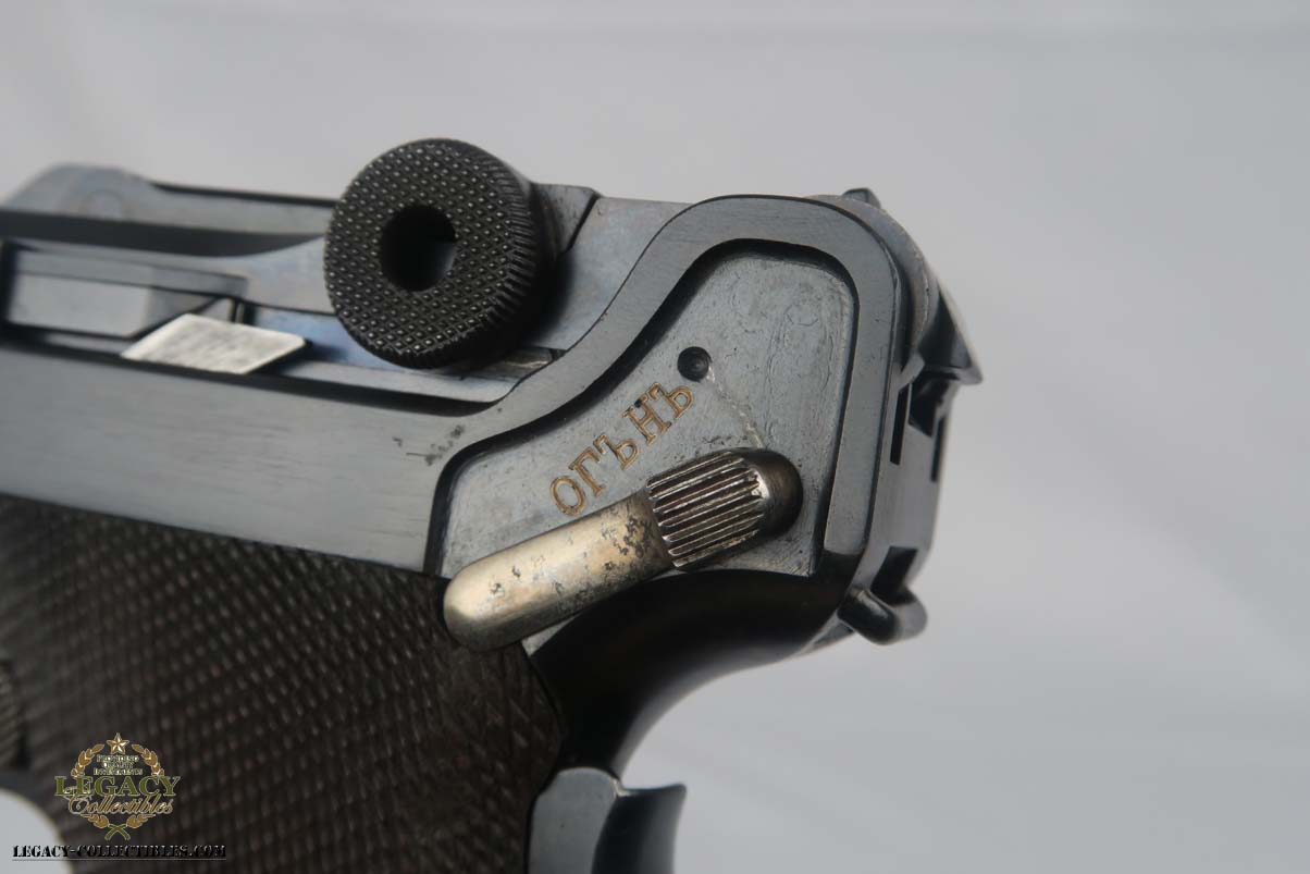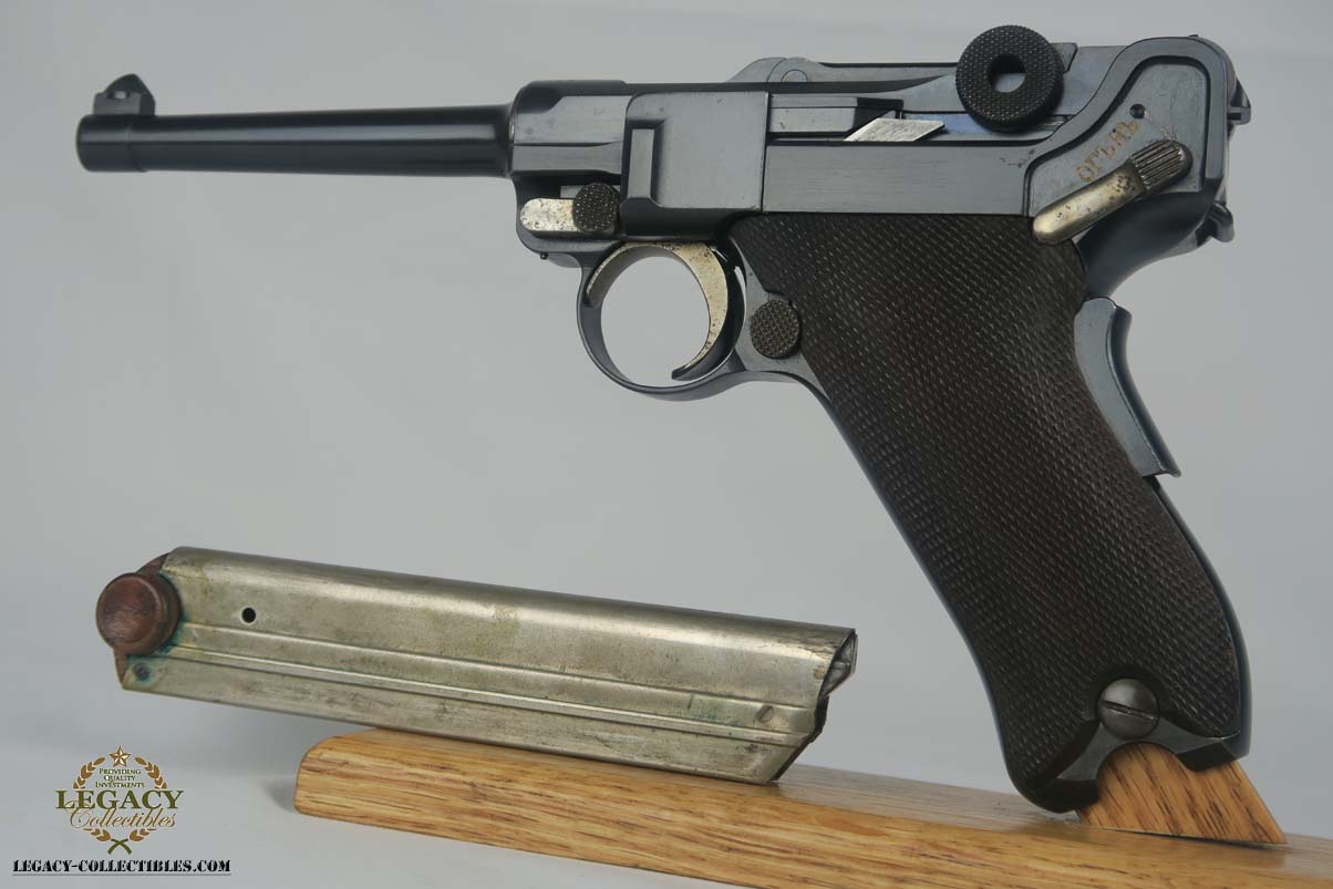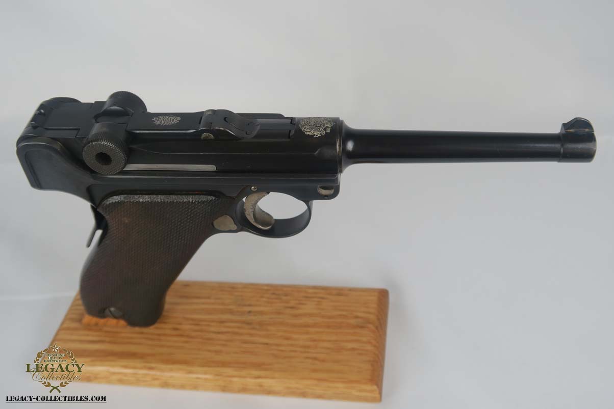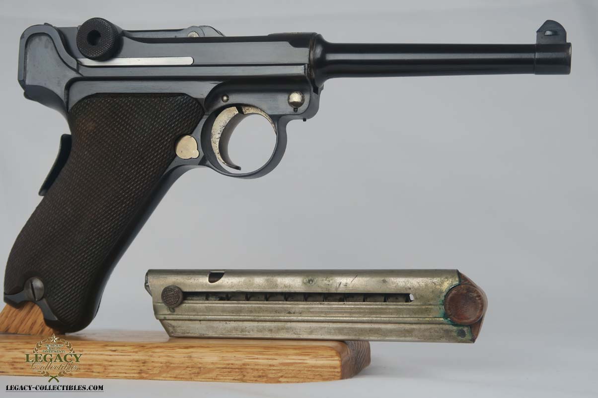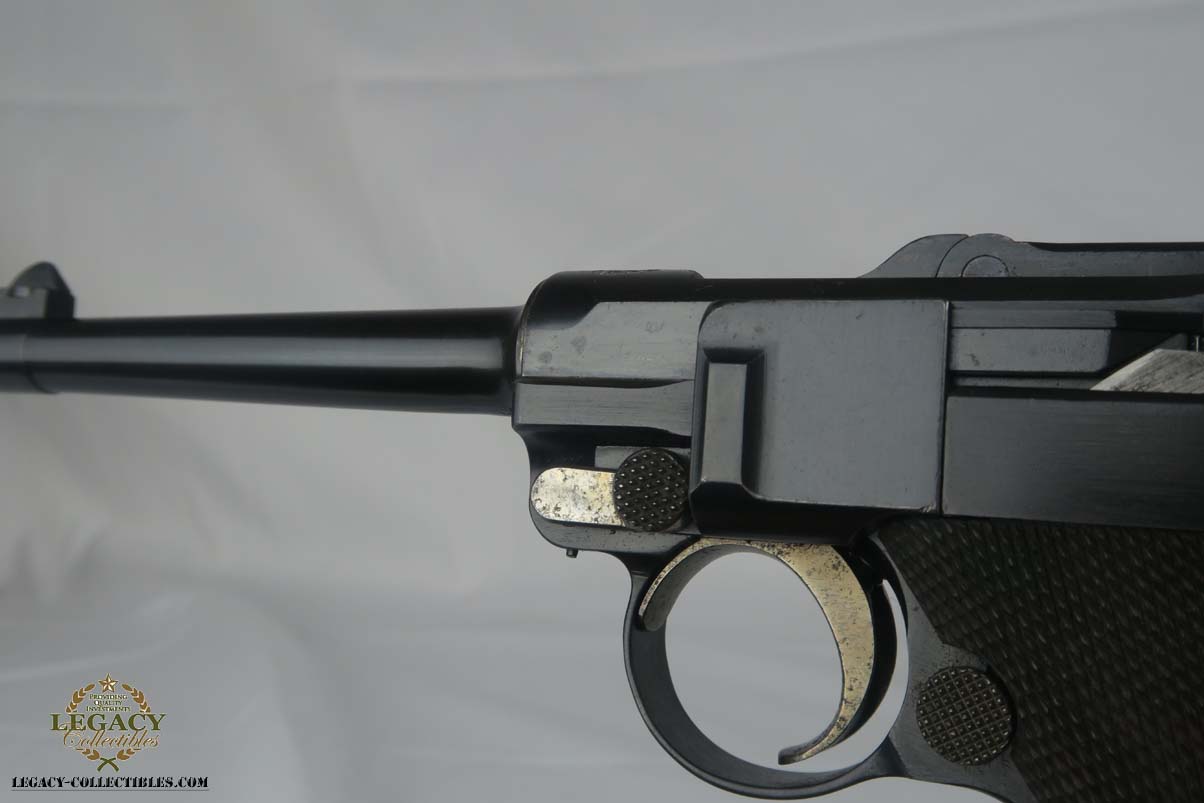 5/2/17 – Excellent looking Bulgarian luger with the Bulgarian crest on the receiver. Finish looks all original as it looks excellent but aged with patina. As referenced in Jan Still’s Central Powers Pistols, there were only about 1,500 of these produced, with serials from 1-1500. Compare that to the 1908 Bulgarian, which total 10,000! They are very rare and usually quite worn, but this one looks excellent – however it could be an old re-blue, just not 100% sure on this one. Some were sent back to the arsenal after WW1 to be re-furbished and I’m not sure if this one was. Serial number is 1058 and all numbered parts are matching with the exception of the blank bottom magazine. The grips are also unnumbered but the are clearly original and fit perfectly. Interior of the frame is properly in the white as is the receiver. Hold open and firing pin are unnumbered which I believe is correct. Straw parts are about 60% and look to be all original. Comes in 30 caliber luger – 100 MM barrel length. Bore is shiny and strong. The gun seems consistently to have little use. No lug stock on the back of the frame (correct for the gun). Overall a nice example of a hard to find Bulgarian contract luger.