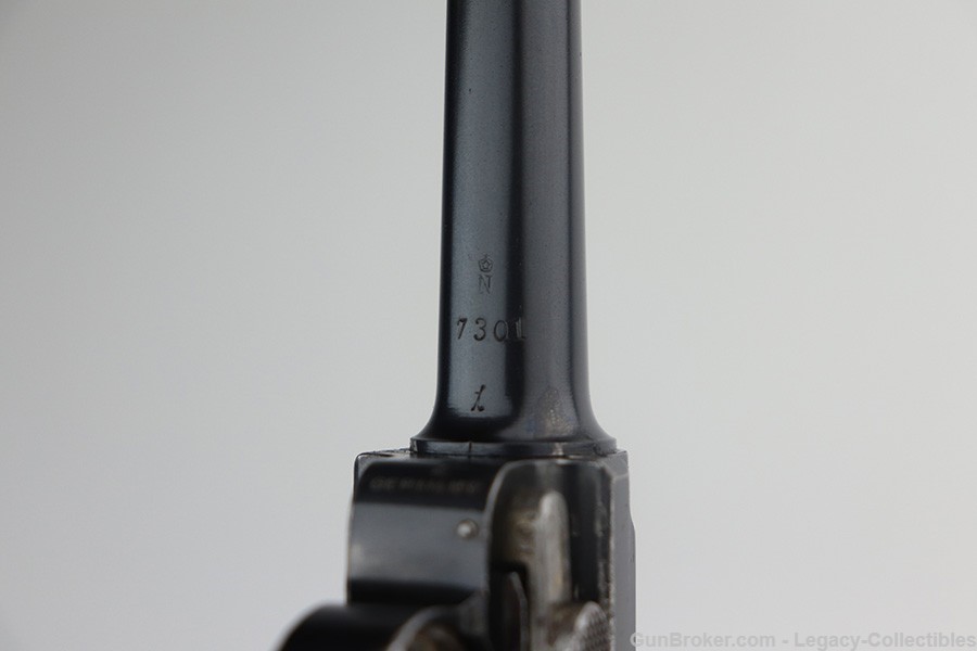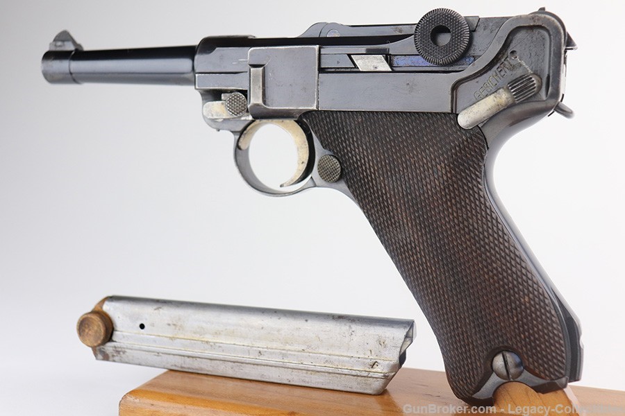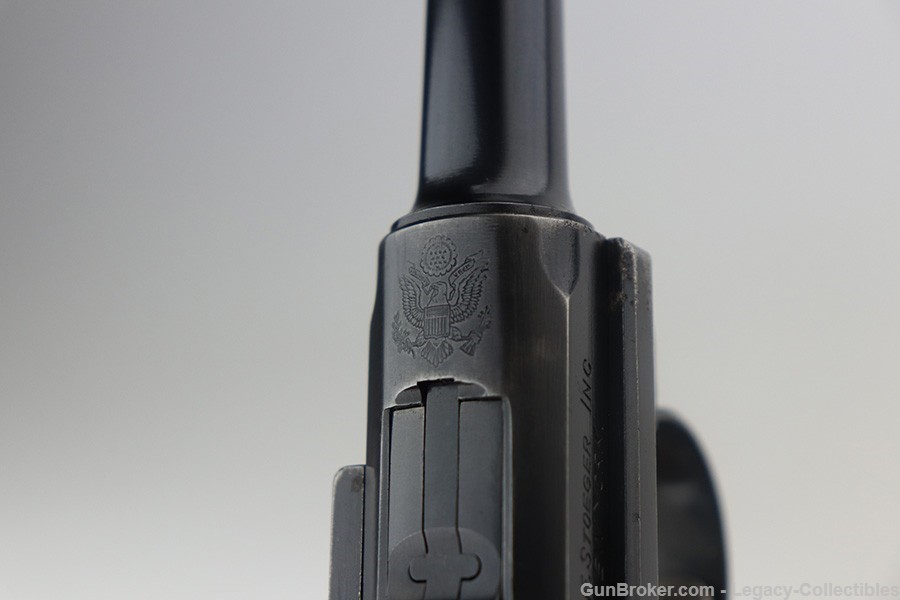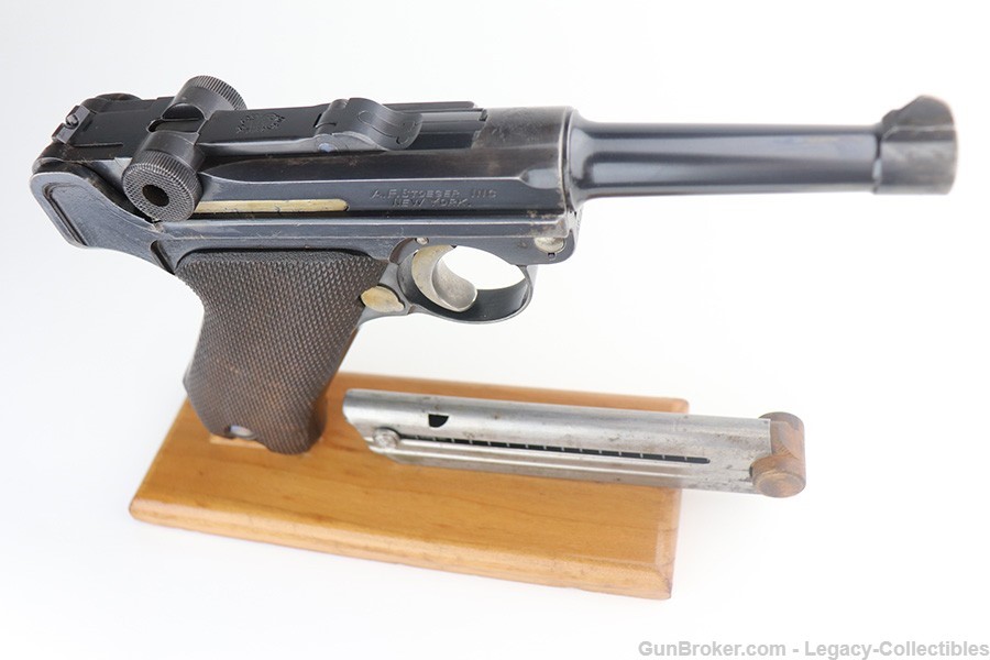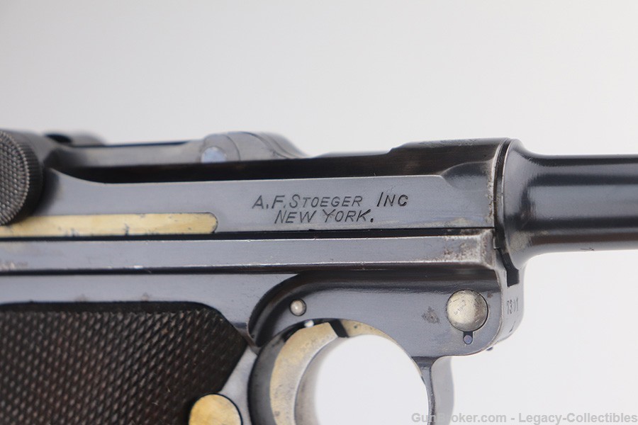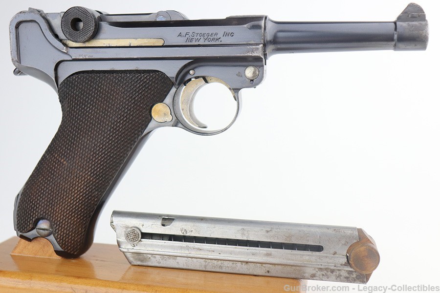 7/13/21 – This is a rare and highly desirable DWM Luger that is marked ‘A.F. Stoeger Inc New York’ on the receiver. The firm of A.F. Stoeger Inc became the sole importer of DWM Luger pistols in the United States in 1922. The order was for only 2,500 pistols, and their configuration varied. This one features the American Eagle crest over the chamber which was designed specifically for marketing Lugers to the U.S. market. Most documented examples are in the ‘t’ or ‘u’ blocks, and this one is in the ‘t’ block. This one has 90-93% of the original blue remaining, with minor high edge wear and some freckling around the muzzle. Also some thinning on the back strap, and minor pitting on rear of frame. The grips are unmarked but appear original to the gun based off fit and wear. Strong, shiny bore. Chambered for .30 Luger. Commercial magazine with wood base that is marked “GERMANY”. No import marks.