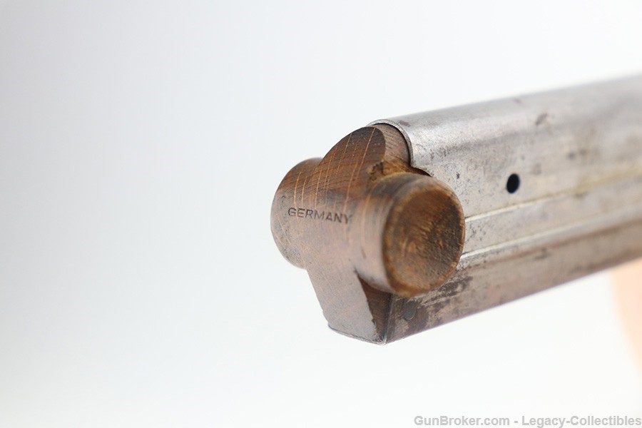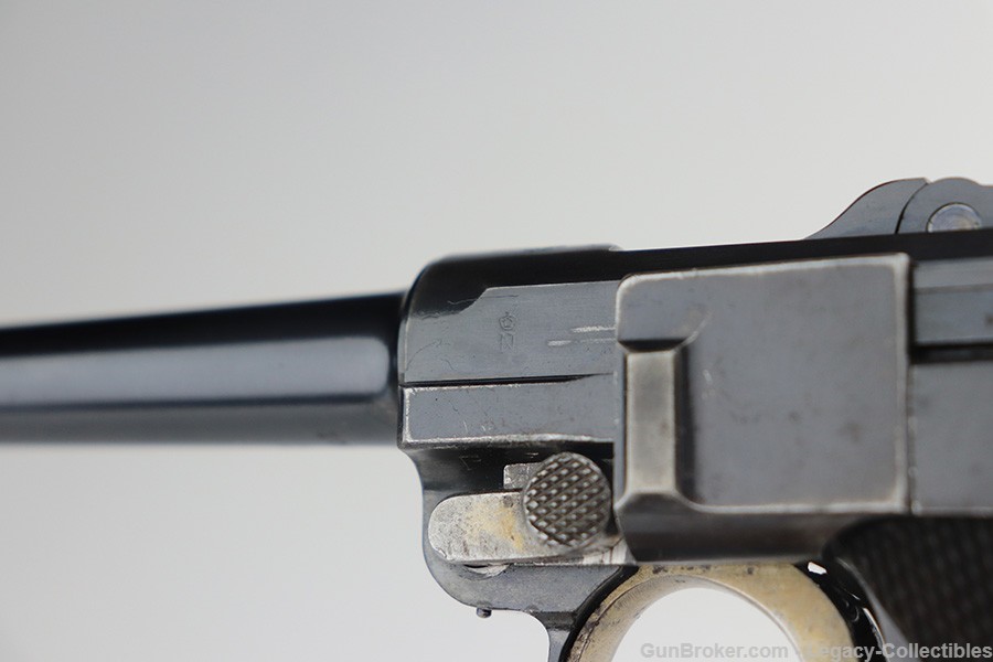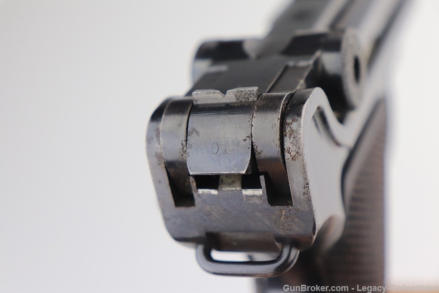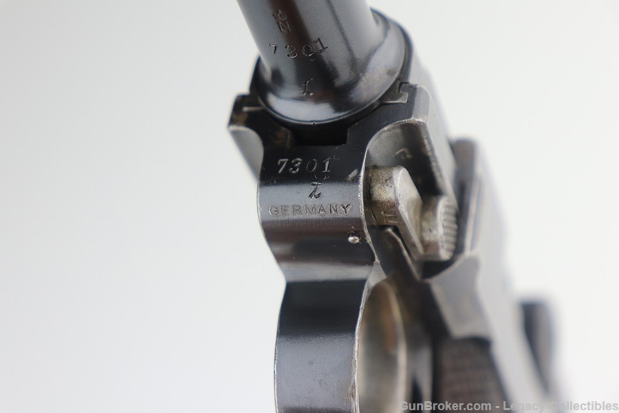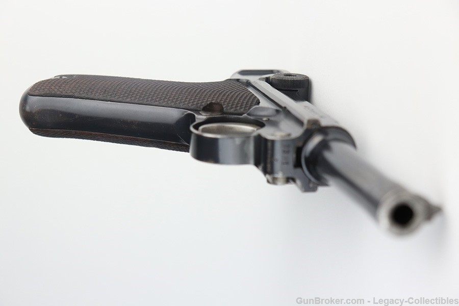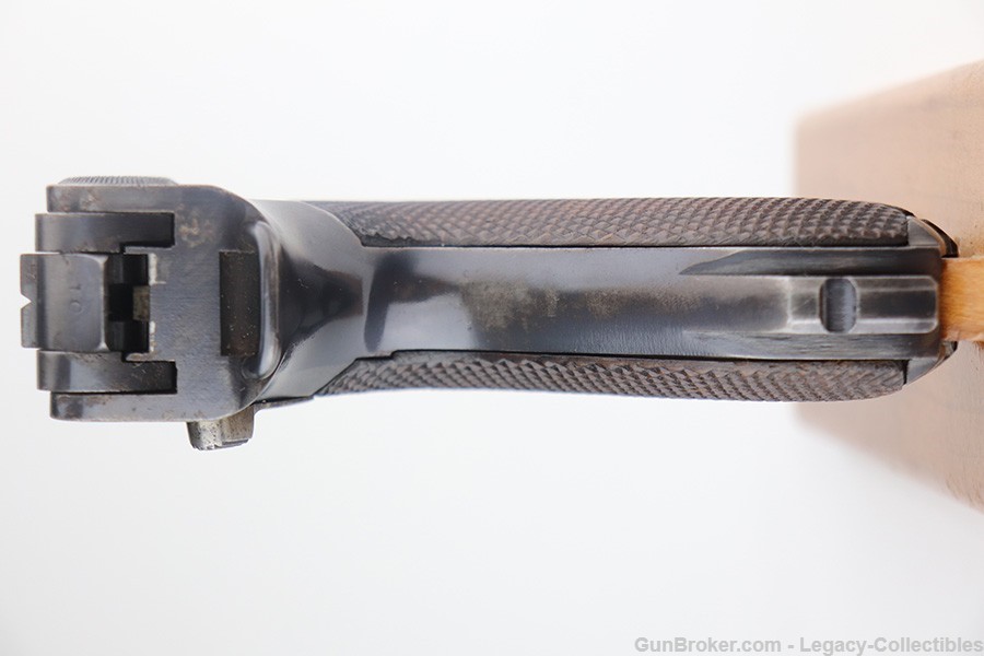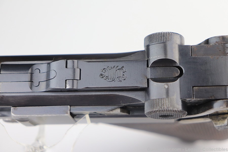 7/13/21 – This is a rare and highly desirable DWM Luger that is marked ‘A.F. Stoeger Inc New York’ on the receiver. The firm of A.F. Stoeger Inc became the sole importer of DWM Luger pistols in the United States in 1922. The order was for only 2,500 pistols, and their configuration varied. This one features the American Eagle crest over the chamber which was designed specifically for marketing Lugers to the U.S. market. Most documented examples are in the ‘t’ or ‘u’ blocks, and this one is in the ‘t’ block. This one has 90-93% of the original blue remaining, with minor high edge wear and some freckling around the muzzle. Also some thinning on the back strap, and minor pitting on rear of frame. The grips are unmarked but appear original to the gun based off fit and wear. Strong, shiny bore. Chambered for .30 Luger. Commercial magazine with wood base that is marked “GERMANY”. No import marks.