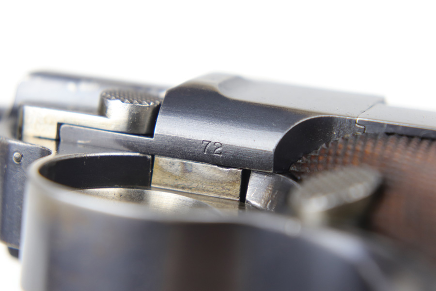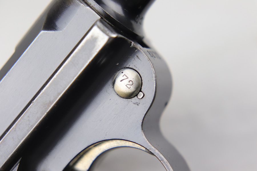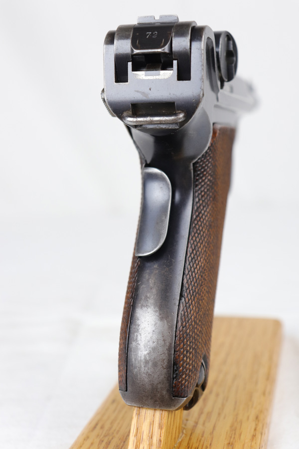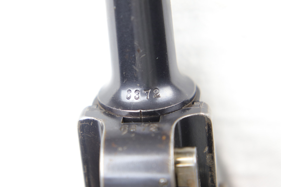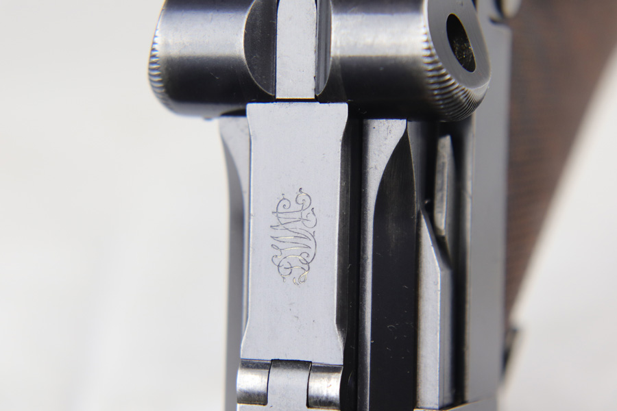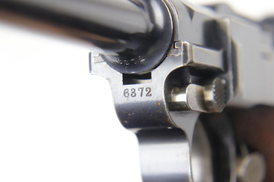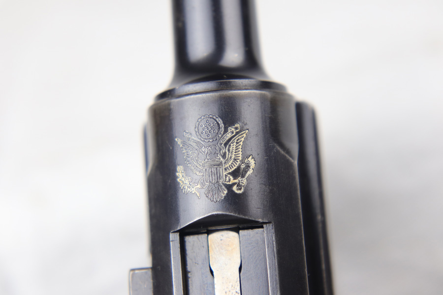 10/22/18 – Here we have an extremely rare and correct American Eagle Army Test Luger produced by DWM. In April of 1901, the United States Board of Ordnance and Fortifications put in an order for 1,000 of these Lugers following test trials in which the model was fired 2,000 times under the harshest conditions possible. These Lugers feature the Great Seal over the chamber, which was not included upon request, but rather was found to be a great sales tool for the Swiss market by DWM following their initial sales of the same model but featuring the Swiss sunburst. The characteristics that separate these American Test Eagle Lugers from the other Model 1900 Lugers are the lack of proofs, the lack of a ‘GERMANY’ import stamp, and the last two digits of the serial number on the right end of the takedown lever. This particular pistol features grips that are numbered and matching to each other but slightly off from the gun (76 vs. 72), and a rare, early wood-bottom magazine that is numbered to another early Luger. It has the serial marked sideways, and the bottom is in great condition with only minor dings. The pistol rates at about 80% bluing, with thinning of the straps and some finish loss on the barrel and sideplate. Very nice bore with no major flaws. As of the printing of Michael Reese’s book on the subject, there was only about 100 of these known and identified in the accepted serial range (6099-7098)!
