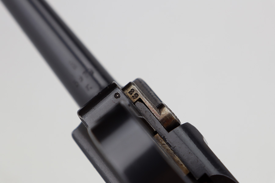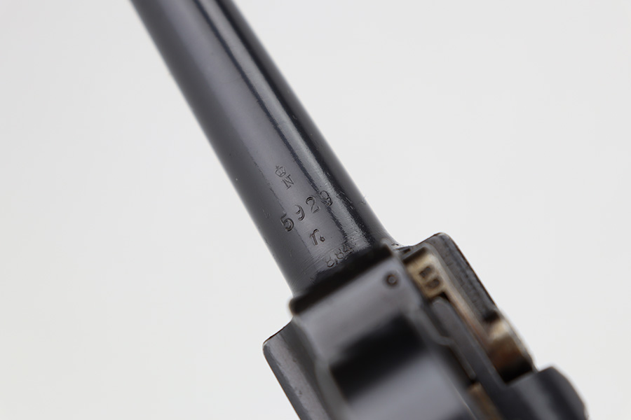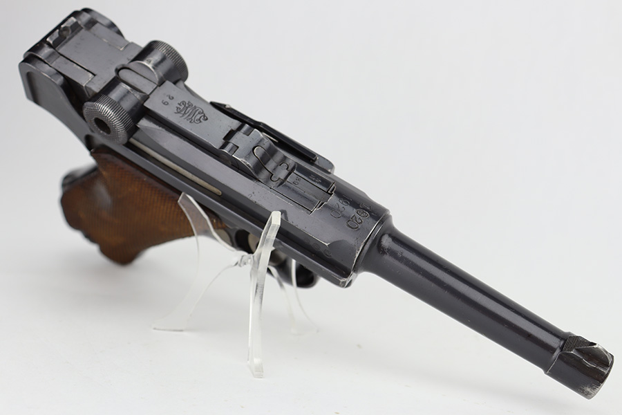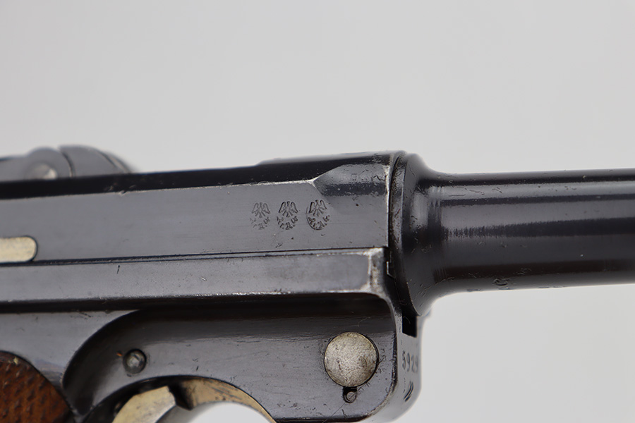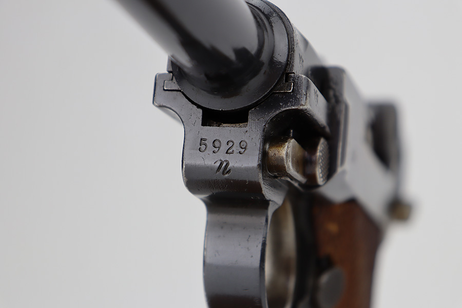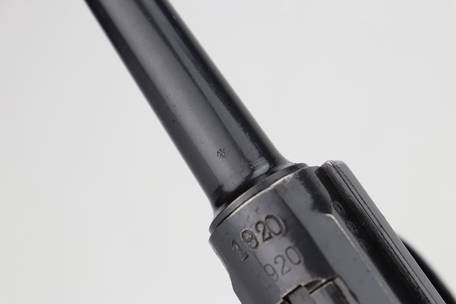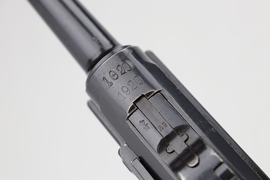 6/14/23 – This is an excellent example of a rare 1920/1920 double-date DWM Luger. The first “1920” (closest to the ejection port) indicates the date of manufacture, 1920. The second “1920” (closest to the muzzle) is a government property marking. Due to restrictions under the Treaty of Versailles, Germany was only allowed to have a certain amount of guns in military and police service. This marking indicates it was ear-marked for government service. This particular gun was issued to the German police force in 1920. It has an added police sear safety and Weimar-era police eagle markings on the right side of the slide. It also comes with one matching police arsenal-numbered magazine. The magazine was made by Simson and has the proper “Eagle 6” Simson proof. “Crown N” proofs on the slide, frame, and barrel indicate it ended up in the commercial market at some point. The gun itself is all matching and has retained about 95% of its finish. Minor wear around the muzzle, on the side plate, and on the left side of the frame. Some tiny pits under the finish on the grip straps. Fitted with un-numbered wood grips – noticeable bruise on the right side. The left grip panel has a WW2-era “S/42” armorers replacement marking, and the right grip has a Nazi-era “Eagle 63” proof. Excellent bore with strong rifling.