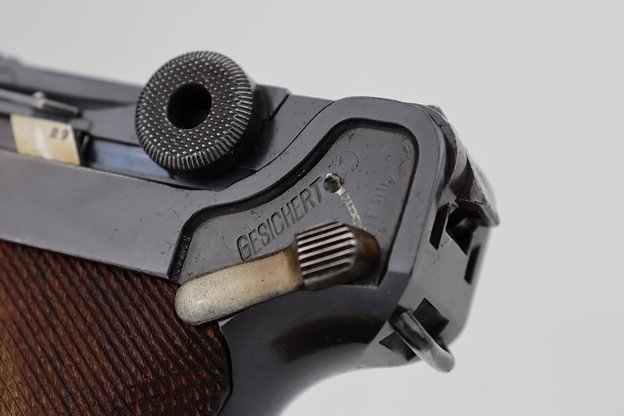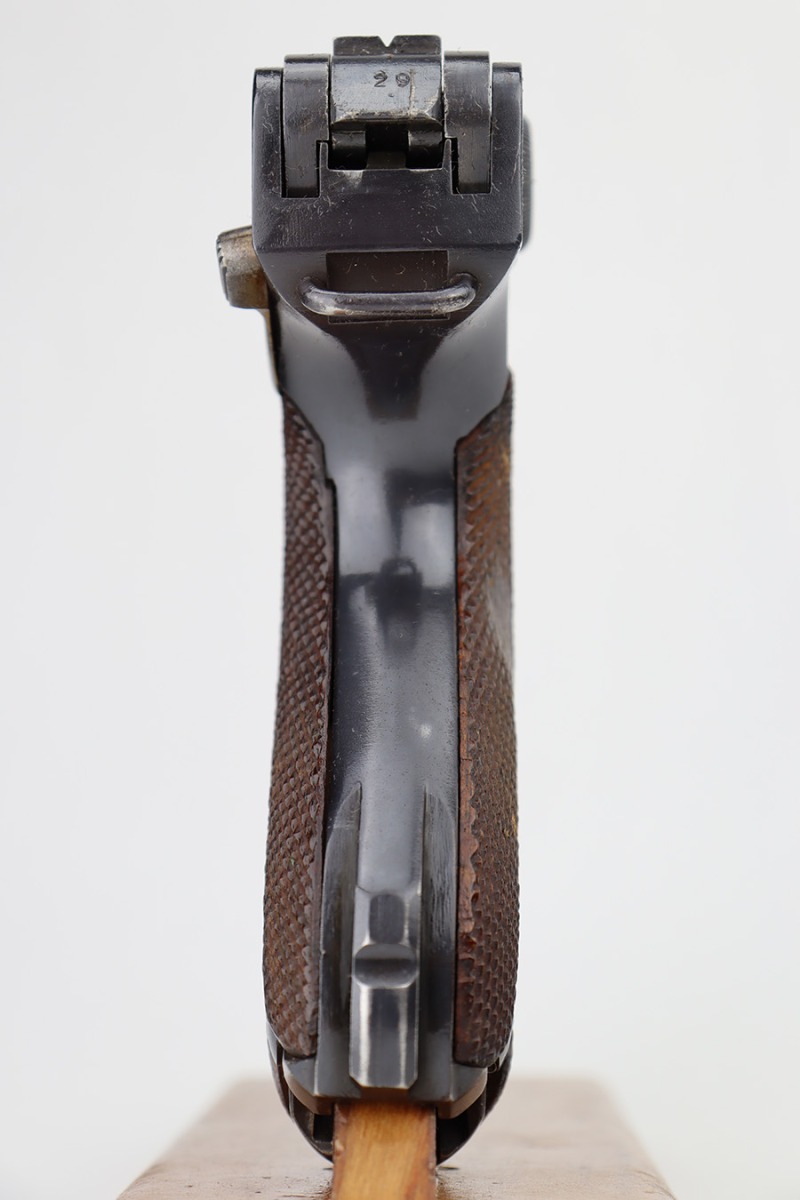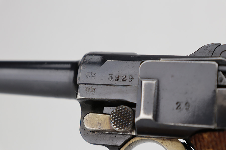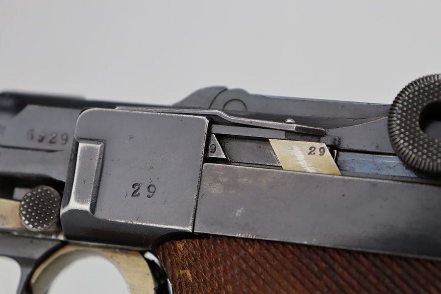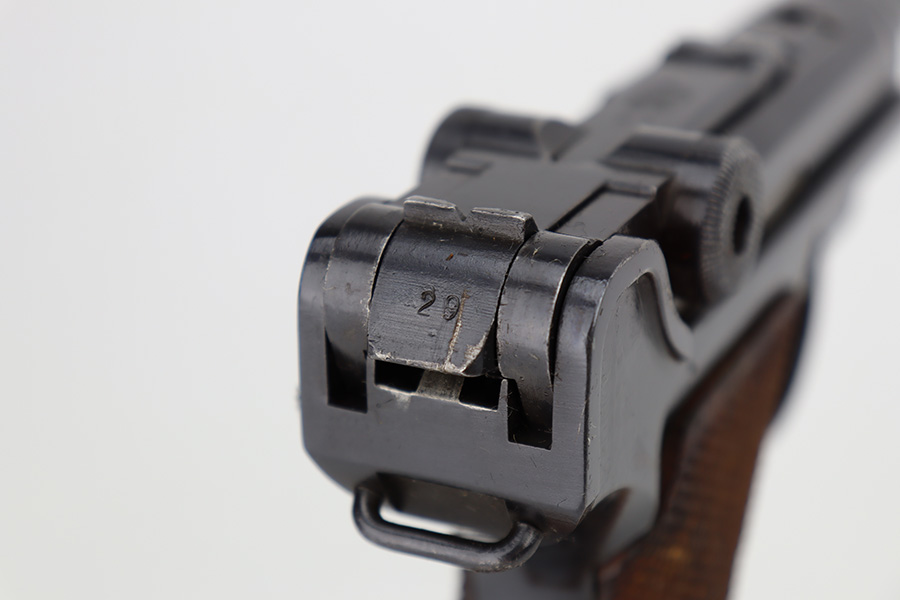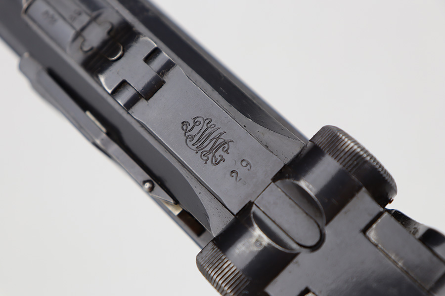 6/14/23 – This is an excellent example of a rare 1920/1920 double-date DWM Luger. The first “1920” (closest to the ejection port) indicates the date of manufacture, 1920. The second “1920” (closest to the muzzle) is a government property marking. Due to restrictions under the Treaty of Versailles, Germany was only allowed to have a certain amount of guns in military and police service. This marking indicates it was ear-marked for government service. This particular gun was issued to the German police force in 1920. It has an added police sear safety and Weimar-era police eagle markings on the right side of the slide. It also comes with one matching police arsenal-numbered magazine. The magazine was made by Simson and has the proper “Eagle 6” Simson proof. “Crown N” proofs on the slide, frame, and barrel indicate it ended up in the commercial market at some point. The gun itself is all matching and has retained about 95% of its finish. Minor wear around the muzzle, on the side plate, and on the left side of the frame. Some tiny pits under the finish on the grip straps. Fitted with un-numbered wood grips – noticeable bruise on the right side. The left grip panel has a WW2-era “S/42” armorers replacement marking, and the right grip has a Nazi-era “Eagle 63” proof. Excellent bore with strong rifling.
