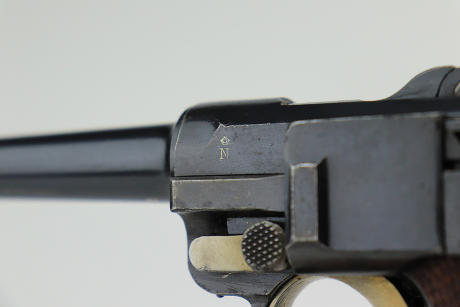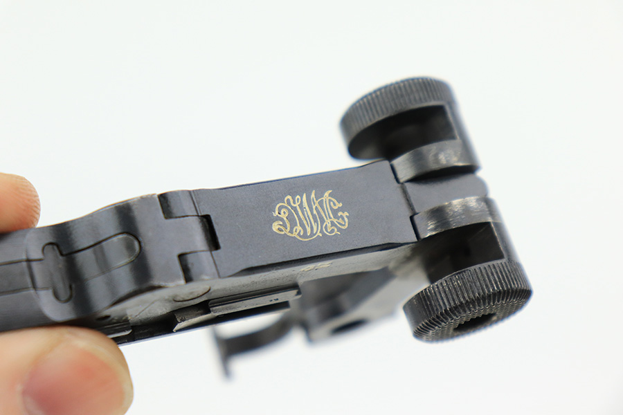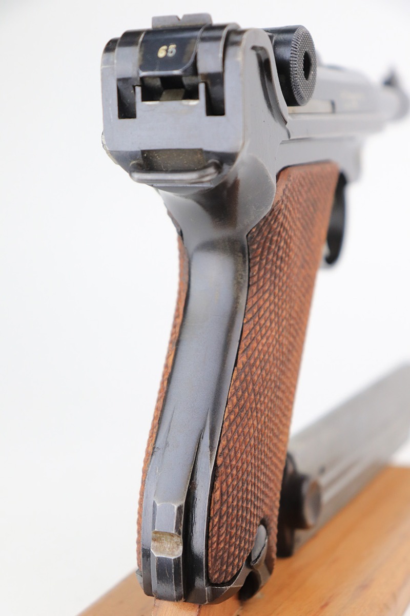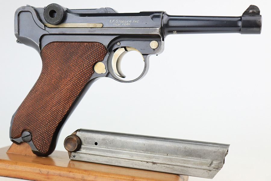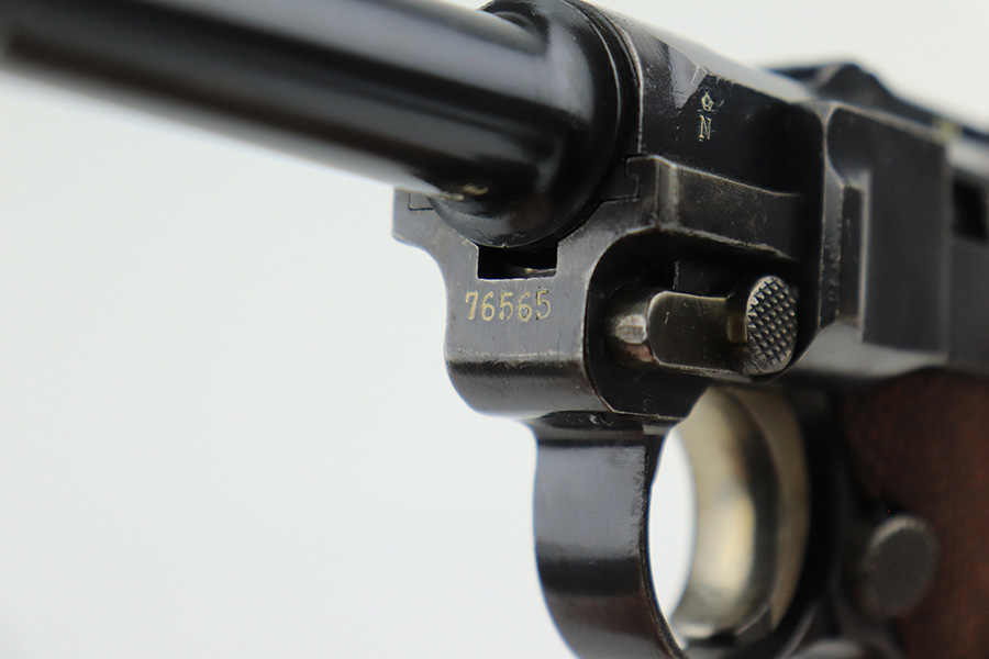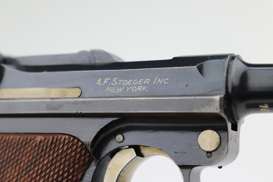 6/7/22 – This is a potentially rare DWM Luger with A.F. Stoeger retailer marking on the receiver. The firm of A.F. Stoeger Inc became the sole importer of DWM Luger pistols in the United States in 1922. The order was for only 2,500 pistols, and their configuration varied. Most documented examples are in the ‘t’ or ‘u’ blocks, so it must be noted that this one is not in any accepted serial range we could find for these pistols. The marking appears original but we can’t say with certainty given the serial range issue. This one also features crown/N proofs and a Germany export marking. Matching numbers throughout with minor high edge wear and a little thinning/patina on the straps. Bore has minor frost but very good condition overall. Interestingly, the grips and magazine both have the full, matching 5-digit serial number on them. We don’t have any explanation beyond guesswork for this, as even fakery wouldn’t make much sense here but always a possibility.