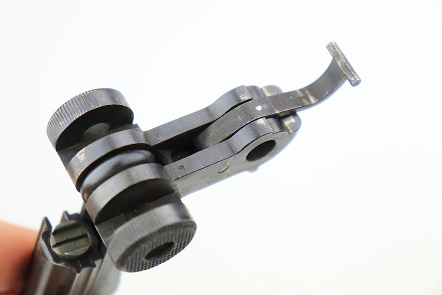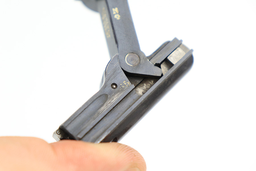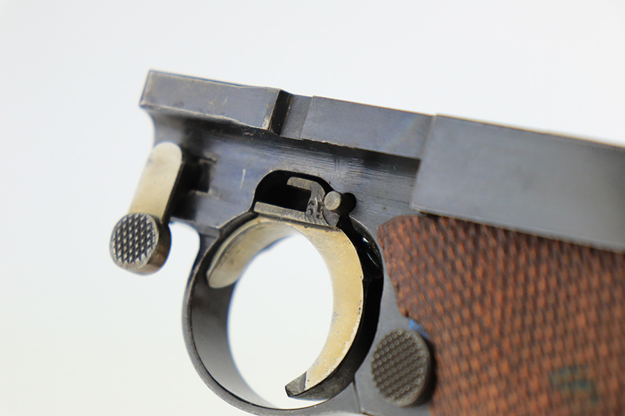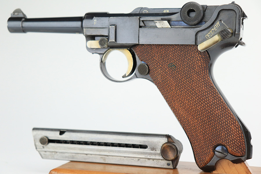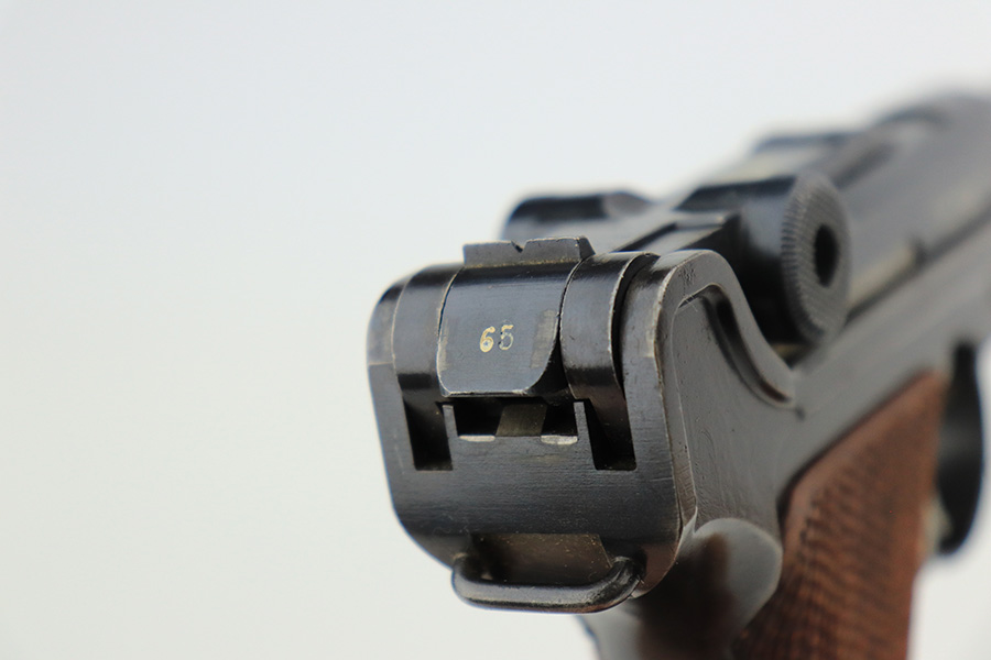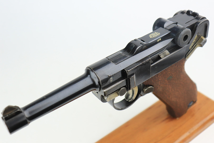 6/7/22 – This is a potentially rare DWM Luger with A.F. Stoeger retailer marking on the receiver. The firm of A.F. Stoeger Inc became the sole importer of DWM Luger pistols in the United States in 1922. The order was for only 2,500 pistols, and their configuration varied. Most documented examples are in the ‘t’ or ‘u’ blocks, so it must be noted that this one is not in any accepted serial range we could find for these pistols. The marking appears original but we can’t say with certainty given the serial range issue. This one also features crown/N proofs and a Germany export marking. Matching numbers throughout with minor high edge wear and a little thinning/patina on the straps. Bore has minor frost but very good condition overall. Interestingly, the grips and magazine both have the full, matching 5-digit serial number on them. We don’t have any explanation beyond guesswork for this, as even fakery wouldn’t make much sense here but always a possibility.