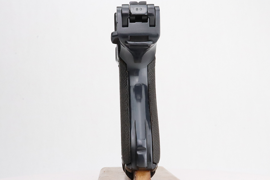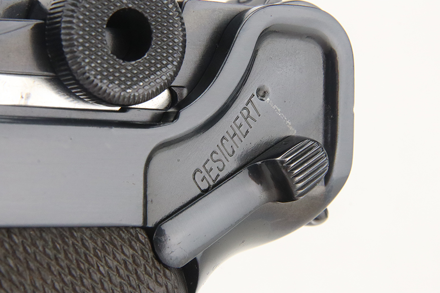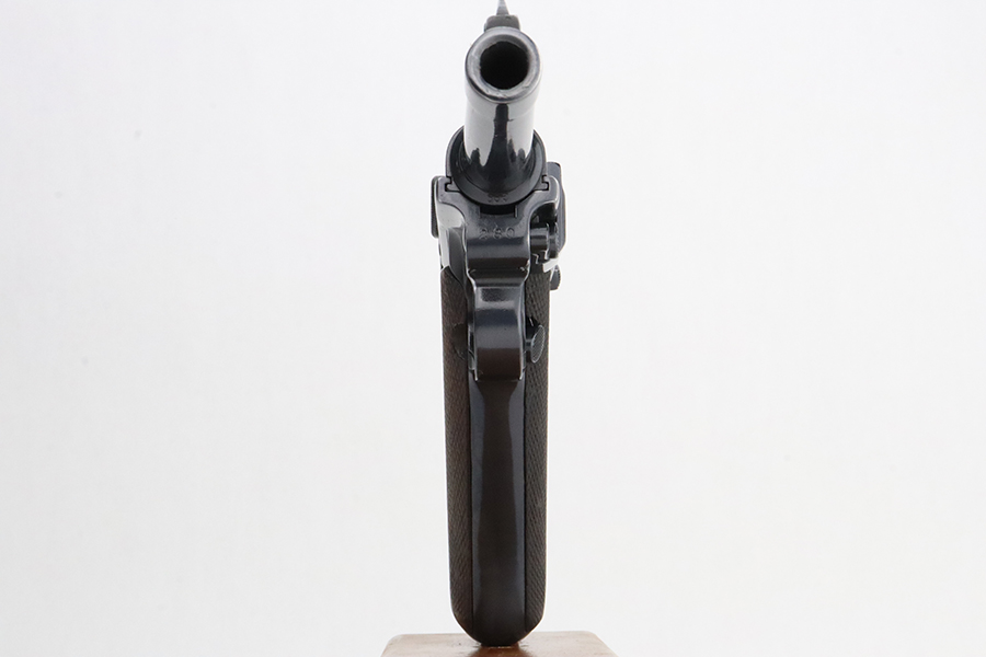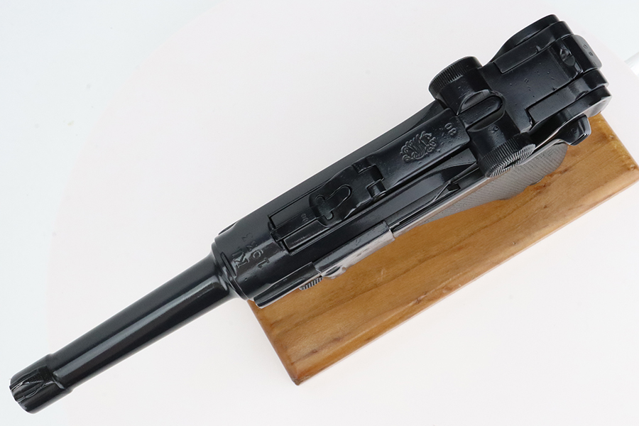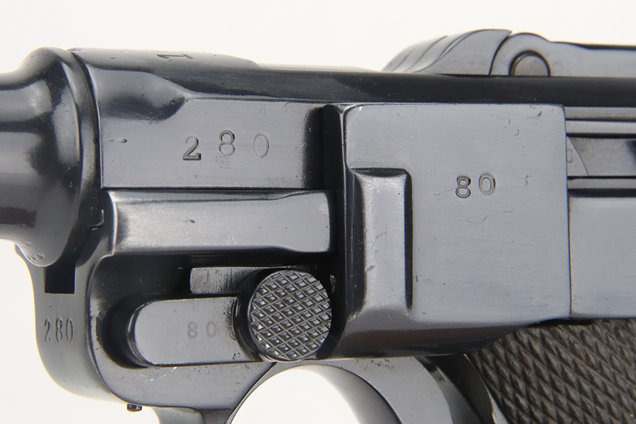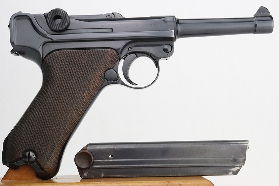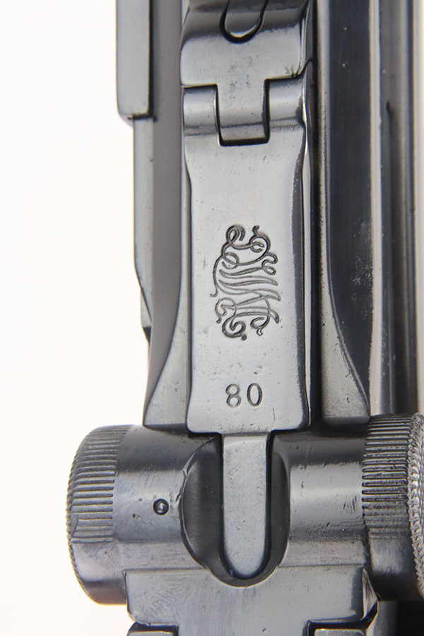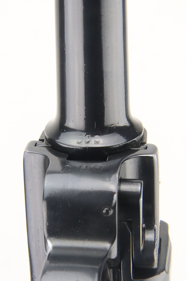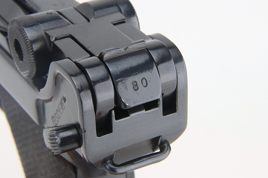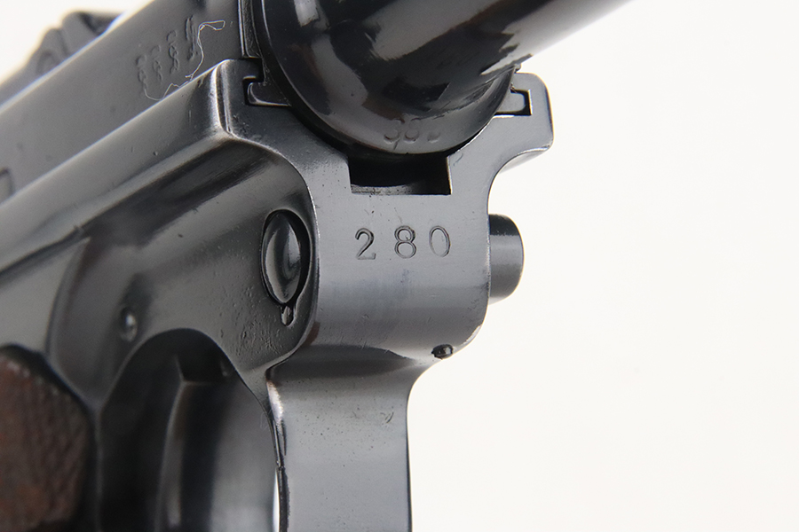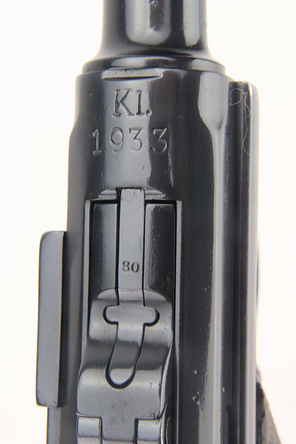 3/4/24 – This is a very rare, and the most sought after of all early Nazi Sneak Luger pistol rigs. There have been several theories put forth as to the origins of these lugers with no real discernible explanation. In all there were three theories: 1) the “K.I.” markings actually stood for “Kadet Institute”, which was an early “SA” or “SS” officer’s training school. That theory was discounted as no early training schools could be identified; 2) was that these were actually Concentration Camp Guard’s pistols and that the “KI” is actually “K.L.” and stands for “Konzentration Lager”; 3) the most recent theory, which seems to be the most plausible, is that the “K.I./1933” actually refers to some rework facility or factory responsible for rebuilding/overhauling left over WWI Lugers that were intended to be issued to early Reischeer Pioneer units or even early “Police or SS” units. The last theory could be plausible as all noted example have been from different manufacturers and have shown various rework proofs mark, mostly likely associated with the Simson & Co, who was responsible for reworking all Weimar era luger pistol from 1924-1930. This Luger has been completely refinished with essentially no bluing loss. Fitted with matching-numbered wood grips – small chip in the left panel. Comes with a blank magazine. The rifling is slightly worn with minor frosting in the grooves.