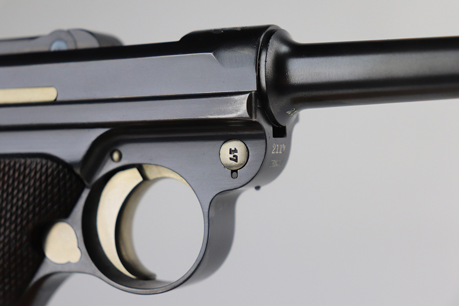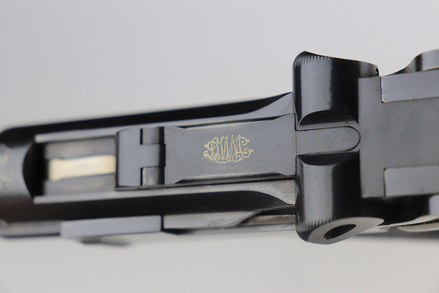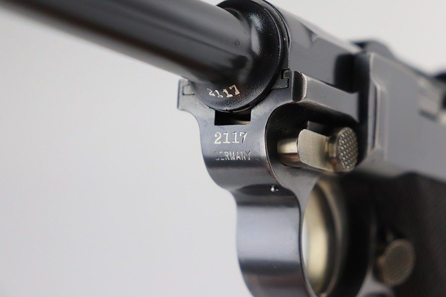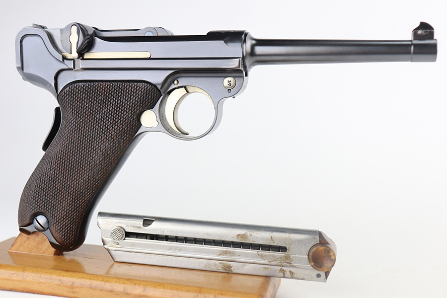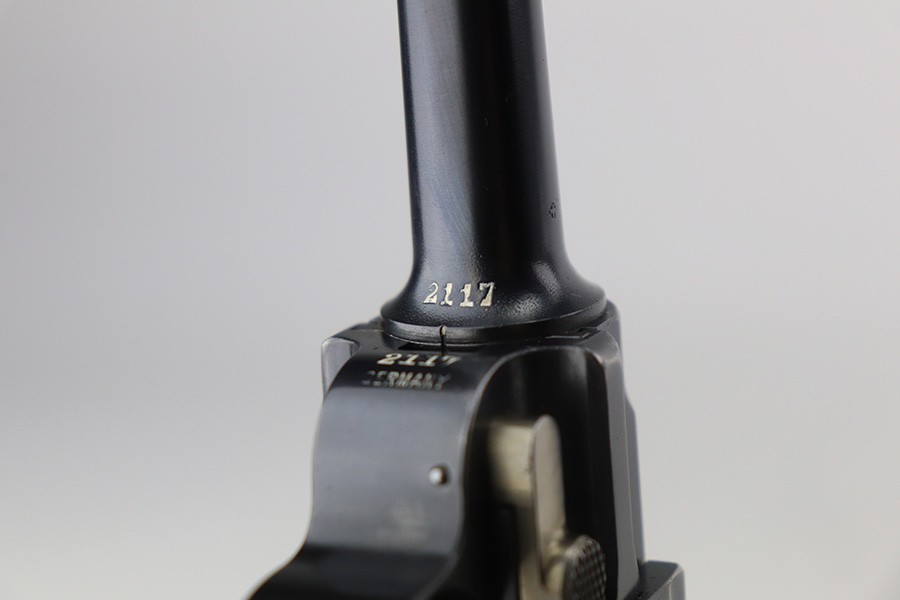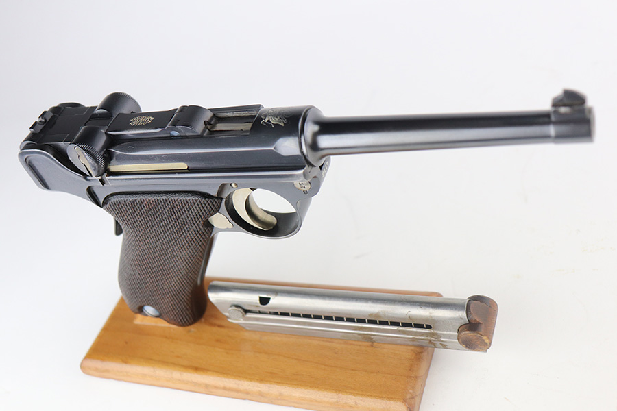 1/6/22 – This is a rare, early US import DWM model 1900 luger with American Eagle crest on the chamber. One of the first Lugers to be offered for sale in the United States. This is the first production model of this variation, made in or around 1900 with early dish toggle. These pistols went to the US retail market and the manufacturers at DWM realized that nation-based crests increased sales of these lugers, so that is why you find the American Eagle over the chamber. This is also why you see GERMANY marked on the frame, denoting these were exported for commercial sale. This one is in beautiful condition but has been professionally restored. It has retained almost all of its new bluing with areas of very minor wear on some of the high edges and base of the front strap. There are areas of very minor pin-pricking here and there that have been blued-over. Comes with nice grips – some light dings on the left side. Also comes with a proper “Germany” marked magazine. The rifling in the bore is pretty worn with minor pitting throughout.