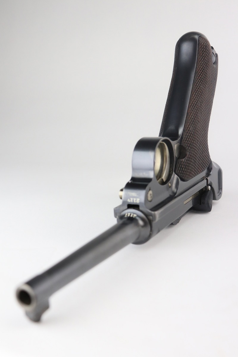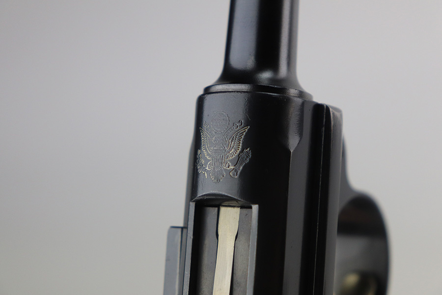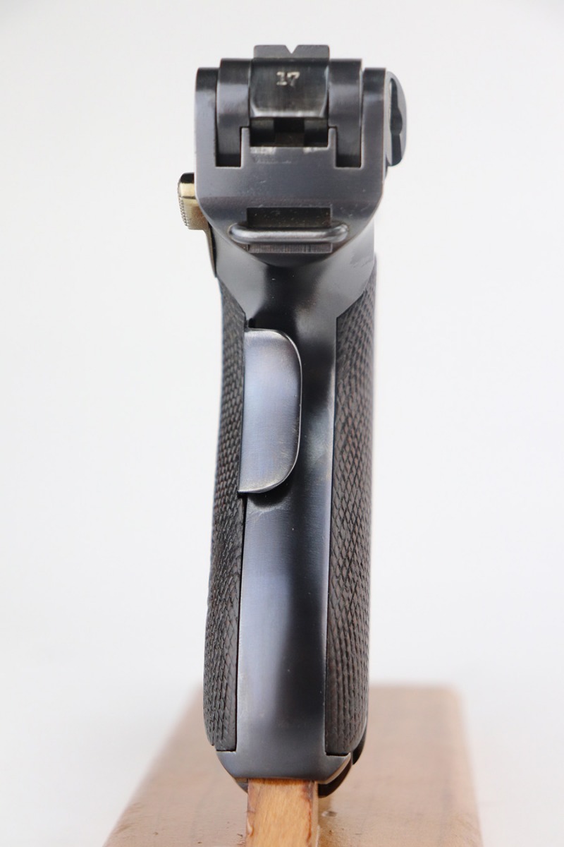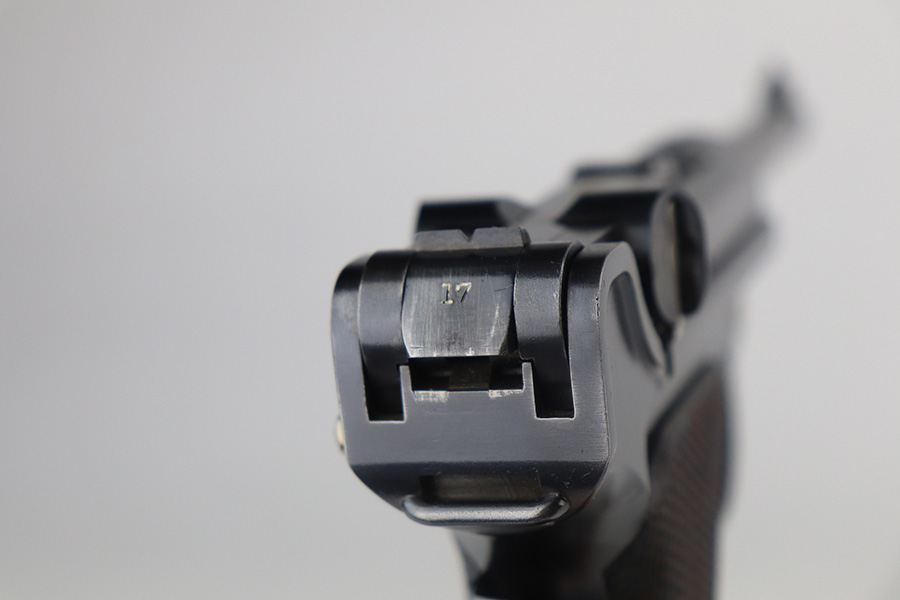 1/6/22 – This is a rare, early US import DWM model 1900 luger with American Eagle crest on the chamber. One of the first Lugers to be offered for sale in the United States. This is the first production model of this variation, made in or around 1900 with early dish toggle. These pistols went to the US retail market and the manufacturers at DWM realized that nation-based crests increased sales of these lugers, so that is why you find the American Eagle over the chamber. This is also why you see GERMANY marked on the frame, denoting these were exported for commercial sale. This one is in beautiful condition but has been professionally restored. It has retained almost all of its new bluing with areas of very minor wear on some of the high edges and base of the front strap. There are areas of very minor pin-pricking here and there that have been blued-over. Comes with nice grips – some light dings on the left side. Also comes with a proper “Germany” marked magazine. The rifling in the bore is pretty worn with minor pitting throughout.