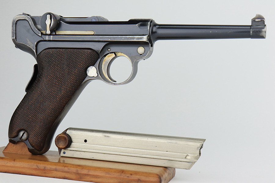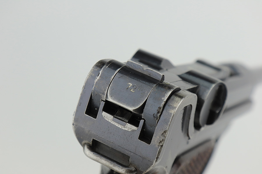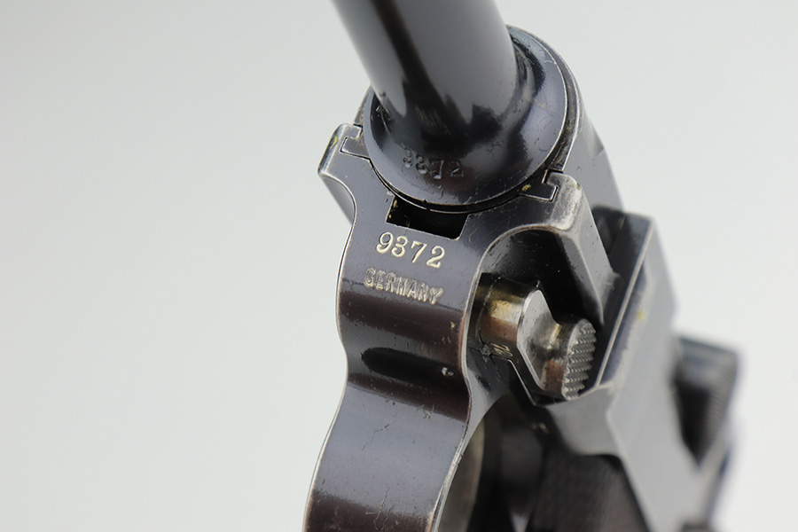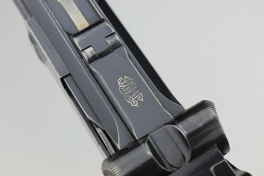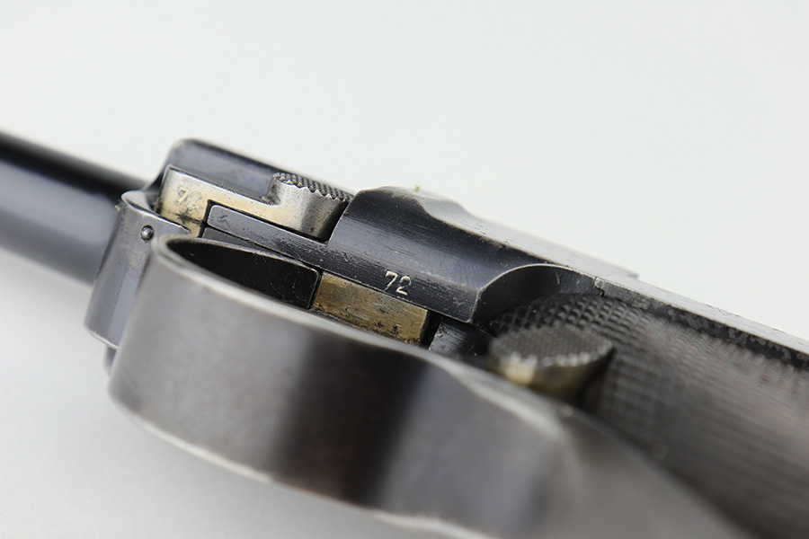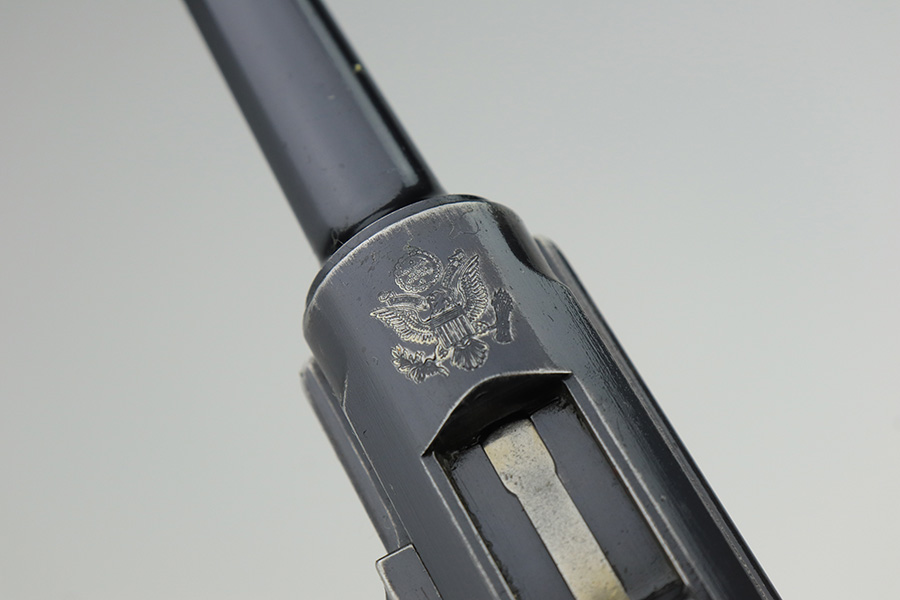 3/2/23 – This is a rare DWM model 1900 luger with American Eagle crest on the chamber. This is the first production model of this variation, made in or around 1900 with early dish toggle. These pistols went to the US retail market and the manufacturers at DWM realized that nation-based crests increased sales of these lugers, so that is why you find the American Eagle over the chamber. This is also why you see GERMANY marked on the frame, denoting these were exported for commercial sale. This one is all matching and has retained roughly 70% of its original. The vast majority of the finish loss is on the front strap. Areas of spotty wear on the left side of the frame and on the back strap. Minor wear around the muzzle, along the left side of the barrel, on the side plate, and on the side rails. Fitted with nice matching-numbered wood grips – some minor bruising on the right side. Comes with a proper blank wood-bottom magazine. The rifling in the bore is just slightly worn with minor frosting throughout.