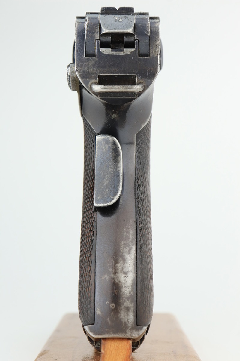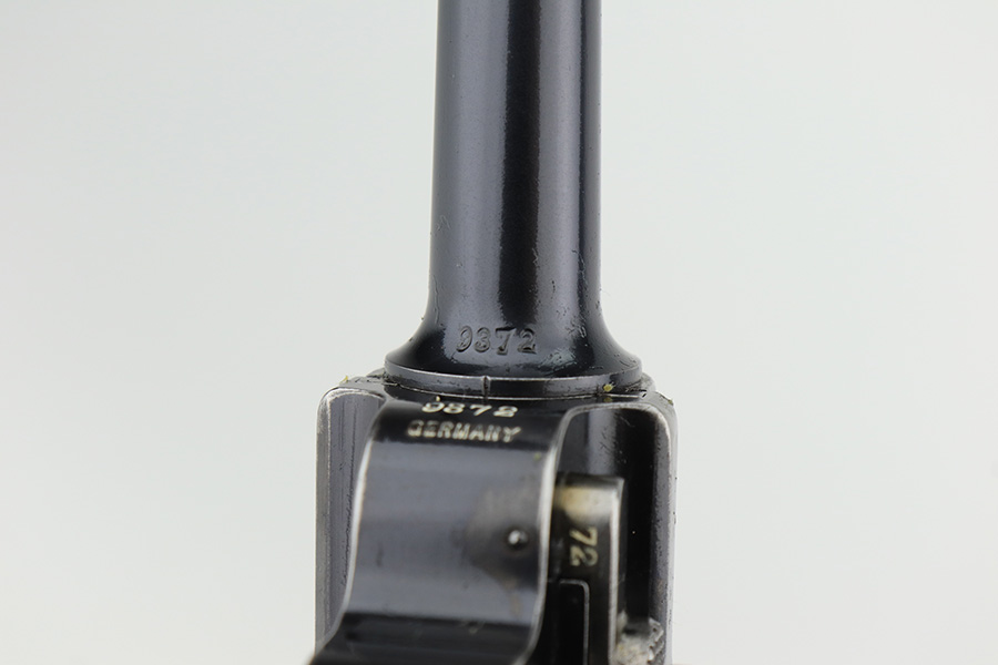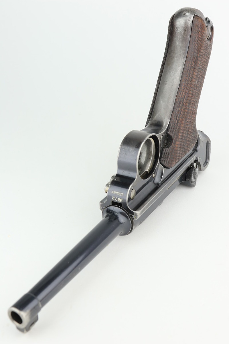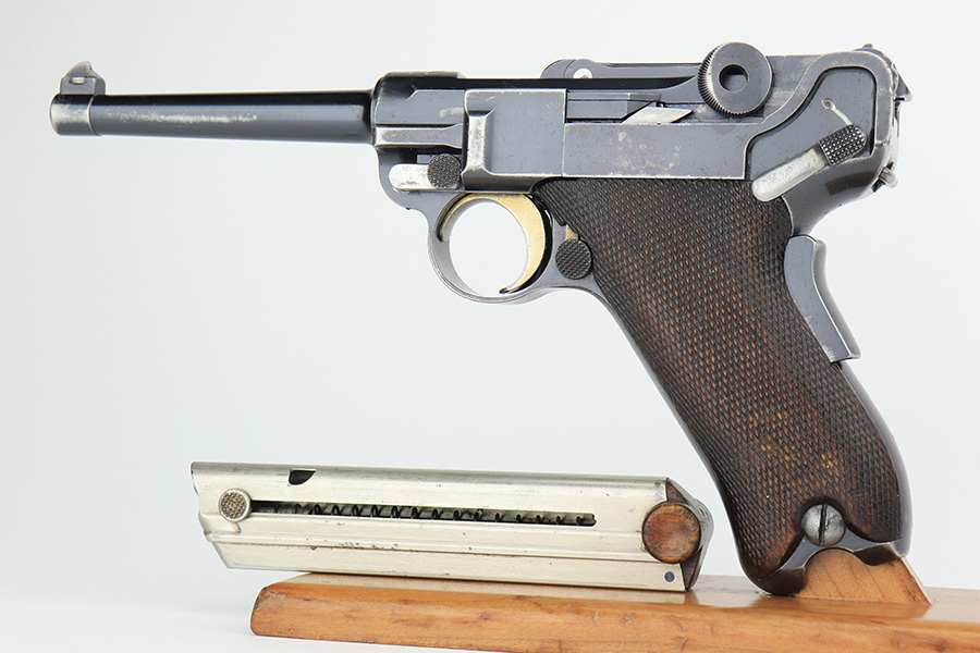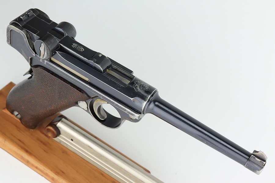 3/2/23 – This is a rare DWM model 1900 luger with American Eagle crest on the chamber. This is the first production model of this variation, made in or around 1900 with early dish toggle. These pistols went to the US retail market and the manufacturers at DWM realized that nation-based crests increased sales of these lugers, so that is why you find the American Eagle over the chamber. This is also why you see GERMANY marked on the frame, denoting these were exported for commercial sale. This one is all matching and has retained roughly 70% of its original. The vast majority of the finish loss is on the front strap. Areas of spotty wear on the left side of the frame and on the back strap. Minor wear around the muzzle, along the left side of the barrel, on the side plate, and on the side rails. Fitted with nice matching-numbered wood grips – some minor bruising on the right side. Comes with a proper blank wood-bottom magazine. The rifling in the bore is just slightly worn with minor frosting throughout.