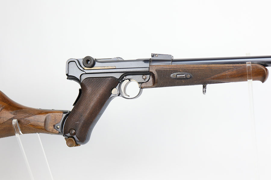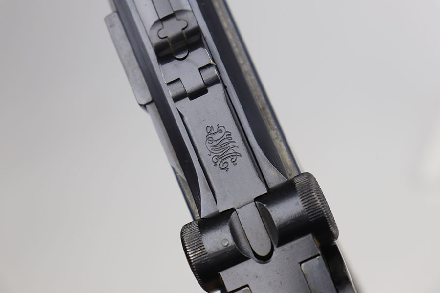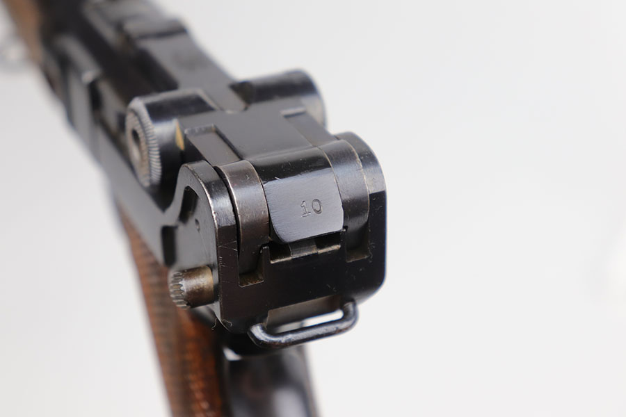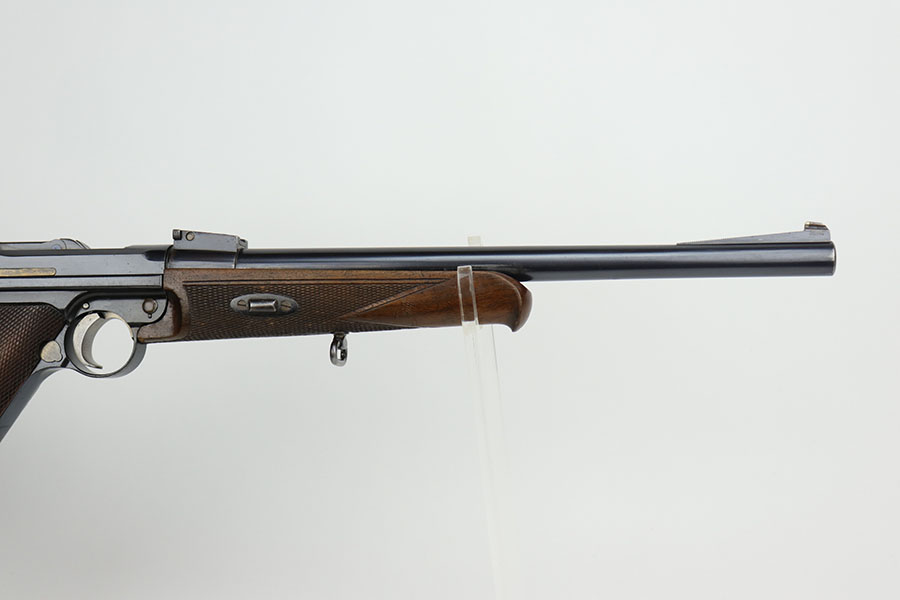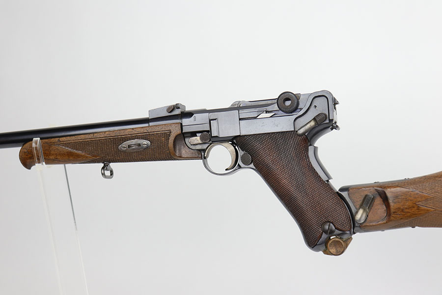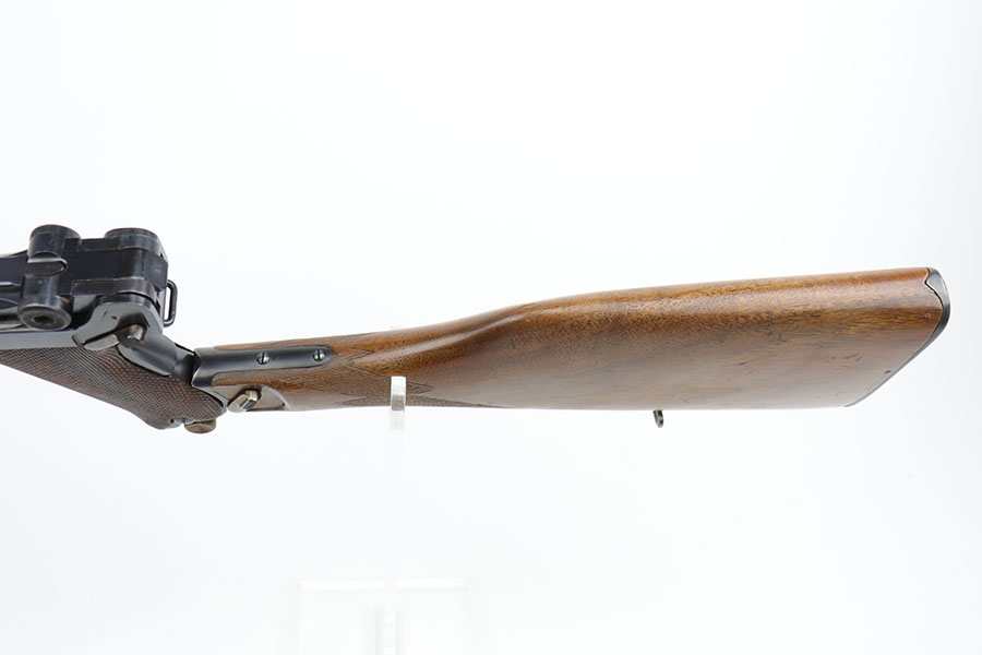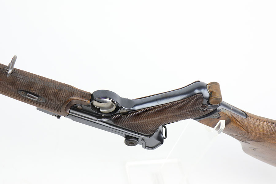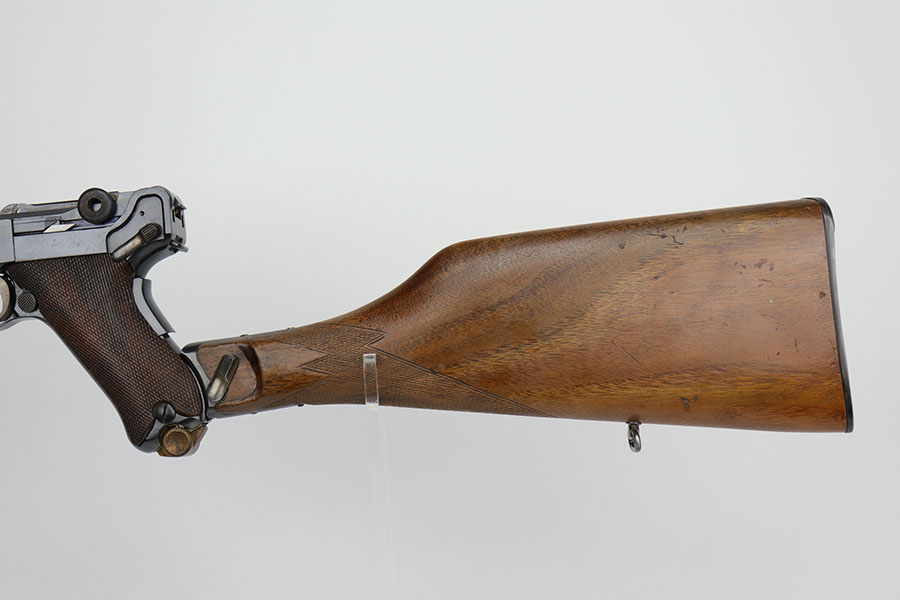 11/10/20 – This is a fantastic example of an early production DWM Model 1902 Luger carbine that is complete with it’s original walnut shoulder stock. Approximately 2,500 were manufactured, beginning with serial 21,000. This particular example has the number ’10’ marked on the small parts, but the arms that holds the forearm appears to have been replaced and soldered in place. Thus, the five digit serial isn’t seen. All these early carbines exhibit the very desirable early features such the long frame, flat mainspring, grip safety, dished toggles, toggle lock on the right side, recessed/flat breech bolt, and flat straw colored extractor. One of the most unique features is the 11 3/4 inch carbine barrel with a detachable checkered forearm. The underside of the barrel is fitted with a small lug that engages a small spring actuator located inside the forearm that helps to cycle the heavier carbine barrel during firing. No other Luger has this feature. The top of the chamber is blank, and the front toggle has the standard DWM logo. Fitted with the correct 3-position rear sight (adjustable from 100-300 meters) and a small ramp front sight base fitted with a bead front sight. The last digits of the serial number are discretely marked on the various parts in the correct commercial manner. Fitted with a set of original and unnumbered checkered walnut grips. It is complete with an original and unnumbered walnut shoulder stock that has a fine checkered pattern in the grip area and horn buttplate. Comes with one original commercial magazine with a correct unnumbered wood base. The finish rates at 97% with just a bit of finish loss on the muzzle and front strap. The finish was likely professionally or arsenal restored at some point, and there is some freckling under the blue on the frame. Terrific bore.