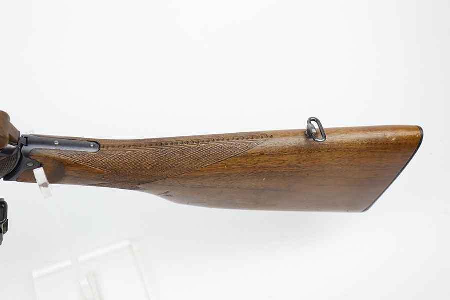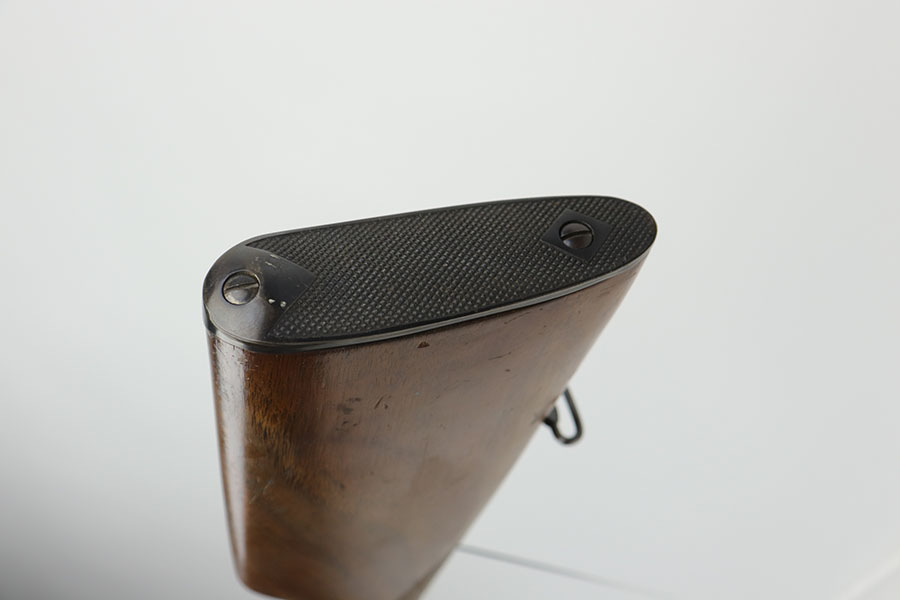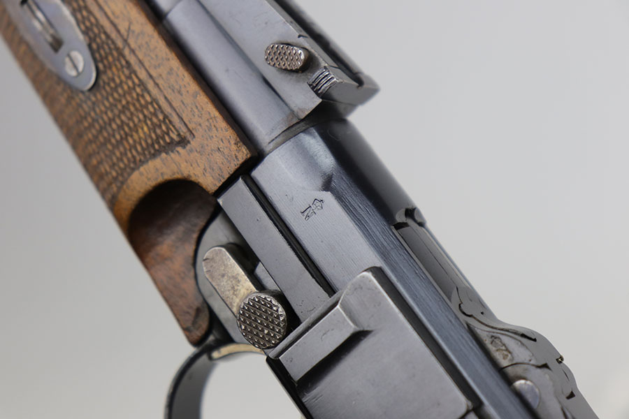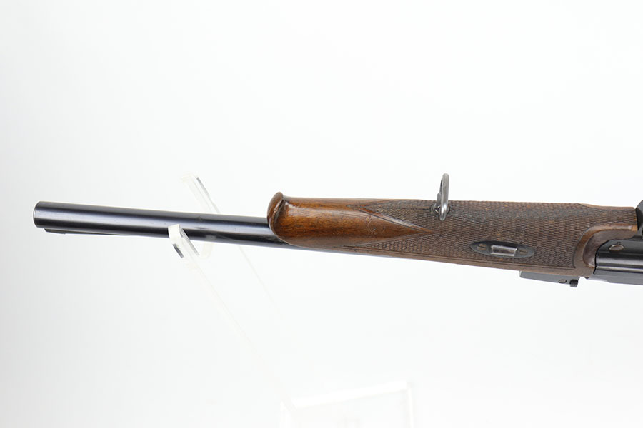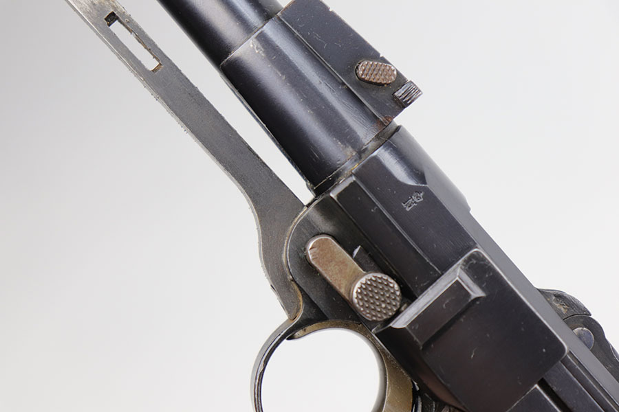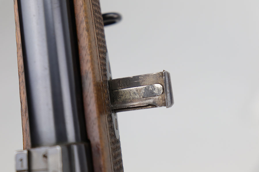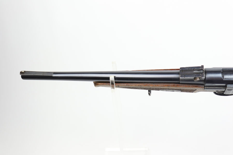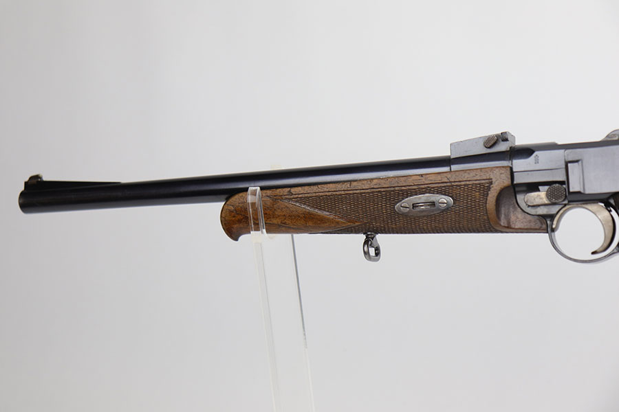 11/10/20 – This is a fantastic example of an early production DWM Model 1902 Luger carbine that is complete with it’s original walnut shoulder stock. Approximately 2,500 were manufactured, beginning with serial 21,000. This particular example has the number ’10’ marked on the small parts, but the arms that holds the forearm appears to have been replaced and soldered in place. Thus, the five digit serial isn’t seen. All these early carbines exhibit the very desirable early features such the long frame, flat mainspring, grip safety, dished toggles, toggle lock on the right side, recessed/flat breech bolt, and flat straw colored extractor. One of the most unique features is the 11 3/4 inch carbine barrel with a detachable checkered forearm. The underside of the barrel is fitted with a small lug that engages a small spring actuator located inside the forearm that helps to cycle the heavier carbine barrel during firing. No other Luger has this feature. The top of the chamber is blank, and the front toggle has the standard DWM logo. Fitted with the correct 3-position rear sight (adjustable from 100-300 meters) and a small ramp front sight base fitted with a bead front sight. The last digits of the serial number are discretely marked on the various parts in the correct commercial manner. Fitted with a set of original and unnumbered checkered walnut grips. It is complete with an original and unnumbered walnut shoulder stock that has a fine checkered pattern in the grip area and horn buttplate. Comes with one original commercial magazine with a correct unnumbered wood base. The finish rates at 97% with just a bit of finish loss on the muzzle and front strap. The finish was likely professionally or arsenal restored at some point, and there is some freckling under the blue on the frame. Terrific bore.