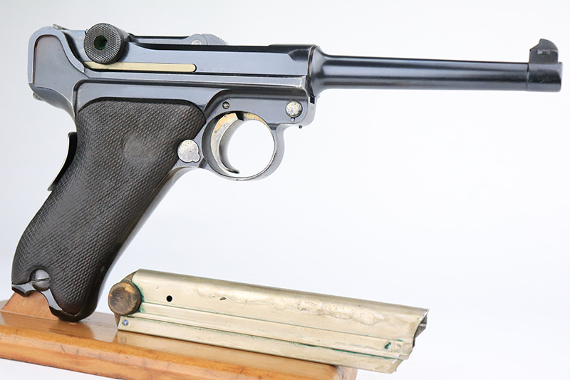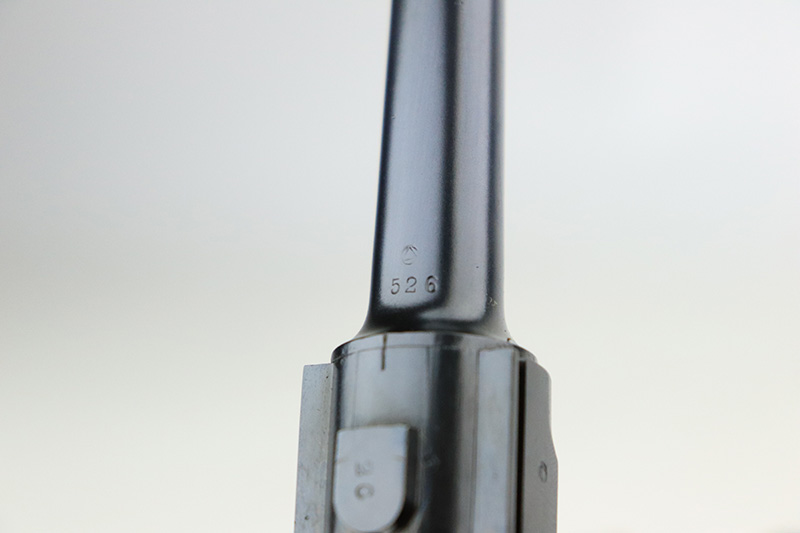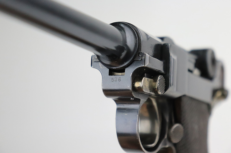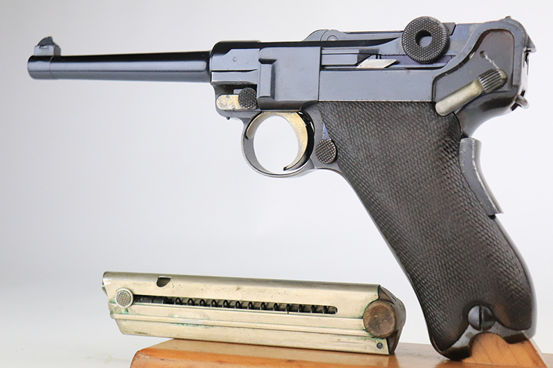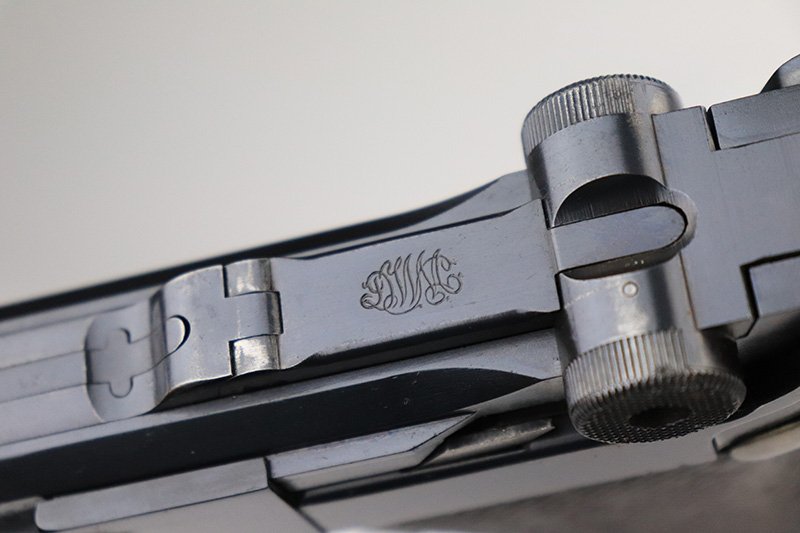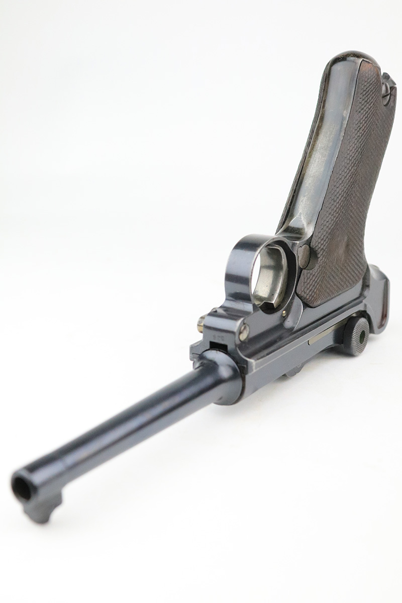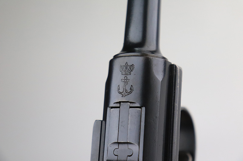 9/1/22 – This is an excellent example of a rare DWM Model 1906 Luger issued to the Portuguese Navy in the early 1900’s. These were manufactured by DWM under contract for the Portuguese Navy shortly before Portugal’s monarchy was replaced with a Republic. The first 350 Model 1906 Luger produced and delivered by DWM bore a “Crown Anchor” crest over the chamber area but were subsequently changed to “R.P. Anchor” once the monarch of Portugal was disposed. This example bears the “Crown Anchor” crest over the chamber. It is all matching with Portuguese “Triangle in Circle” markings throughout. Chambered in .30 Luger. It comes as a rig with two non-matching wood bottom mags, a reproduction Luger tool with a Nazi proof on it, and a nice Portuguese style leather holster. The finish on the gun has been restored. Almost of the finish loss is obvious wear on both grip straps. Otherwise, the bluing is nice. Comes with fairly worn wood grips – there is obvious bruising on the right side and a chip in corner of the left panel. Excellent bore with strong rifling.