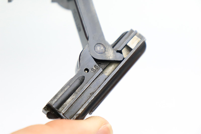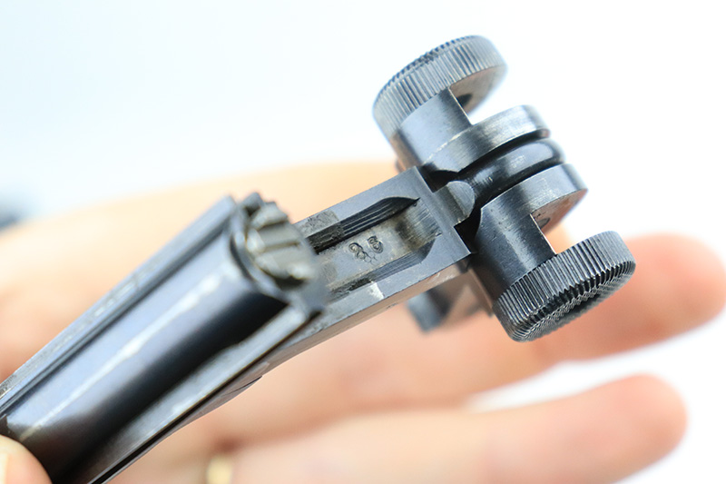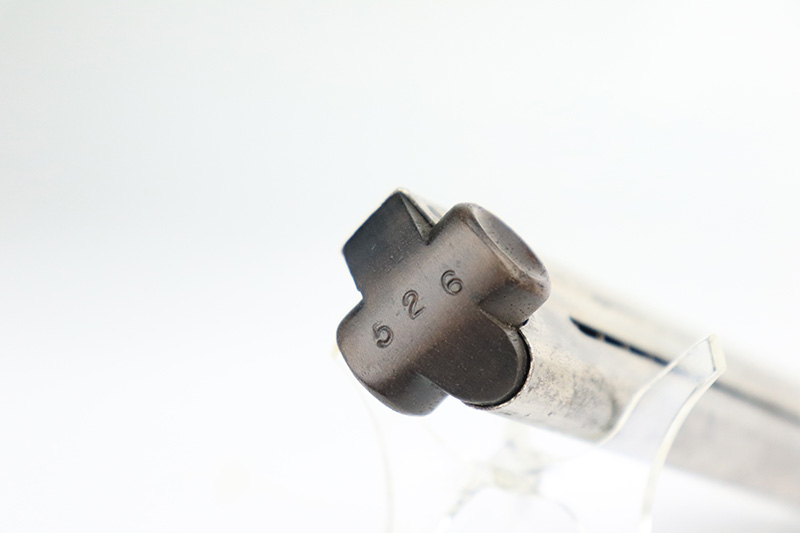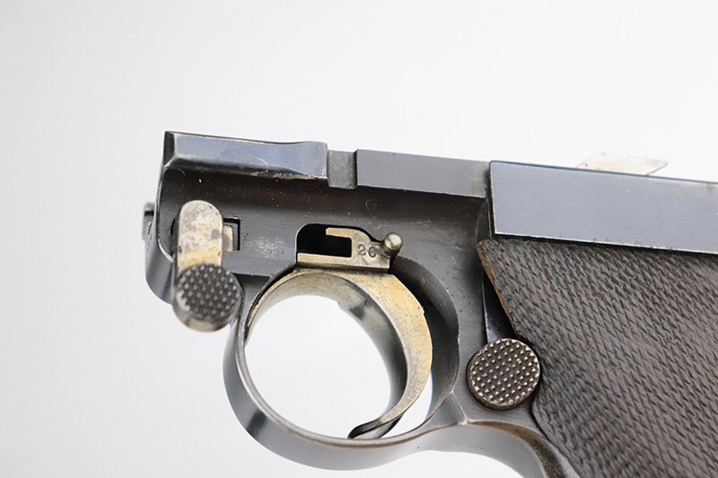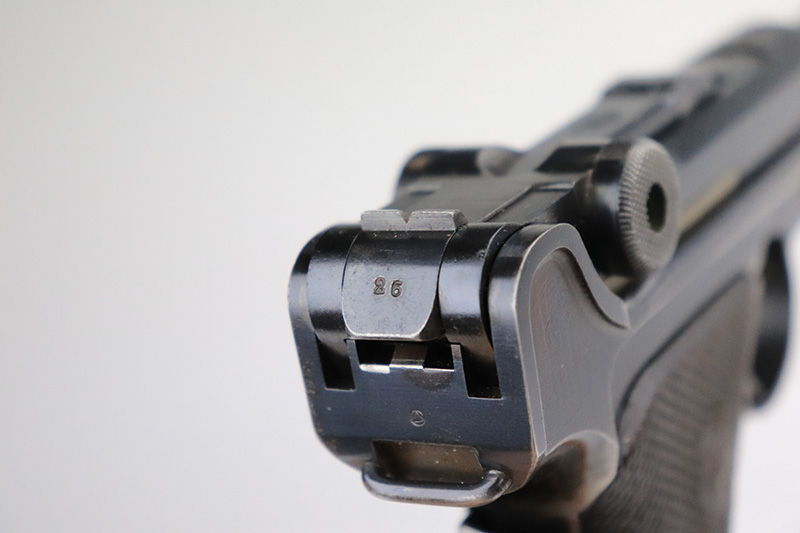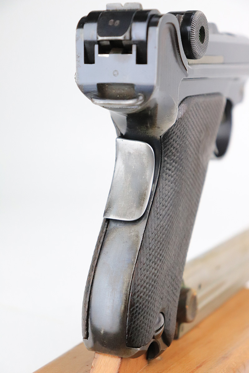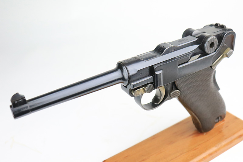 9/1/22 – This is an excellent example of a rare DWM Model 1906 Luger issued to the Portuguese Navy in the early 1900’s. These were manufactured by DWM under contract for the Portuguese Navy shortly before Portugal’s monarchy was replaced with a Republic. The first 350 Model 1906 Luger produced and delivered by DWM bore a “Crown Anchor” crest over the chamber area but were subsequently changed to “R.P. Anchor” once the monarch of Portugal was disposed. This example bears the “Crown Anchor” crest over the chamber. It is all matching with Portuguese “Triangle in Circle” markings throughout. Chambered in .30 Luger. It comes as a rig with two non-matching wood bottom mags, a reproduction Luger tool with a Nazi proof on it, and a nice Portuguese style leather holster. The finish on the gun has been restored. Almost of the finish loss is obvious wear on both grip straps. Otherwise, the bluing is nice. Comes with fairly worn wood grips – there is obvious bruising on the right side and a chip in corner of the left panel. Excellent bore with strong rifling.