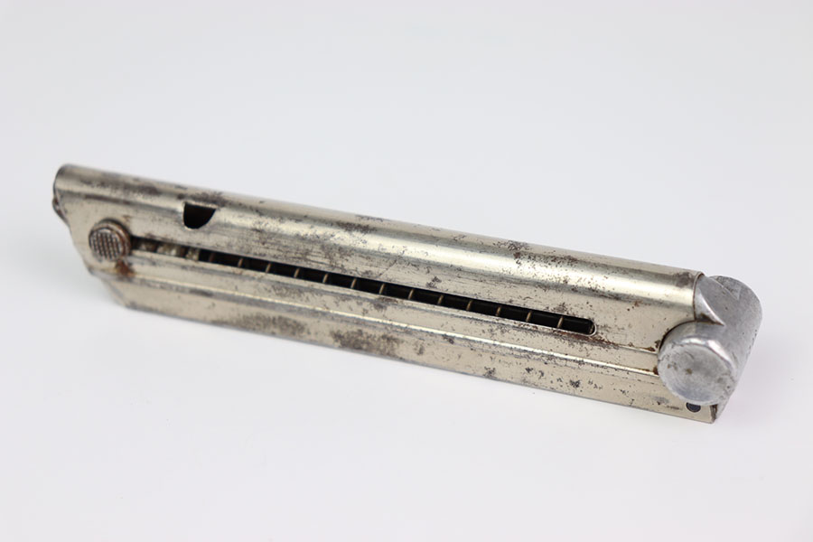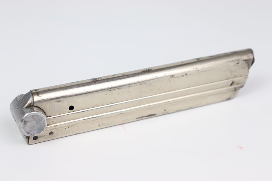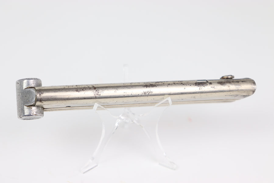 1/29/24 – This is a rare original G Date Mauser Luger magazine from 1935. The magazine has a nickel tube and aluminum base. The base is serial numbered 1396d with a droop winged eagle 154 proof stamp. The tube has some light spotty oxidation but no deep pitting. The spring is strong and functional.