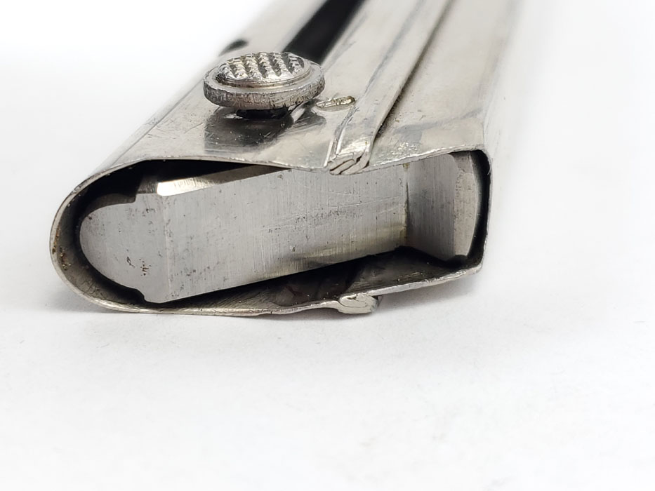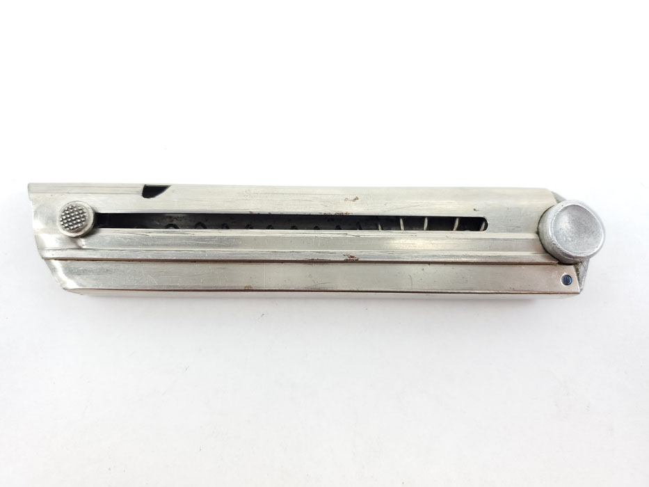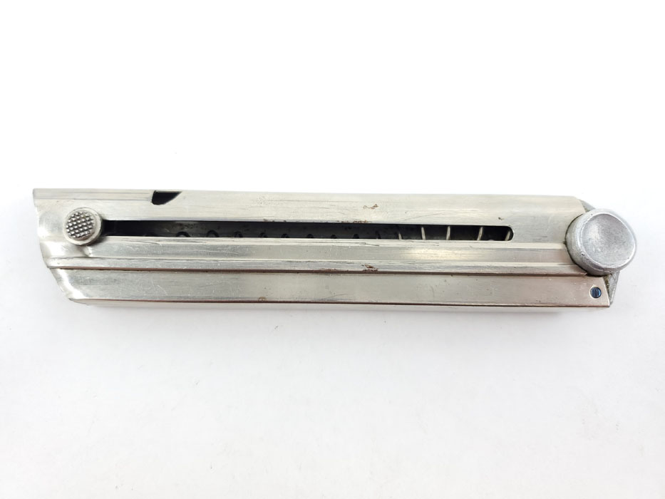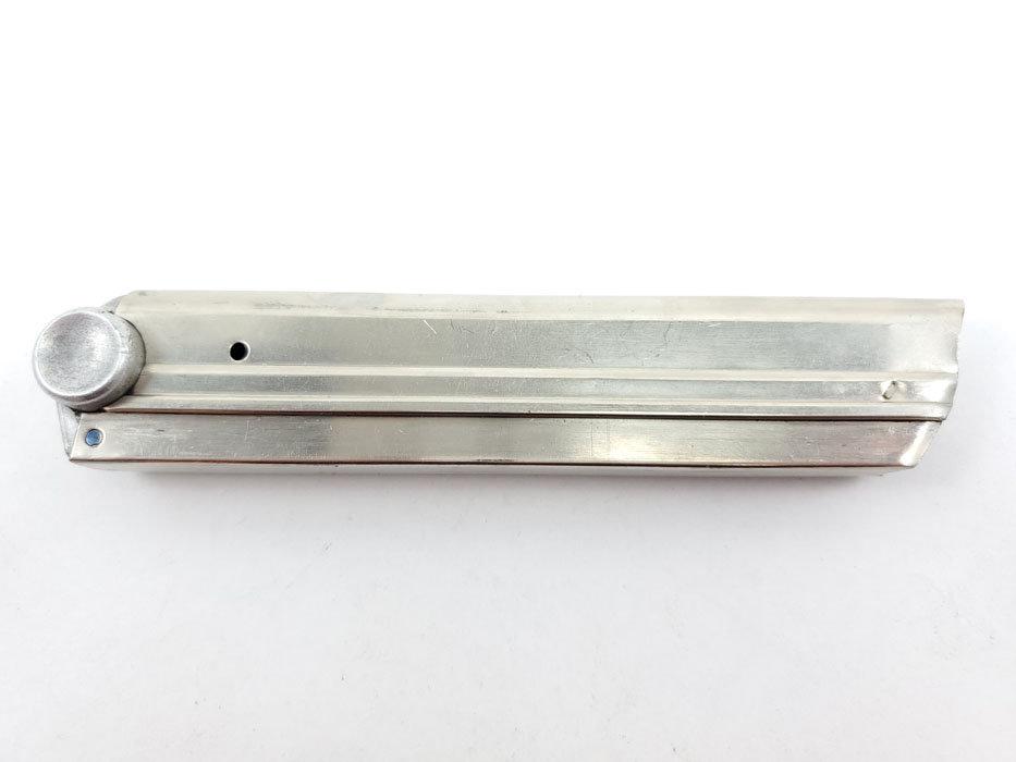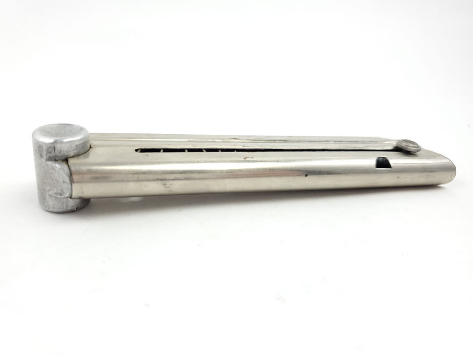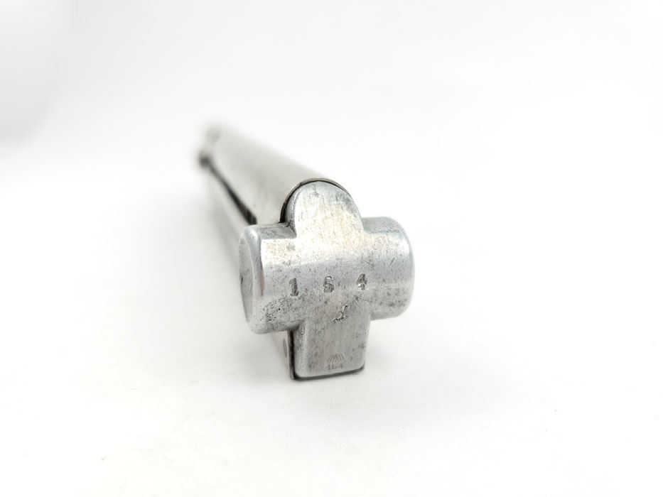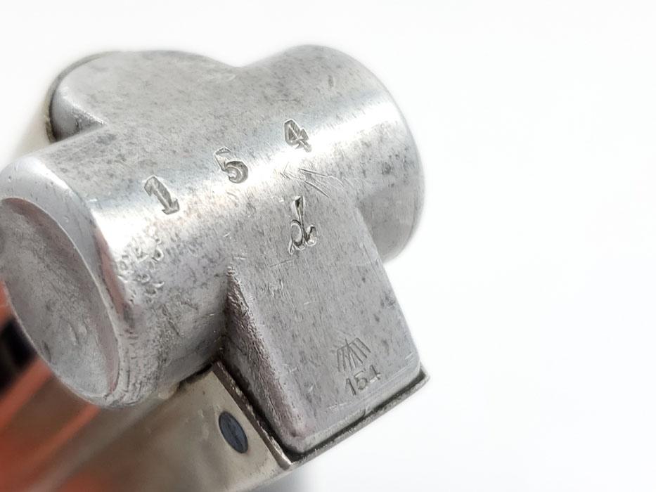 4/1/20 – This is a scarce G Date Luger magazine from early / pre WW2. The magazine is stamped on the aluminum base with a 3 digit serial number “154 d” and a droop winged eagle over 154 military proof stamp. This proof stamp was only used during production of the G Date Mauser Lugers in 1935. Excellent condition with minimal wear on the tube, and a strong functioning spring.