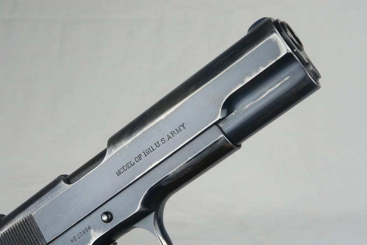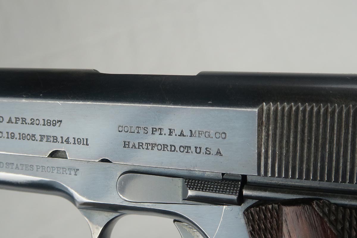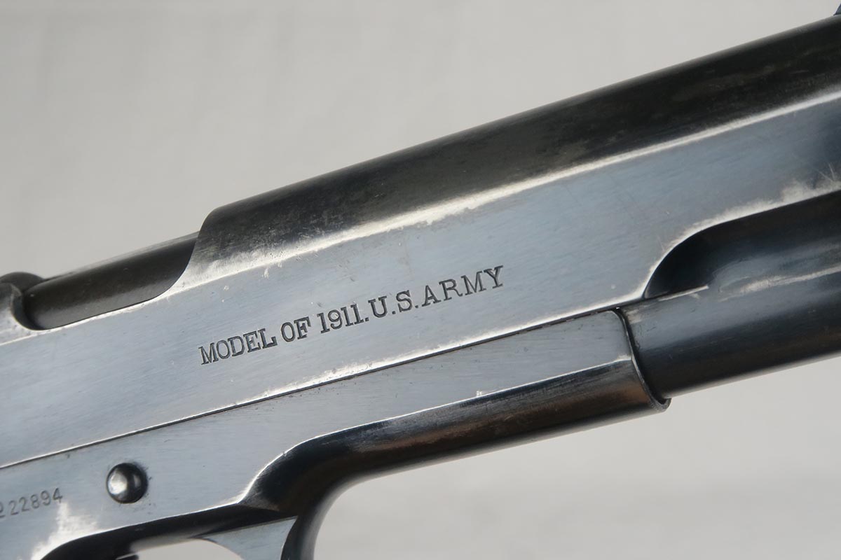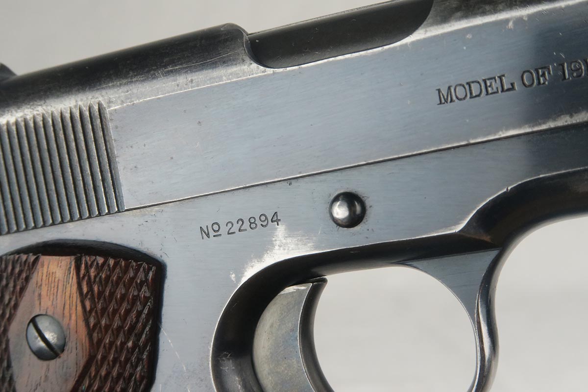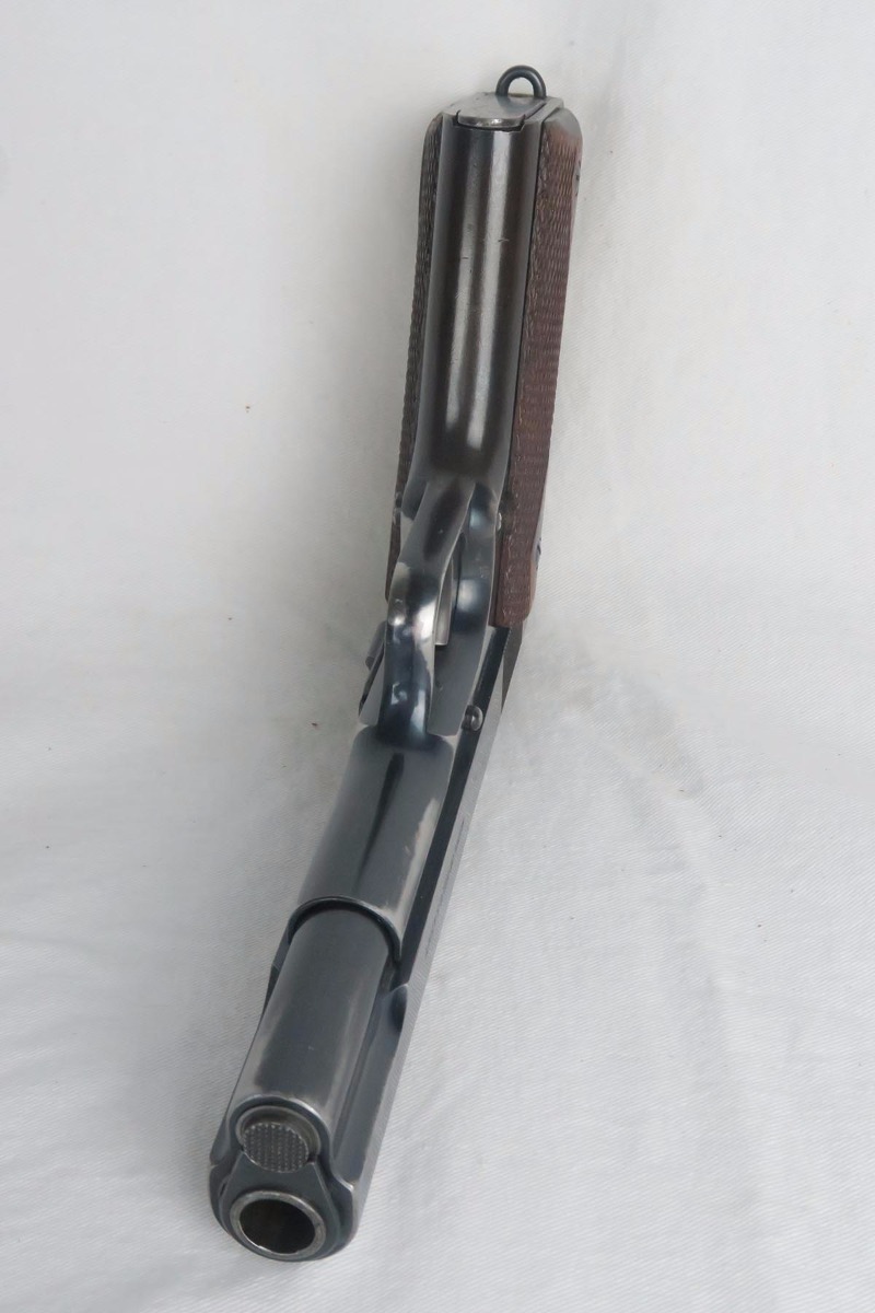11/14/17 – This is a very hard to find Colt 1911 from early 1913. Production began in 1912 and with the serial in the 22xxx range, this obviously makes it one of the first 25k made. The early parts are very hard to find so I will go over the main parts to insure that this gun is all original. The slide is early logo, and correctly missing the 1913 patent marking. The rear site is rounded. The inspector proof on the frame is also correct – WGP. The top of the frame (inside) is marked H and U. The grips appear to be correct and original. The barrel is H P marked on top, but the P is a poor strike. This would be a type 3 barrel which my source says started around serial 25xxx, so the barrel could be a replacement, although early. The finish is original and the bore is cloudy with minor corrosion but decent rifling. The magazine is also the early two-tone but lacks the loop at the bottom, so like the barrel, could be a later replacement. Overall, a fine example of one of the earliest US Army issued 1911 Colts.