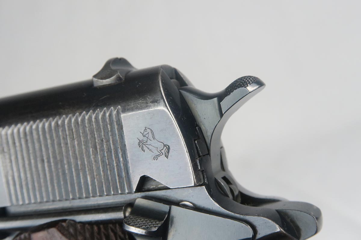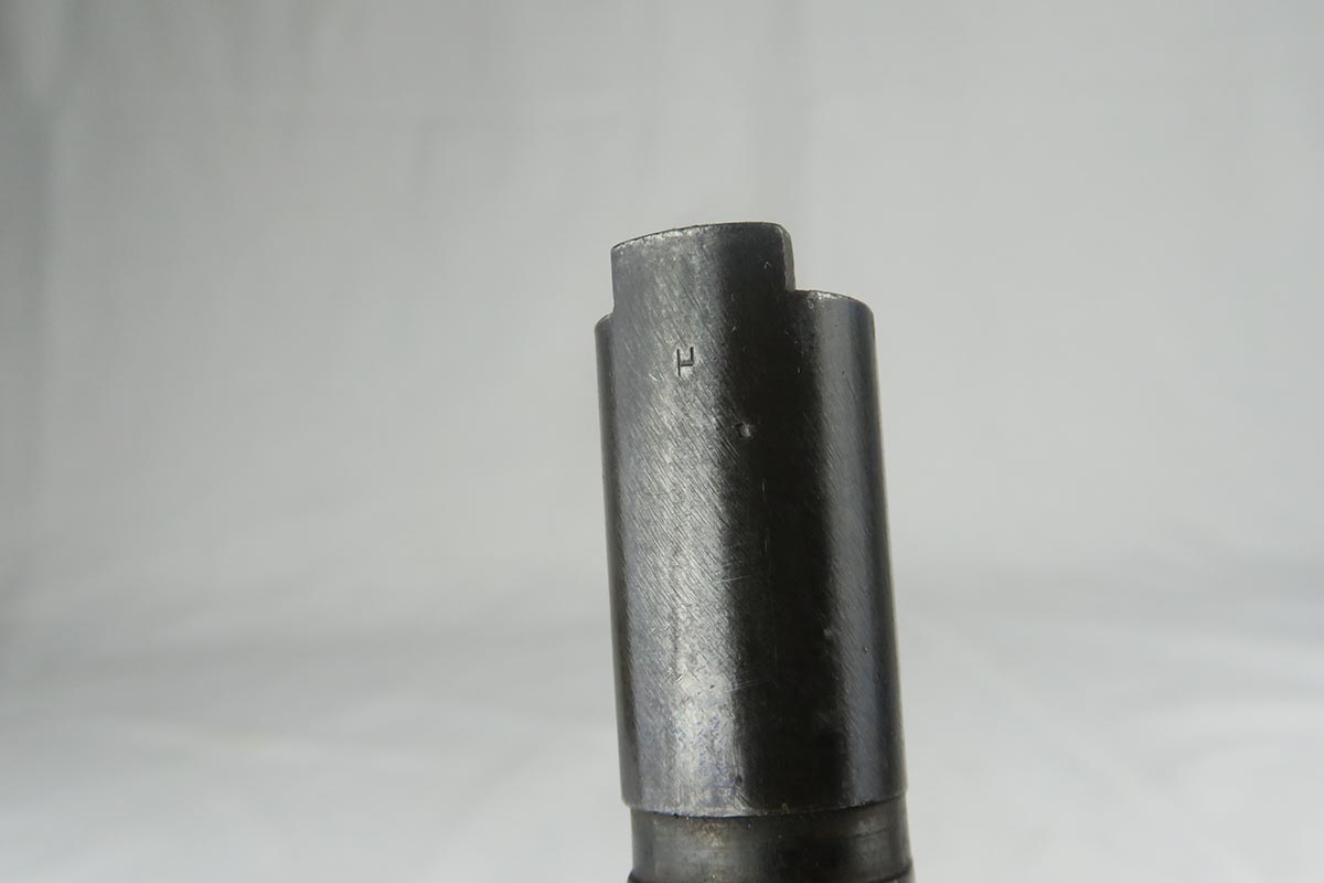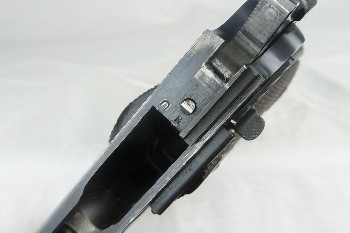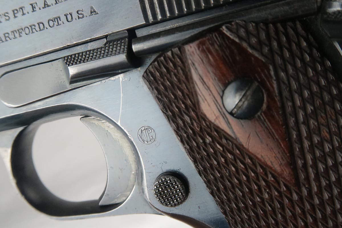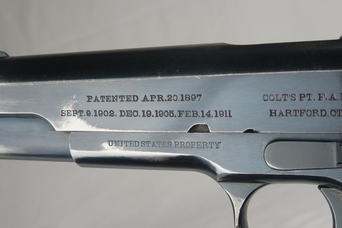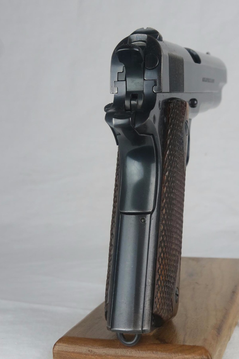 11/14/17 – This is a very hard to find Colt 1911 from early 1913. Production began in 1912 and with the serial in the 22xxx range, this obviously makes it one of the first 25k made. The early parts are very hard to find so I will go over the main parts to insure that this gun is all original. The slide is early logo, and correctly missing the 1913 patent marking. The rear site is rounded. The inspector proof on the frame is also correct – WGP. The top of the frame (inside) is marked H and U. The grips appear to be correct and original. The barrel is H P marked on top, but the P is a poor strike. This would be a type 3 barrel which my source says started around serial 25xxx, so the barrel could be a replacement, although early. The finish is original and the bore is cloudy with minor corrosion but decent rifling. The magazine is also the early two-tone but lacks the loop at the bottom, so like the barrel, could be a later replacement. Overall, a fine example of one of the earliest US Army issued 1911 Colts.
