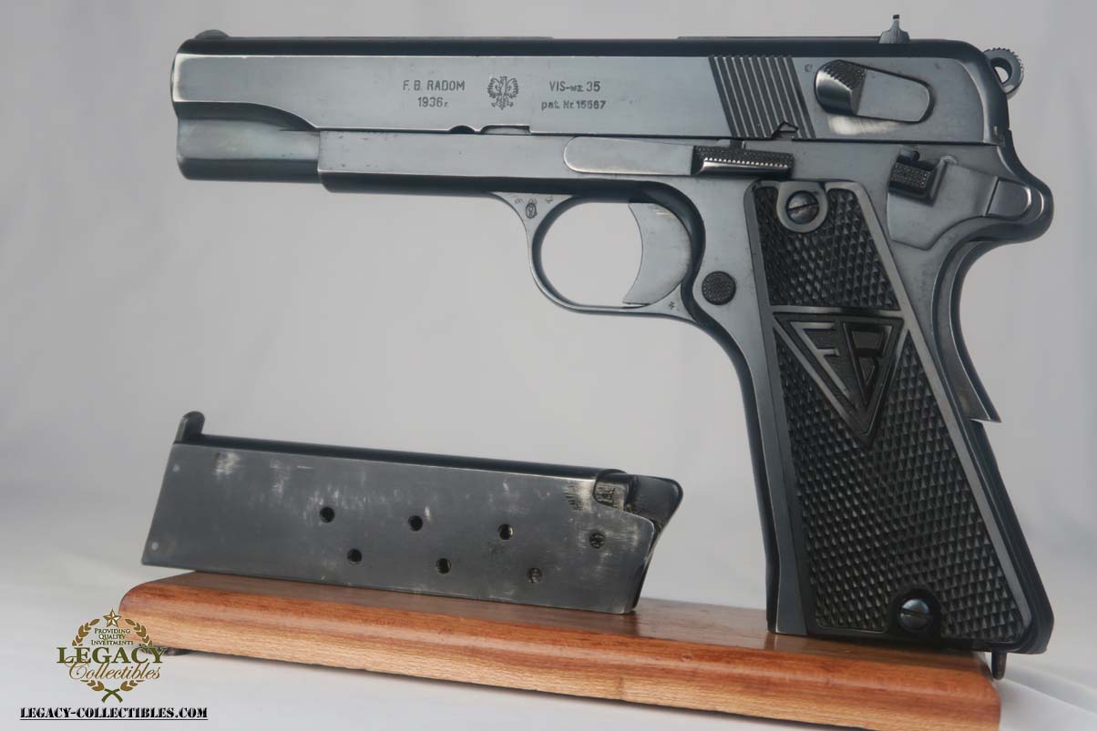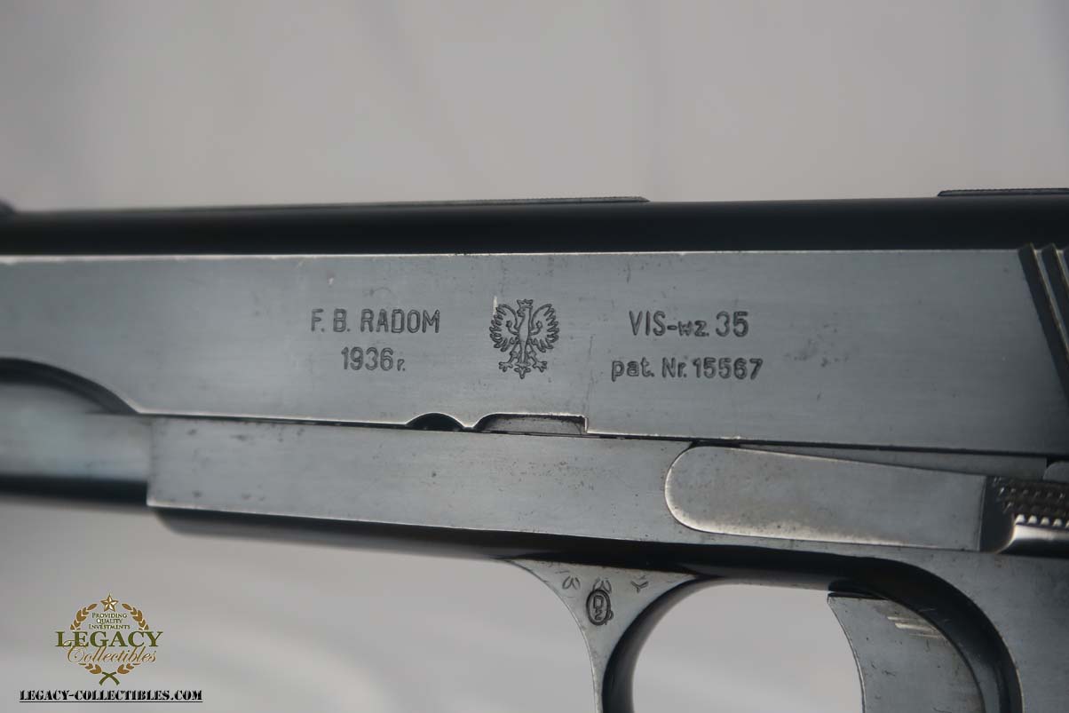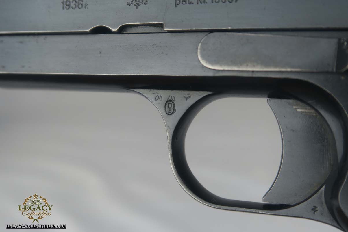 5/23/17 – In 95-96% original condition, we have a top example of a very early, 1936 dated Polish Eagle Radom pistol.  This first year of production pistol is all matching and 100% factory original.  The slide is beautiful, but there are two noticeable spots of wear – one on the trigger guard, one on the front strap.  This is a fairly early 1936 pistol, and it bears unique early features such as the rounded rear sight.  With the serial range for these pistols being 01-05500, this is one of the first 2,000 Radom vis 35’s ever manufactured.  The vis 35 was one o the most elegant pistols of the era and has reached an iconic status with collectors.  This is one of the prettiest examples that we have seen and for it to have survived the entirety of WW2 in such fine condition is almost unheard of.  The bore is in similarly excellent condition. If you are looking for a top example of this legendary Polish-made firearm, then this is for you.
