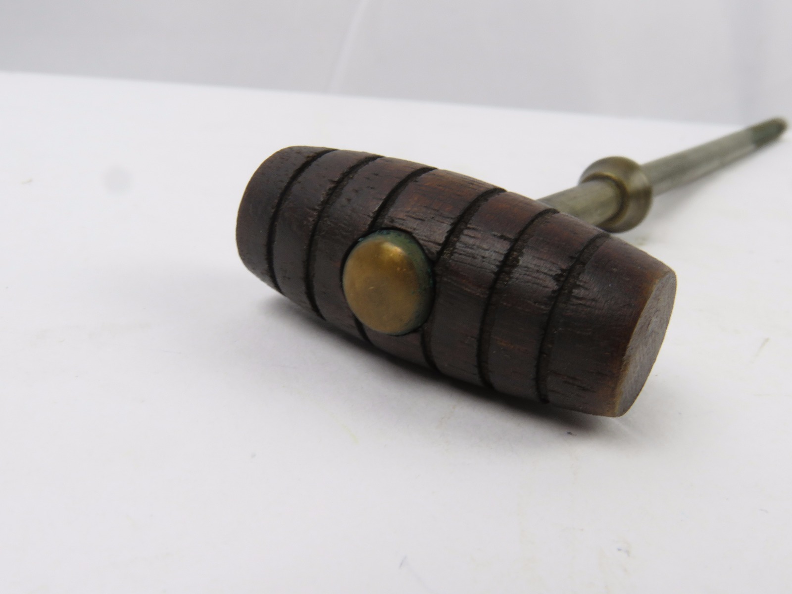 9/14/17 – This is a rare style Luger cleaning rod from WW2. The rod is all original with a wooden handle that rotates on an interior ball around the brass rod body. The wood is original and excellent with no chips or cracks. The rod is excellent as well. There is a small “stopper” on the rod that was used to prevent the user from pushing the rod too far through the barrel. The length is perfect for a Luger. I believe this stopper style was used for Police. Guaranteed original and authentic.