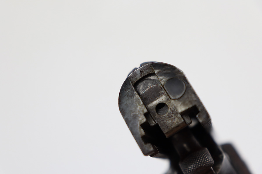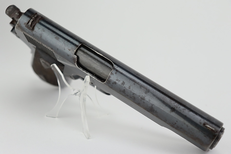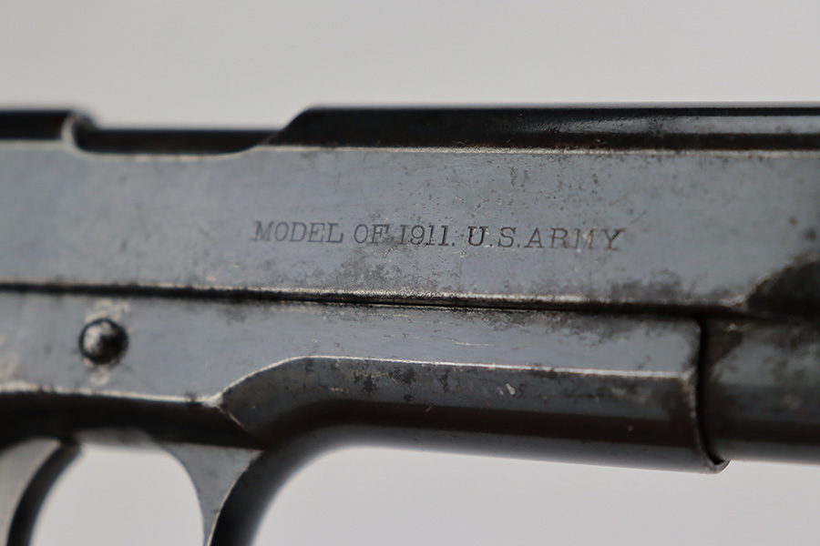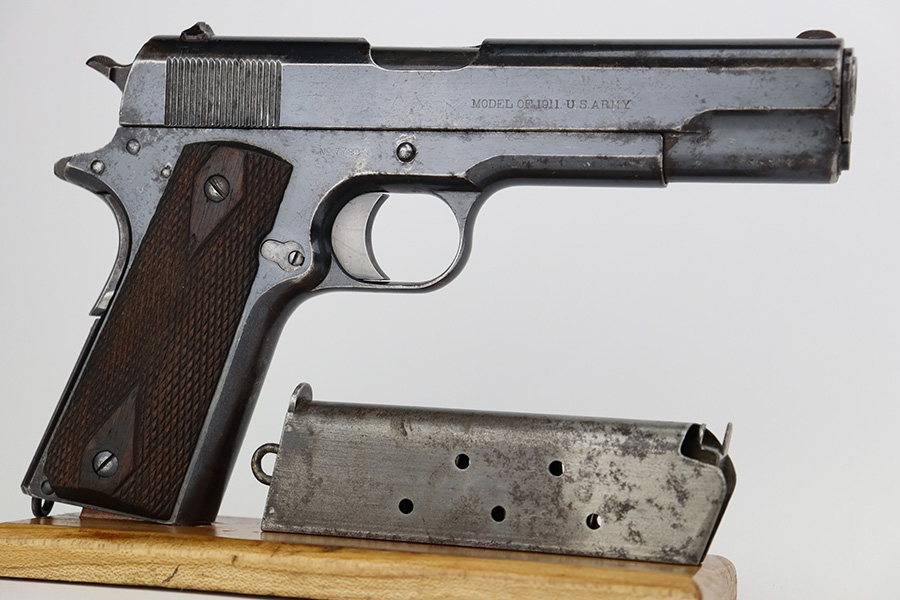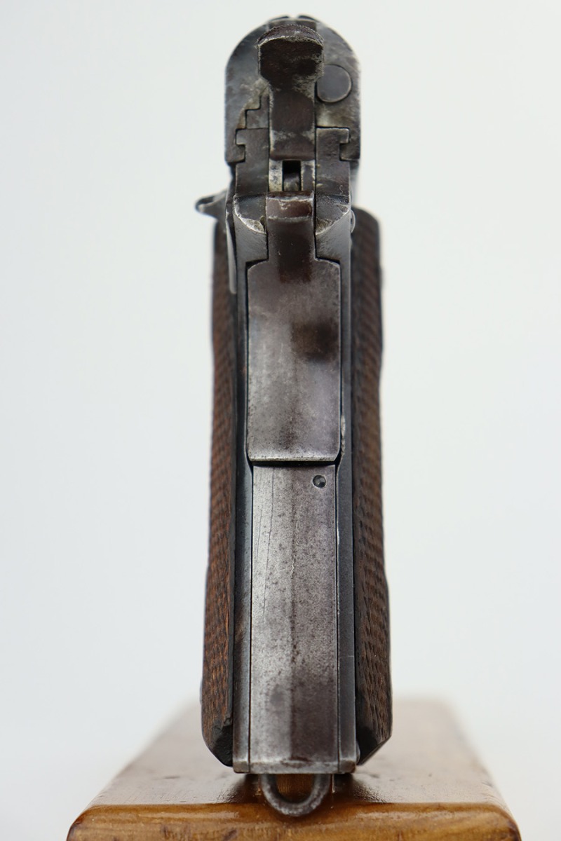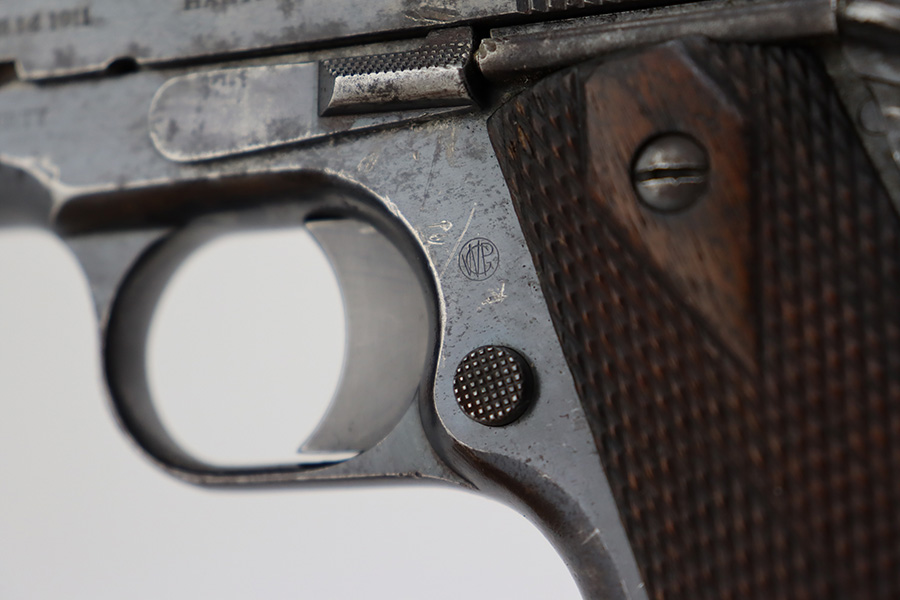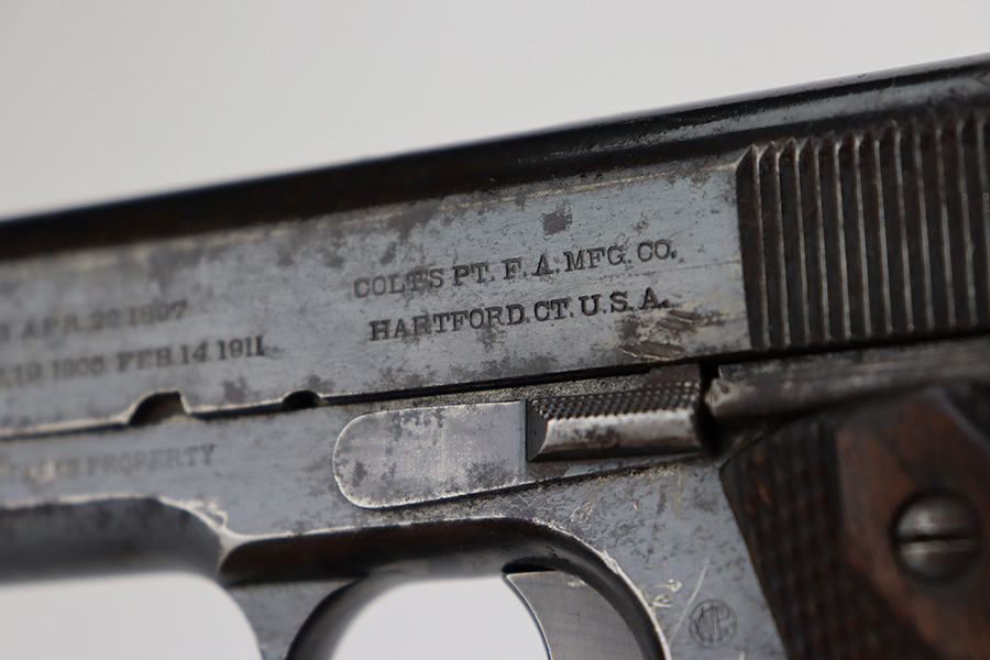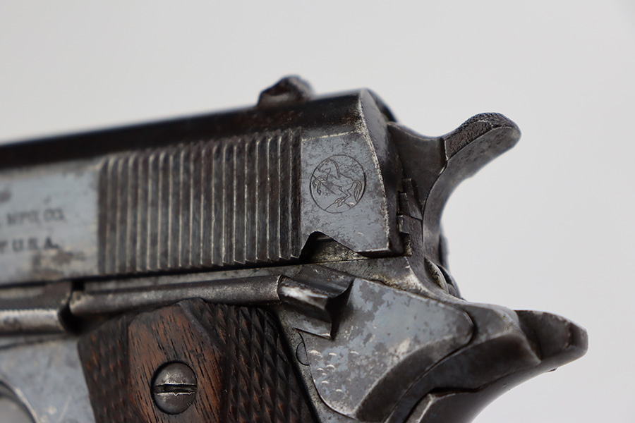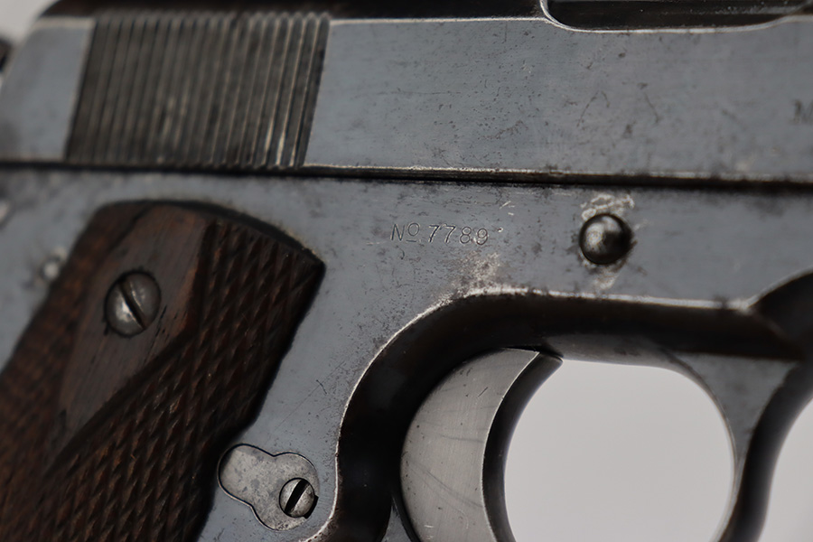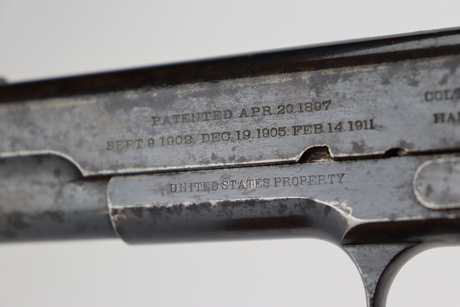 7/6/23 – This is a super early and rare Colt M1911 from 1912. This one features the early patent date slide with WGP inspector’s mark and serial number in the first 8,000 produced. Slide is marked with an ‘H’ at the rear, and early barrel has a vertical ‘H’ on the hood. The bluing on the pistol doesn’t show that much actual finish loss aside from the grip safety/mainspring, but there is surface rust/corrosion in several areas. Early recoil plug with inward pinch but this pistol has the wrong barrel bushing so the plug doesn’t sit flush inside the bushing. The left side of the frame is roll stamped with the small “UNITED STATES PROPERTY” adopted at serial number 104. The “WPG” final inspection monogram of Ordnance Inspector Major Walter J. Penfield is stamped on the left side of the frame above the magazine release. Early keyhole magazine has worn finish. Excellent bore. The wood grips are a bit later but WW1 original and have only minor handling wear.