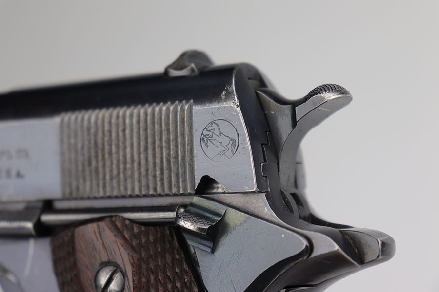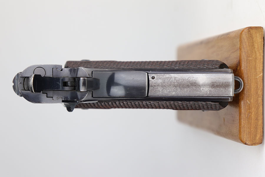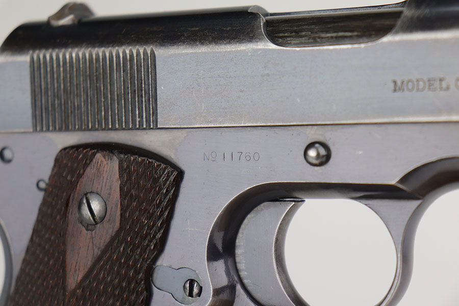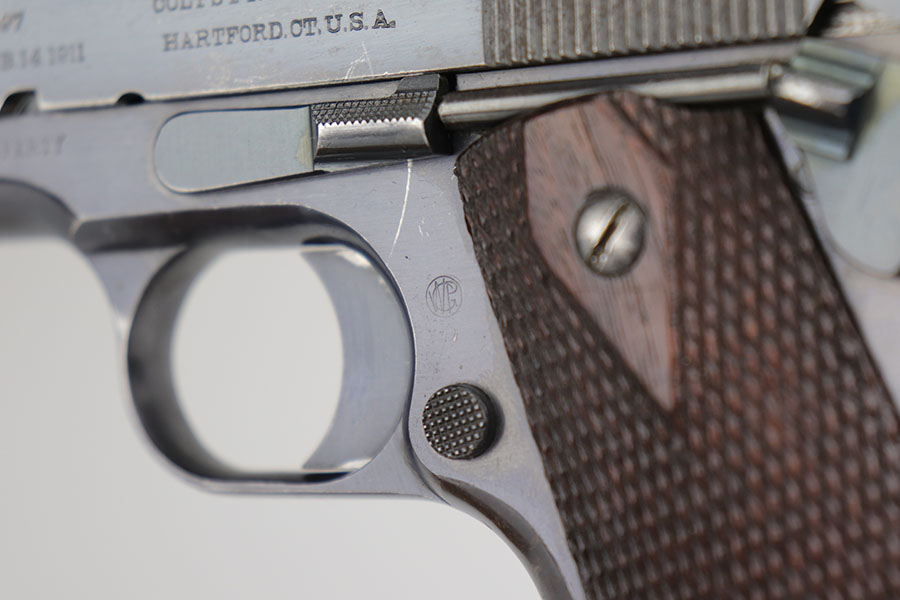 12/16/20 – This is a very rare and highly desirable Colt Model 1911 that was manufactured in 1912. It’s all original and correct, and was previously authenticated by Scott Gahimer. The Colt oven blue finish is in great shape overall, with a very nice profile view. That vast majority of the bluing loss is on the front strap and main spring housing. The pistol is one of only 17,250 produced and shipped in 1912. Receiver and slide “H” proofs match perfectly. Original Colt non-serif H barrel. Rare and correct keyhole magazine. Other early features include the rounded rear sight, rectangular punched recoil spring plug, early recoil spring guide, short heavy hammer, type 1 thumb safety, 15 row double diamond grips, etc. The frame is marked with a circle WGP proof, indicating final inspection by Major Walter G. Penfield, who was the 1st Army Inspector of Ordnance for the first nine months of 1912. The bore shows some smoothing but it’s clean overall and has no pitting. Just a fine, correct example of a pistol most Colt collectors search years for.