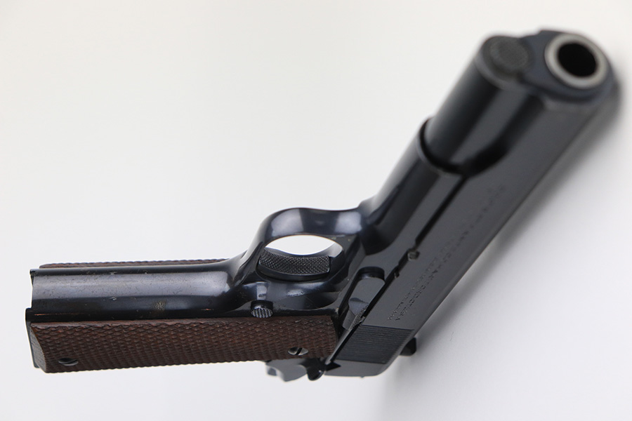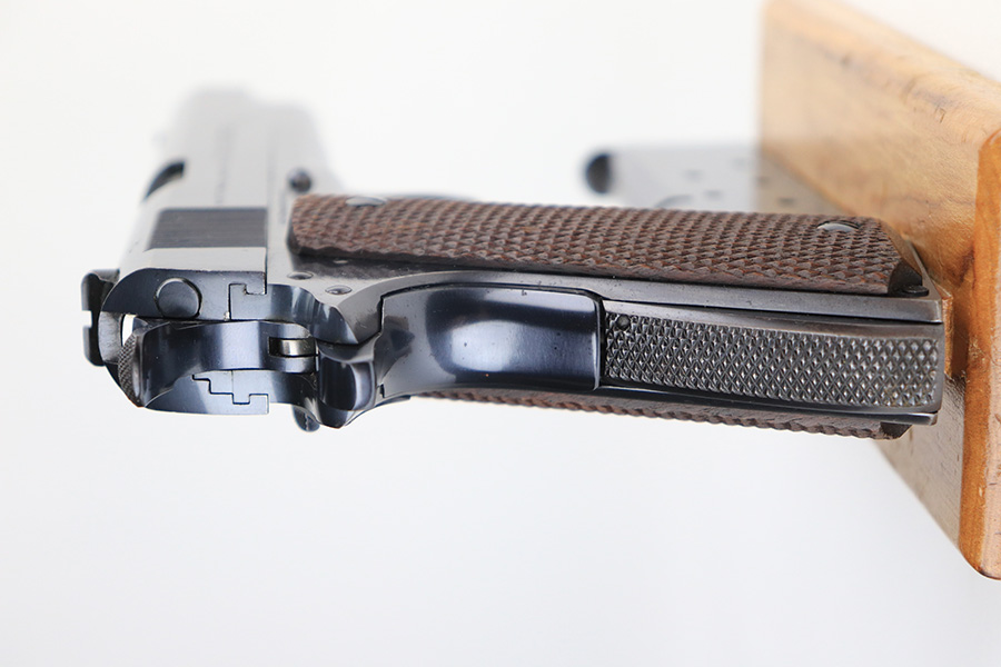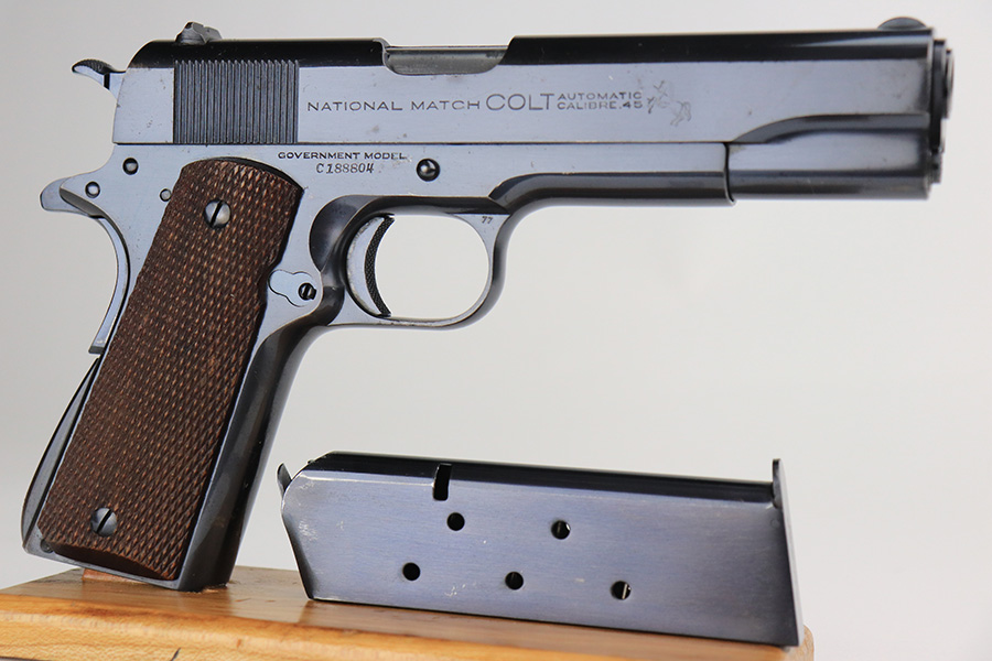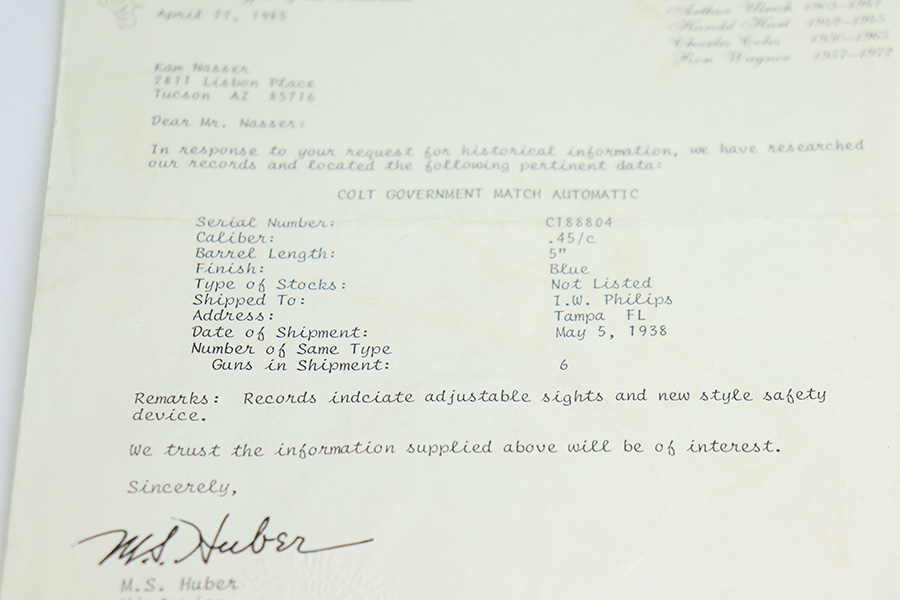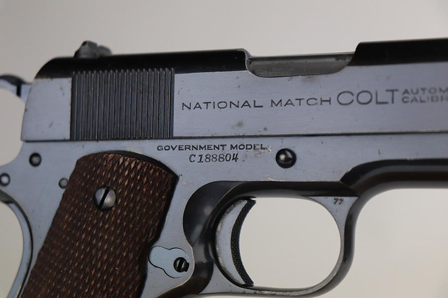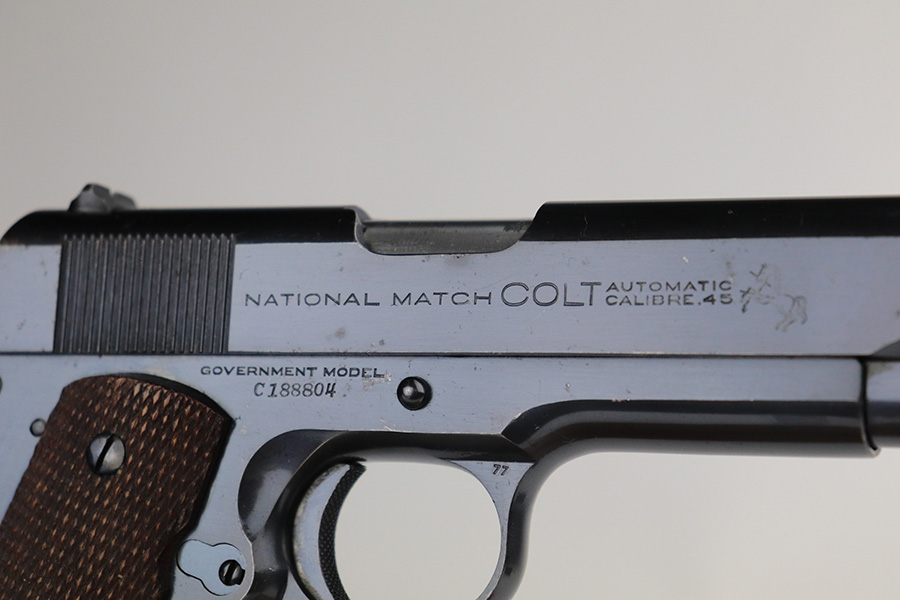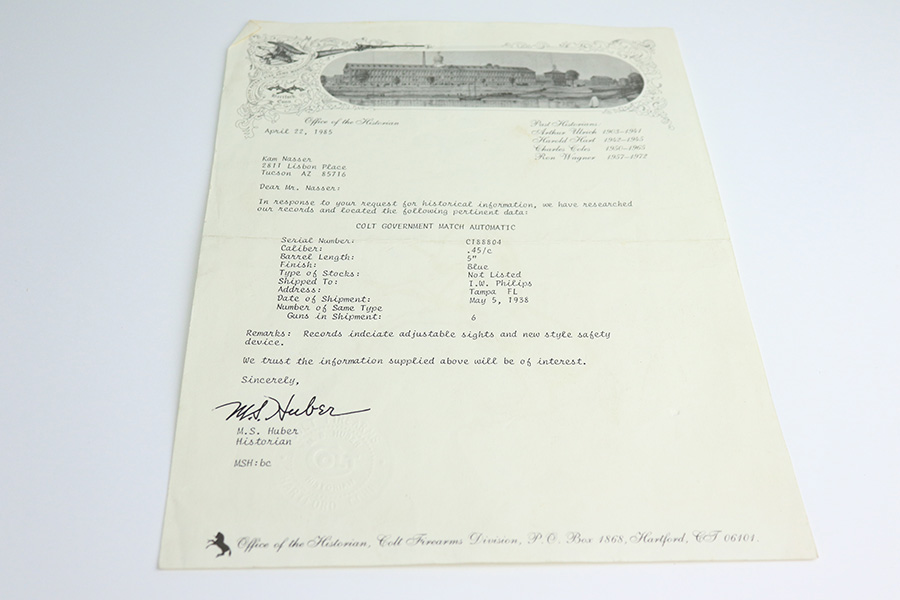 12/10/21 – This is a terrific example of a rare, early Colt National Match that was made in 1938 and is equipped with the Swartz safety device. The original blue rates at about 97% with a few minor hints of wear on the front strap, and a couple of small dings there, as well. There’s hardly any bluing loss otherwise, just a bit of edge wear on the slide, and a little bit of discoloration along the top of the slide. Proper National Match barrel that’s marked MB in a circle on the side. Mint bore and grips. Slide is properly matching to the frame. Blued Colt magazine that is marked ‘COLT .45 AUTO’ on the base. Swartz safety installation is confirmed by an accompanying Colt archive letter that states the pistol was shipped to Tampa in 1938.