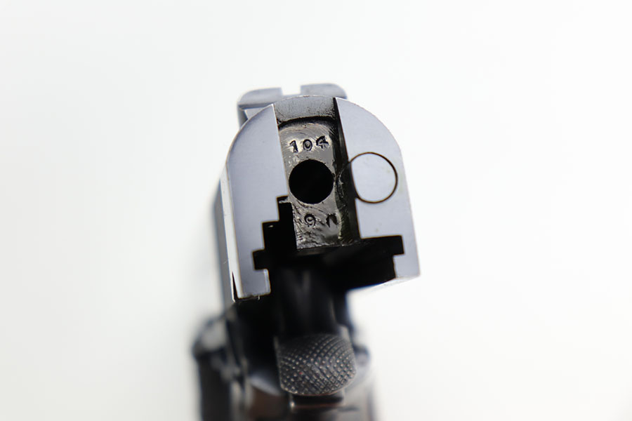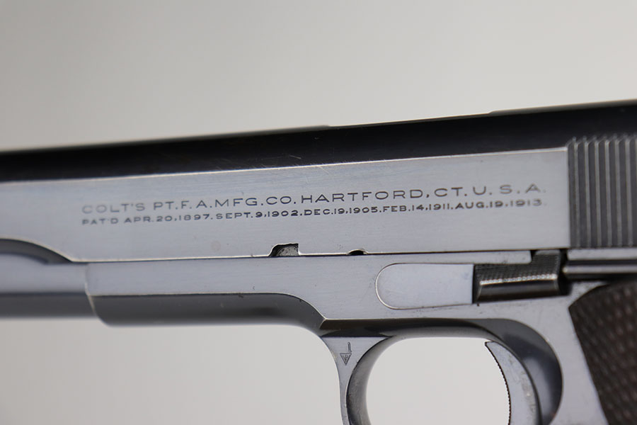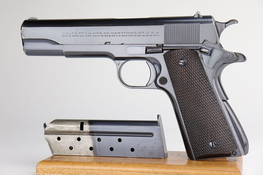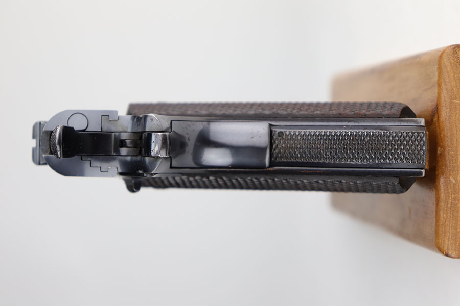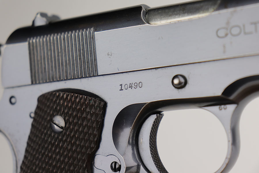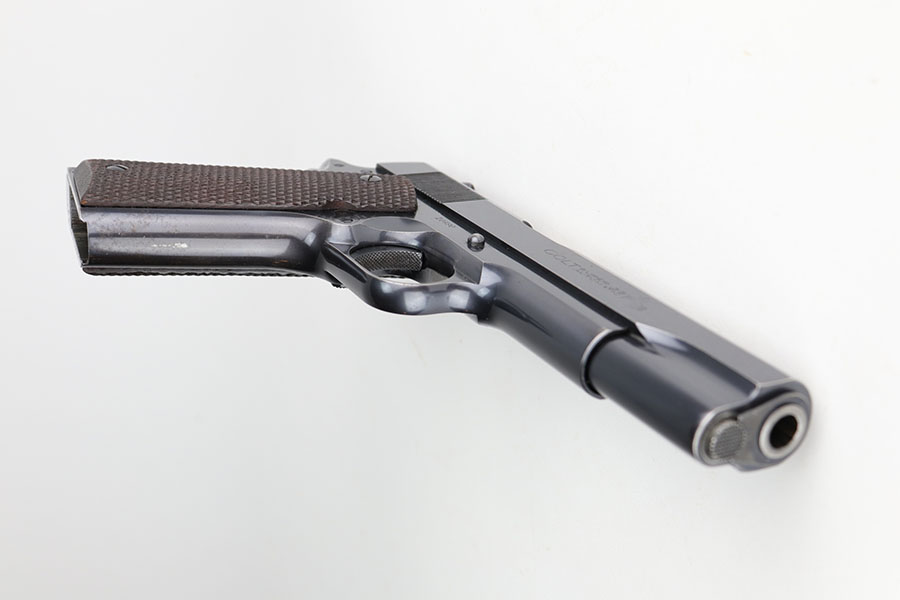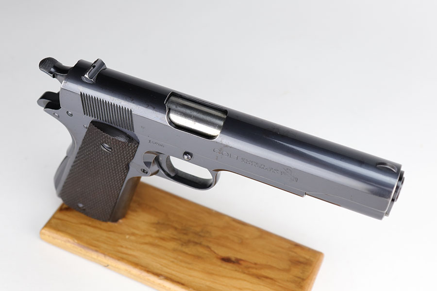 12/4/20 – This is an excellent example of a rare and early Colt Super .38 Automatic. This one was made in 1931, third year of production. Taking the tested and proven design of the Colt Government Model and configuring it to fire a high-velocity cartridge with a flat trajectory and impressive muzzle energy, the Super 38 was marketed to law enforcement on the basis of it’s ability to punch through auto bodies and the available body armor of the day. While the introduction of the 357 Magnum revolver stole some of the Super 38’s thunder, the design found a new life in foreign markets where legal restrictions of “military” weapons and ammunition made it one of the best defensive packages available to civilians, and has seen a renaissance with the rise of competitive “Practical” shooting. This particular example has about 94-95% of the lustrous Colt bluing remaining. Most of the finish loss is on the front strap but there is some oxidation on the slide, especially along the top. Minty bore and excellent grips. Comes with a correct two-tone magazine, and a later spare that is marked COLT .38 SUPER AUTO on the bottom and blued throughout. Slide is matching numbered to the frame.